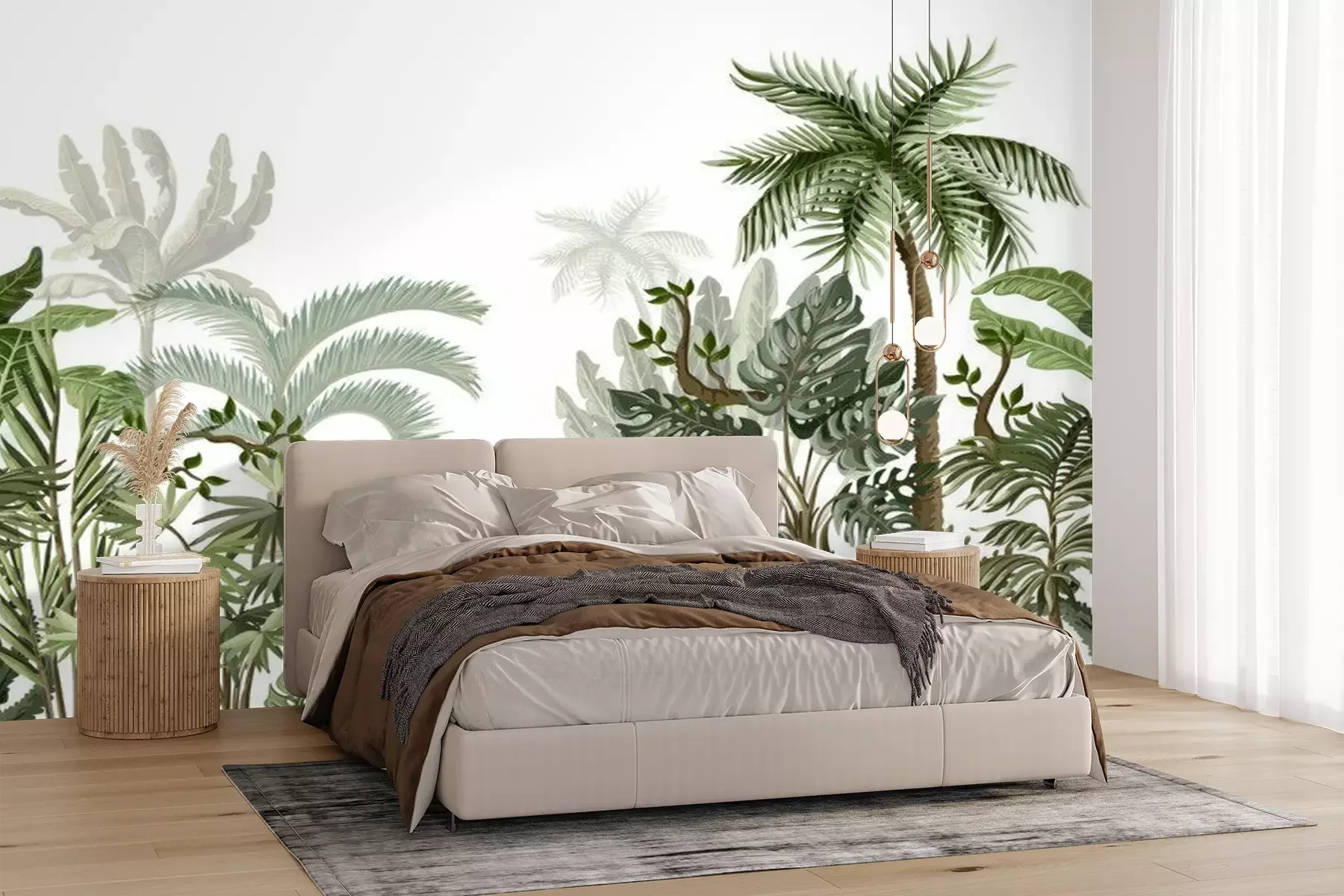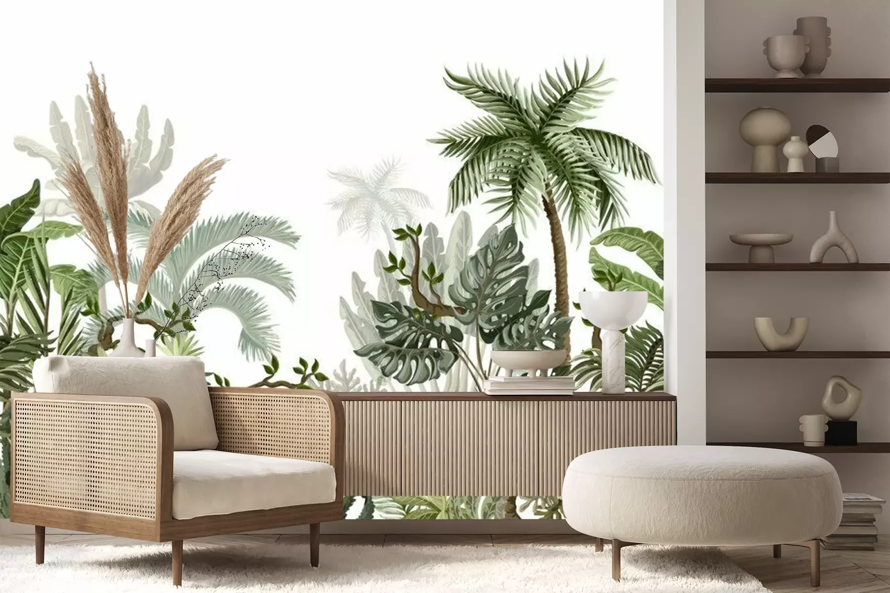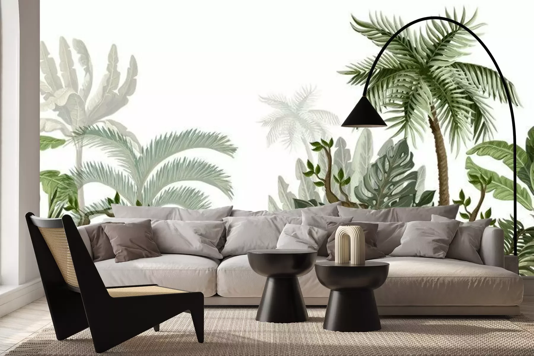 Sticker Seamless border with tropical tree such as palm, banana, monstera. Vector.