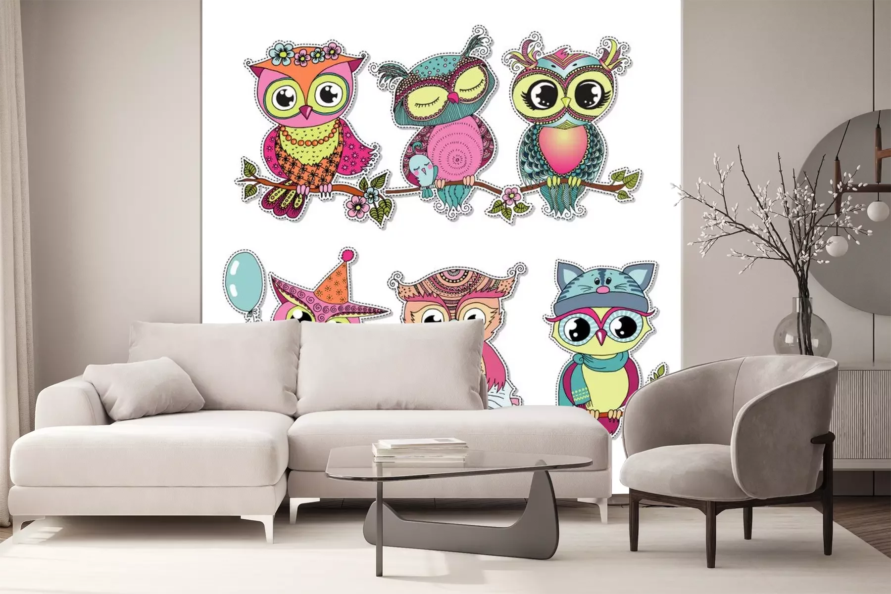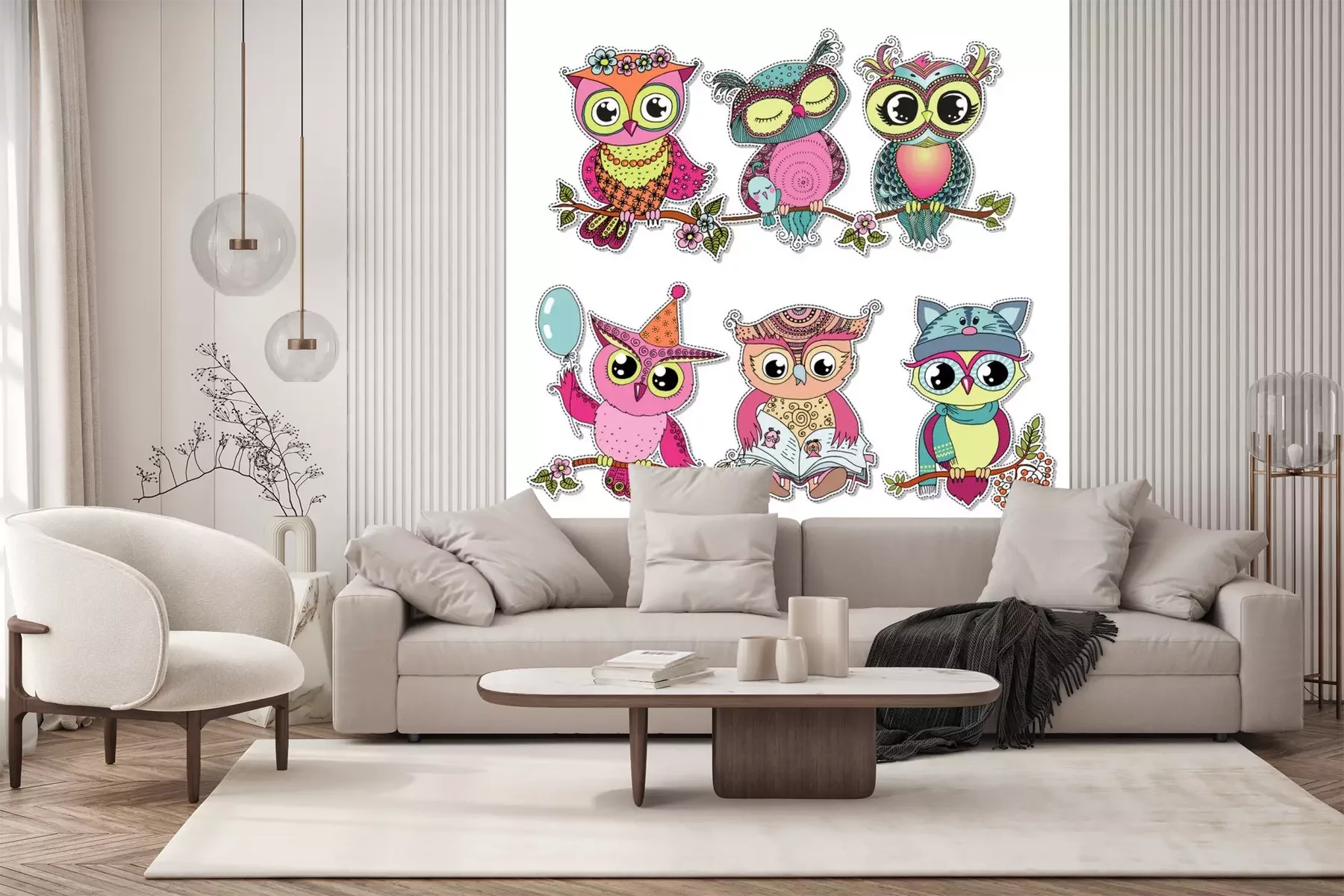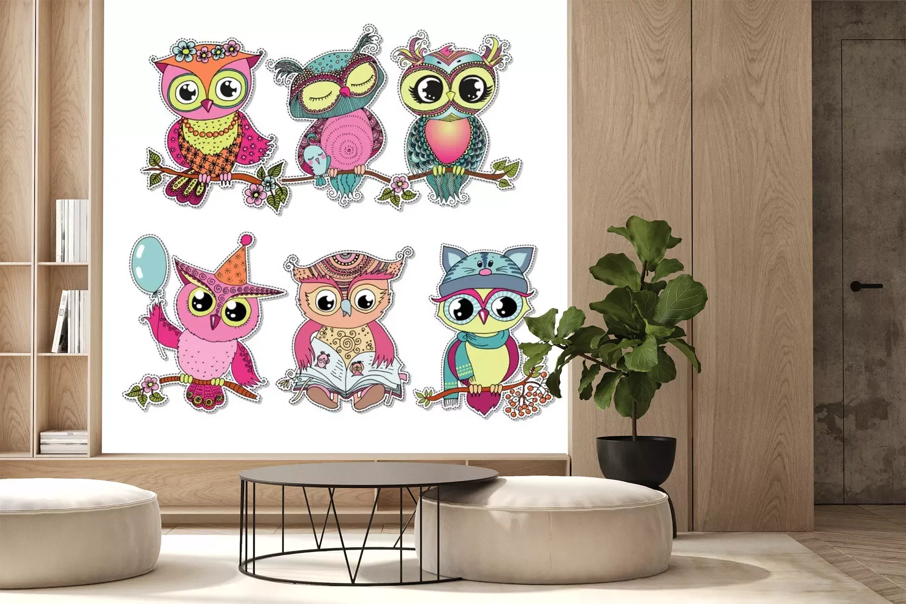 Sticker Sechs niedliche bunte Cartoon-Eulen
