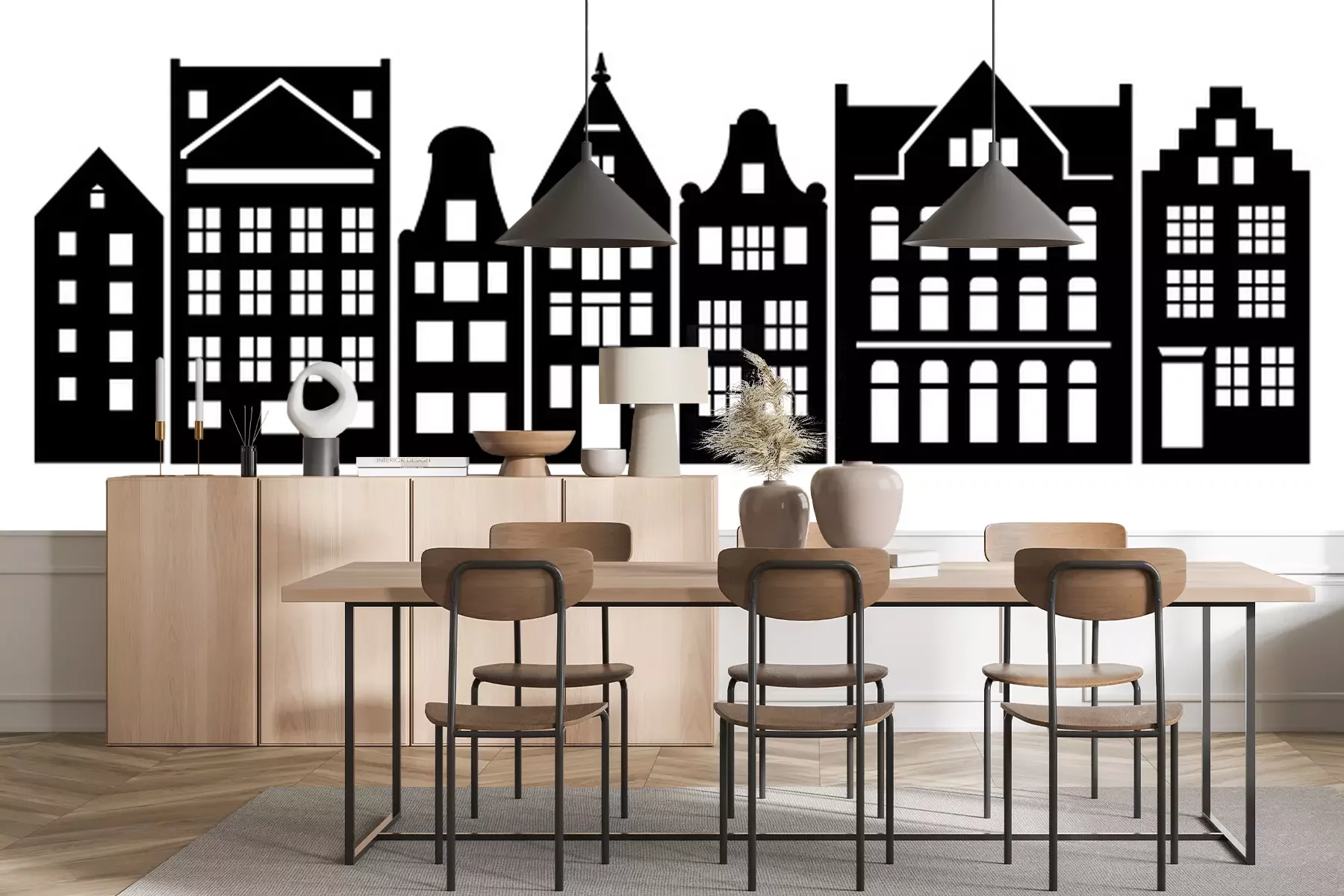Sticker Set of Amsterdam style houses. Laser cut silhouette. Stylized facades of dutch buildings in old European fashion. Wood carving vector template. Urban landscape in black and white. Paper cut, die cut.