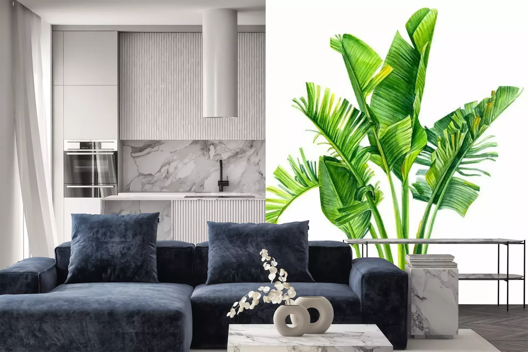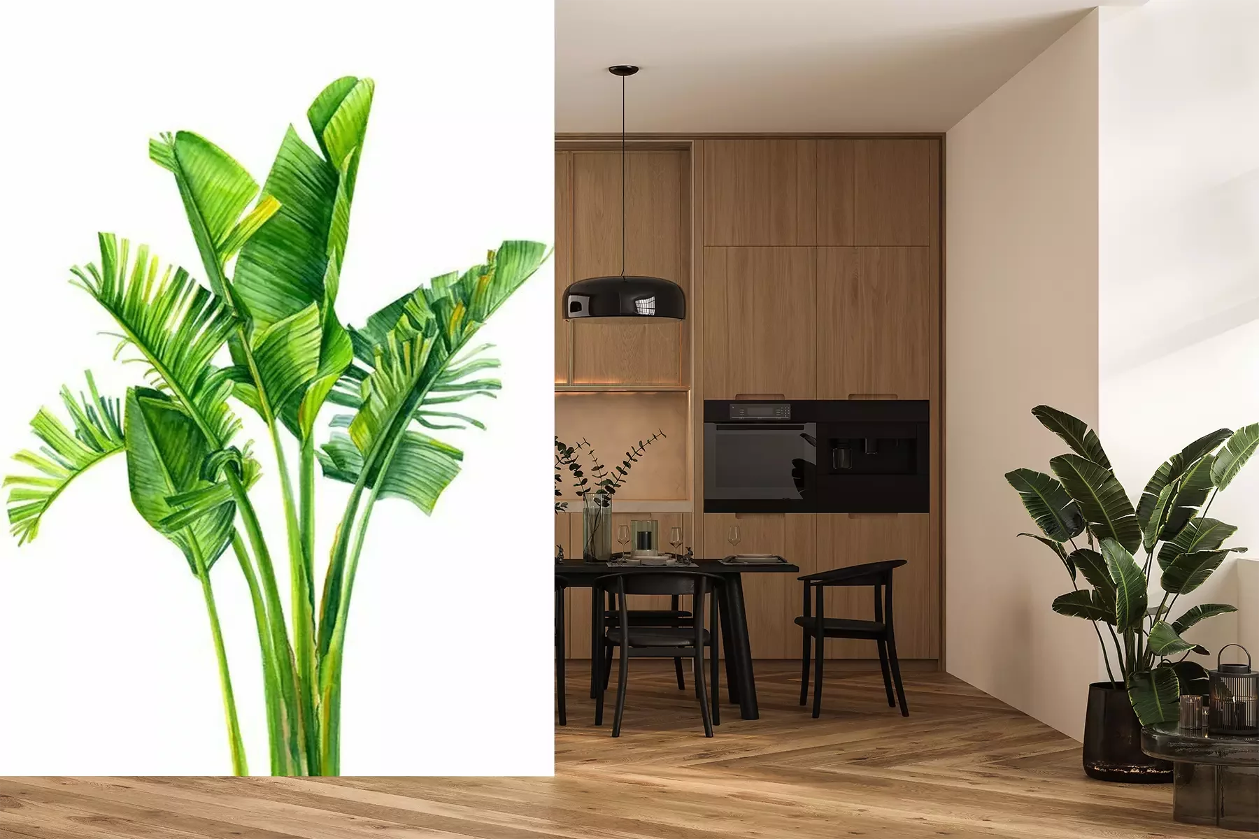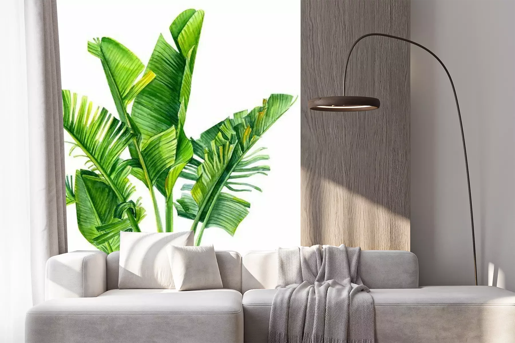 Sticker Set of jungle leaves, strelitzia on an isolated white background, botanical illustration, watercolor tropical plants
