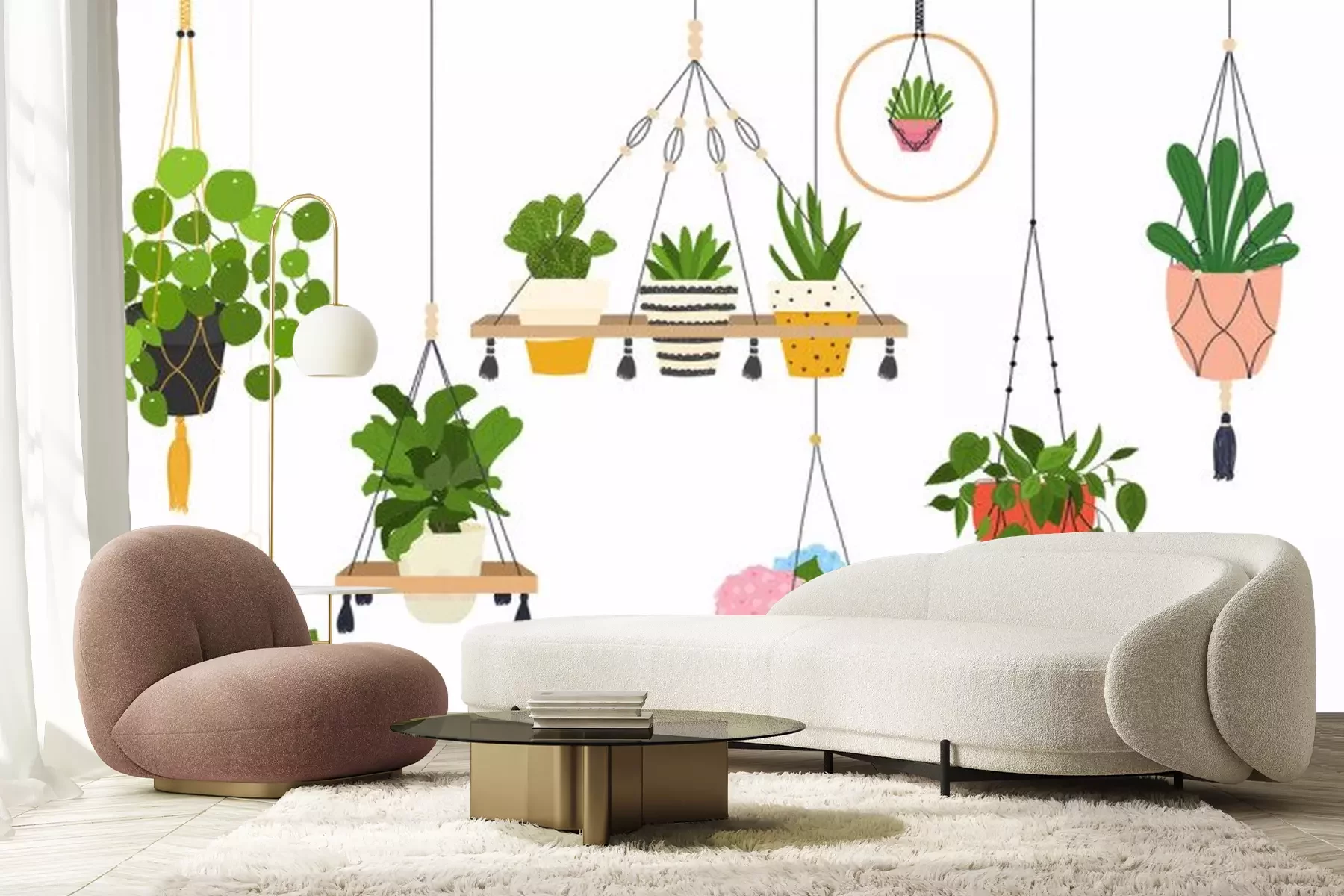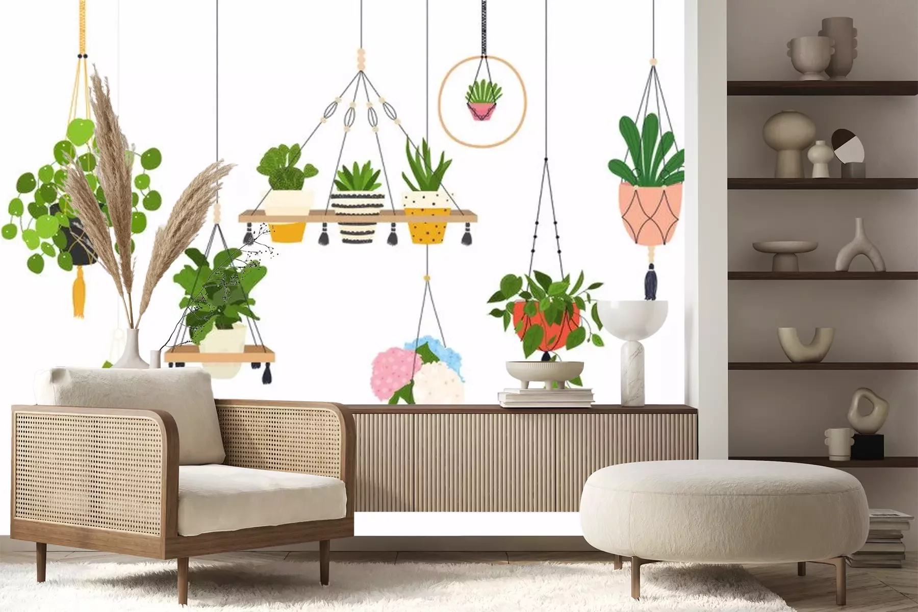 Sticker Set of macrame hangers for plants growing in pots. Flowerpot isolated objects, houseplant flower pot collection.