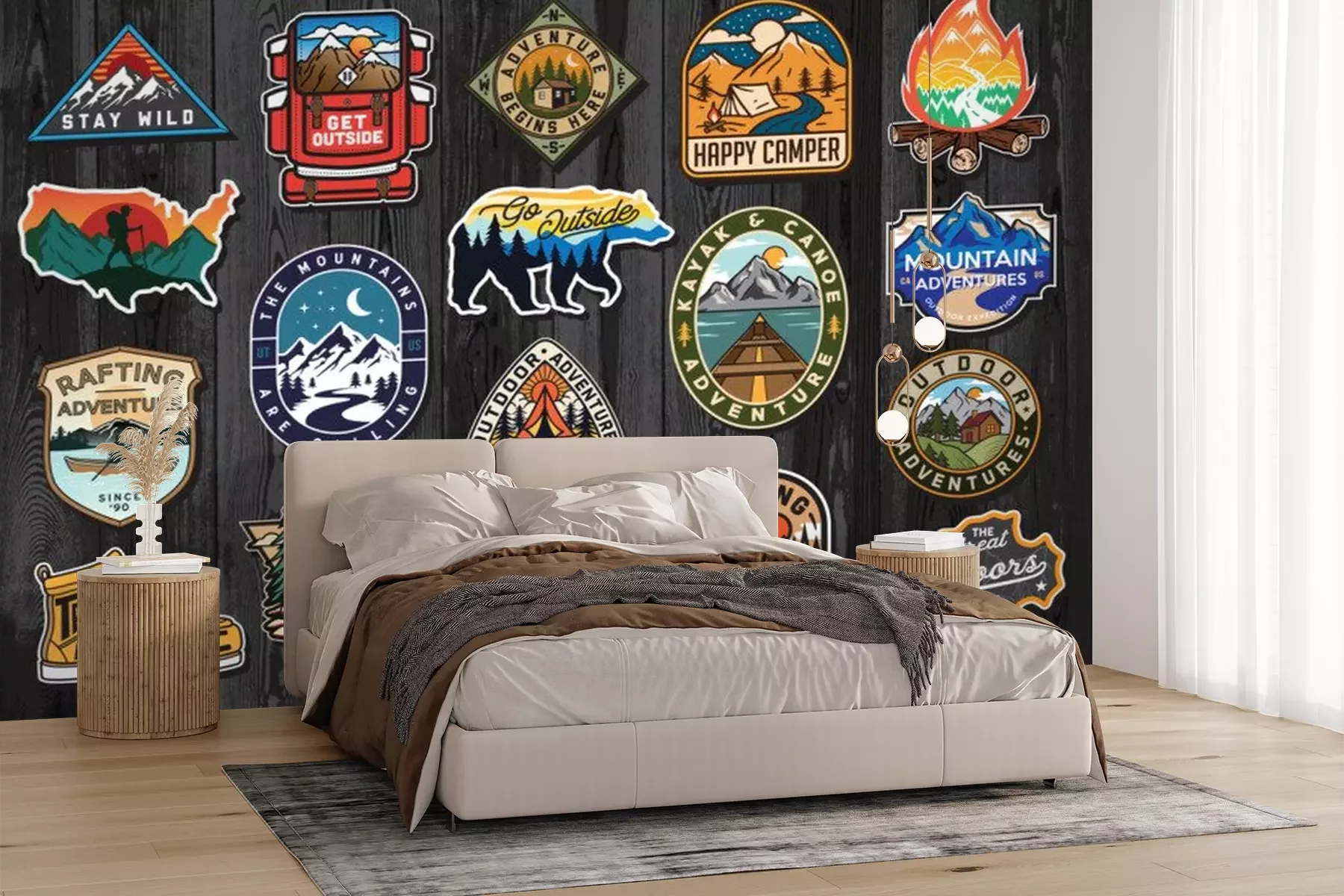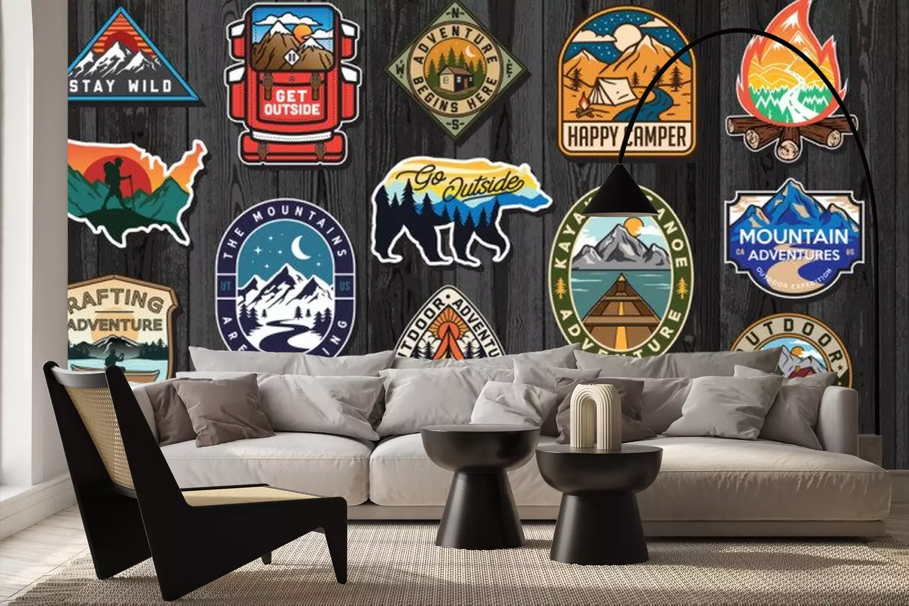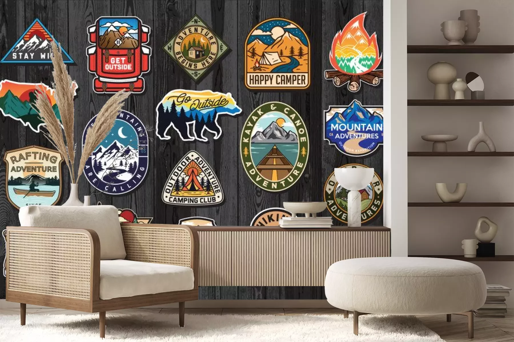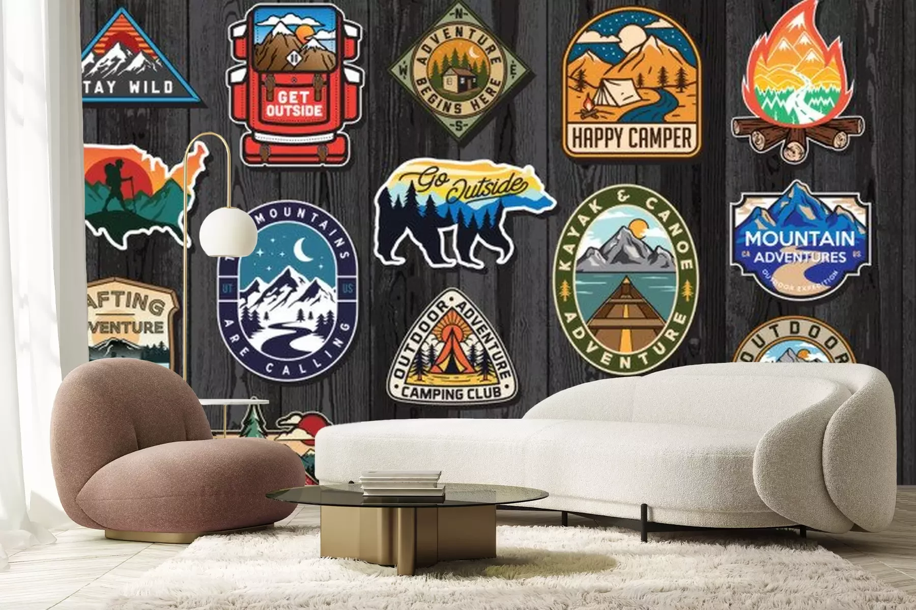 Sticker Set of Vintage Outdoor Summer Camp Logo Patches on Wood board. Hand drawn and vector emblem designs. Great for shirts, stamps, stickers logos and labels.