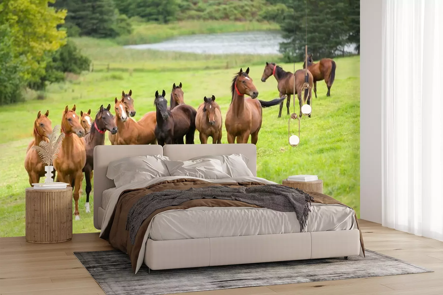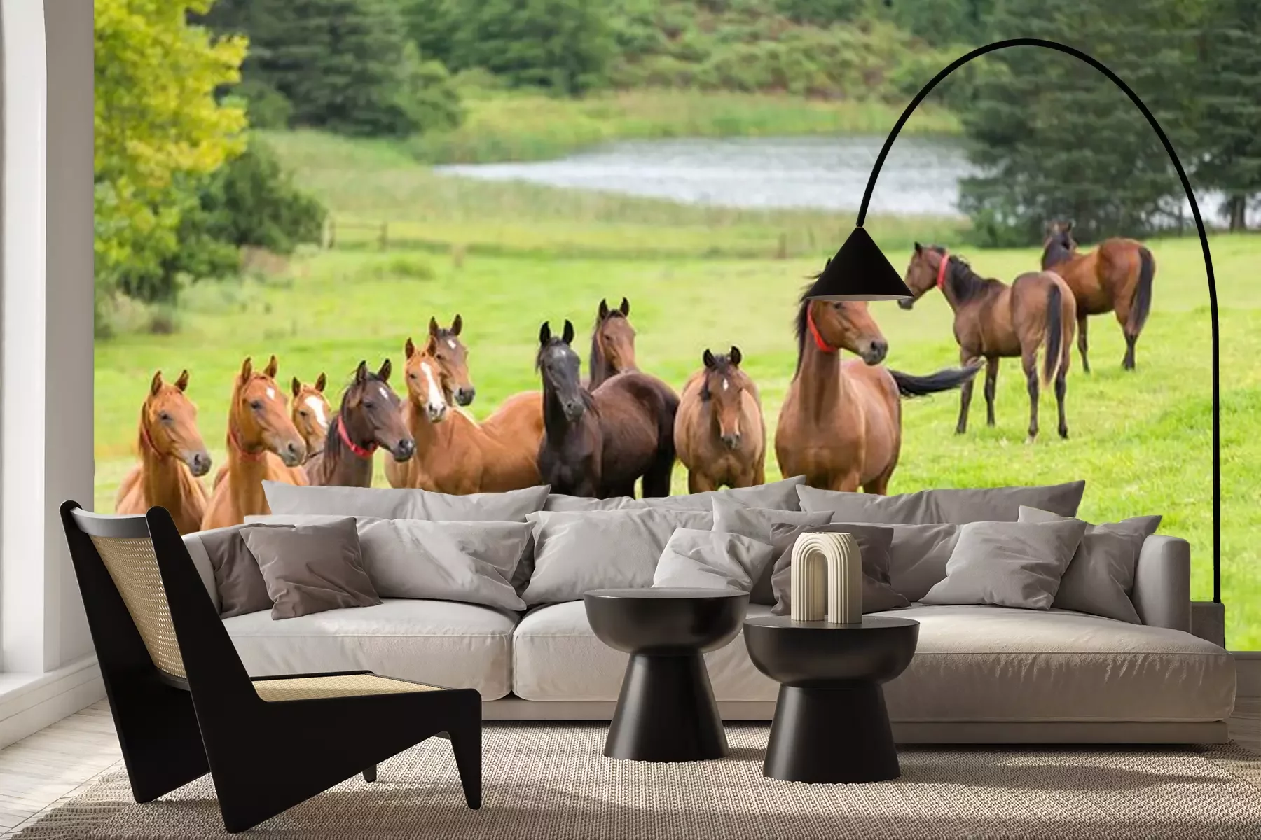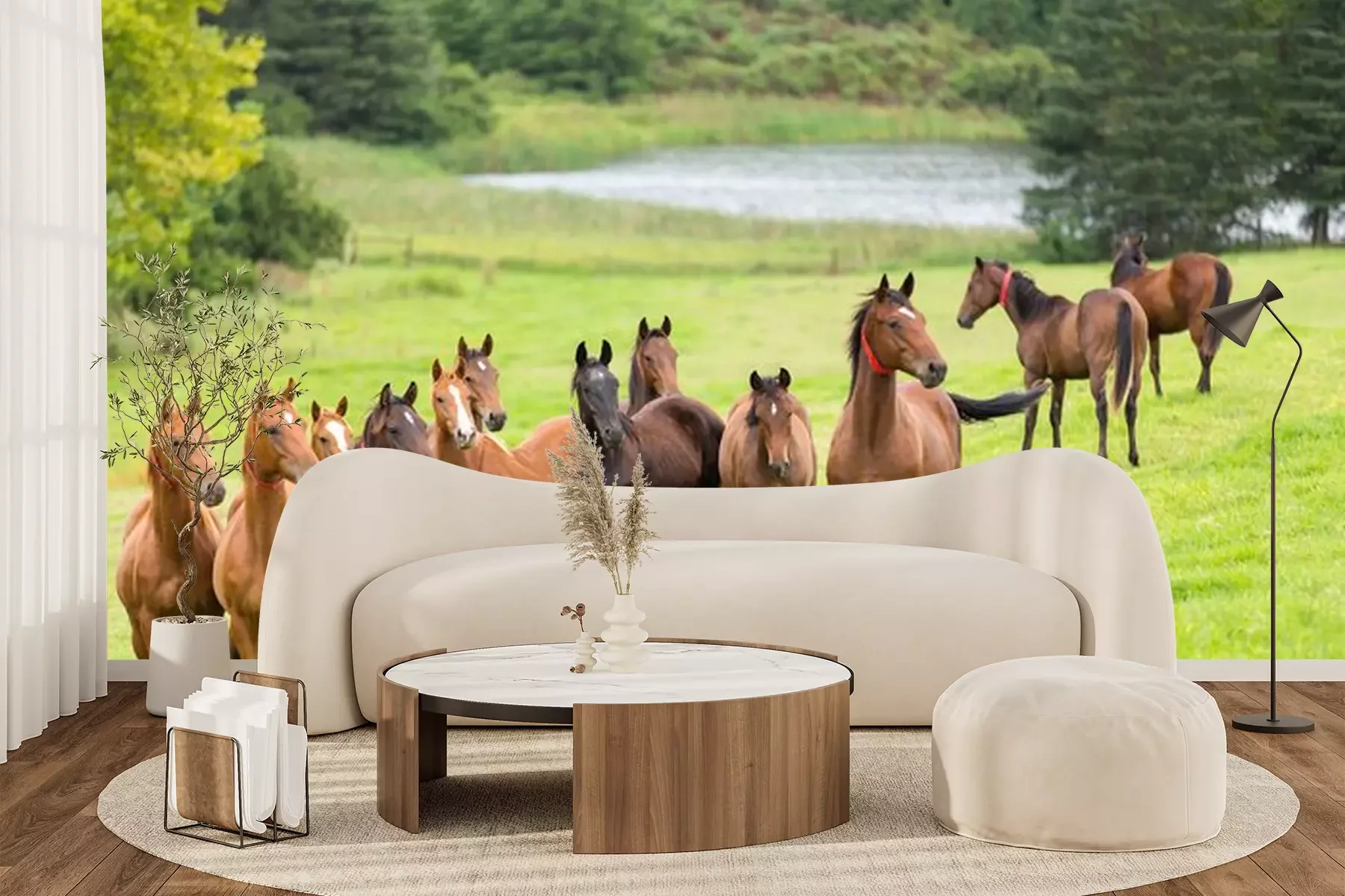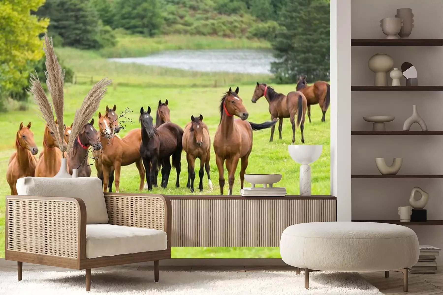 Sticker Silhouetten von braunen Pferden auf einer grünen Lichtung