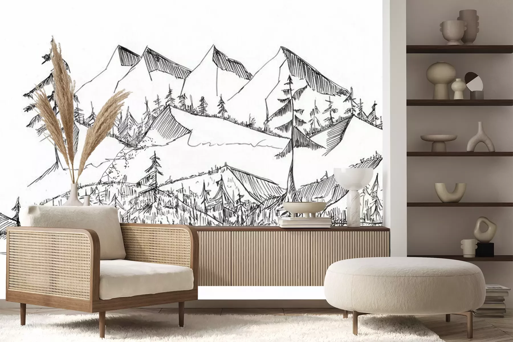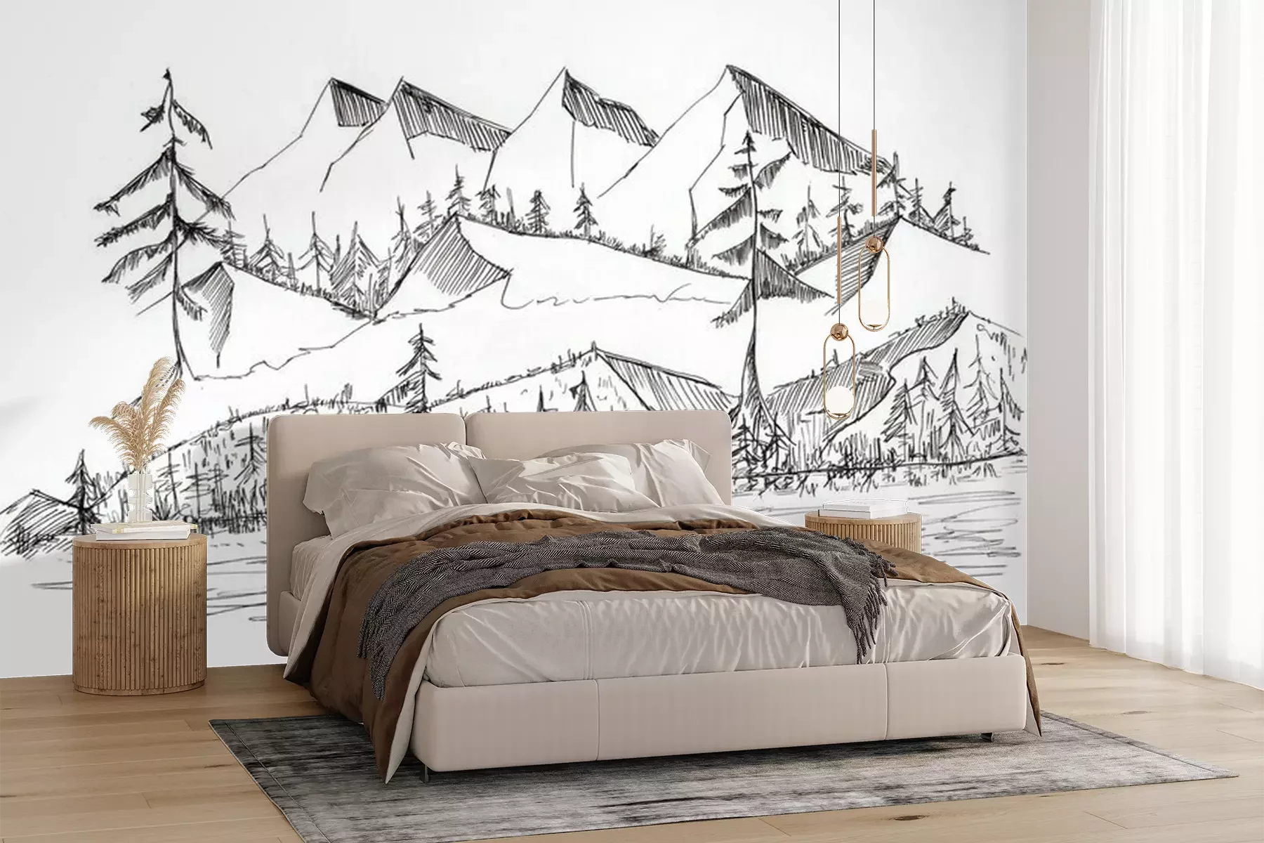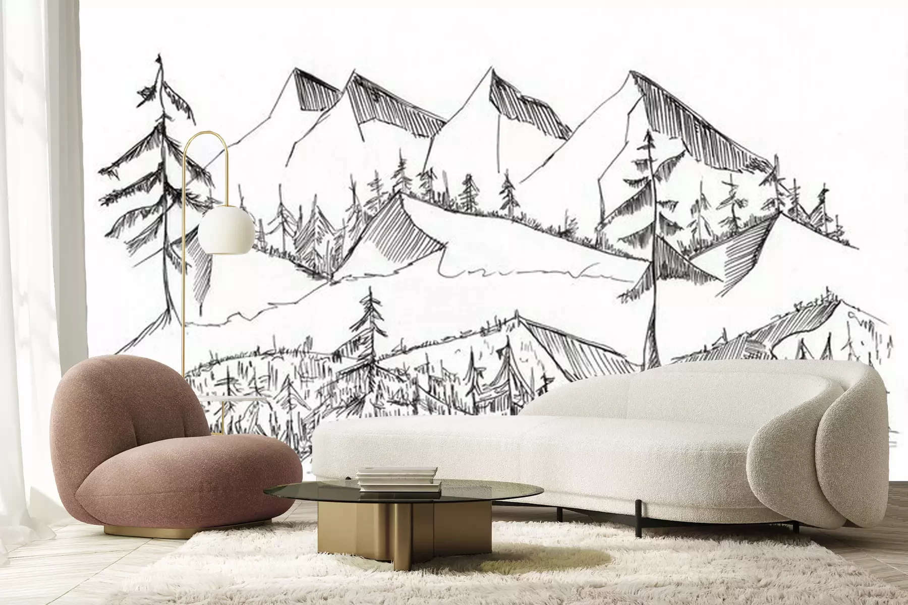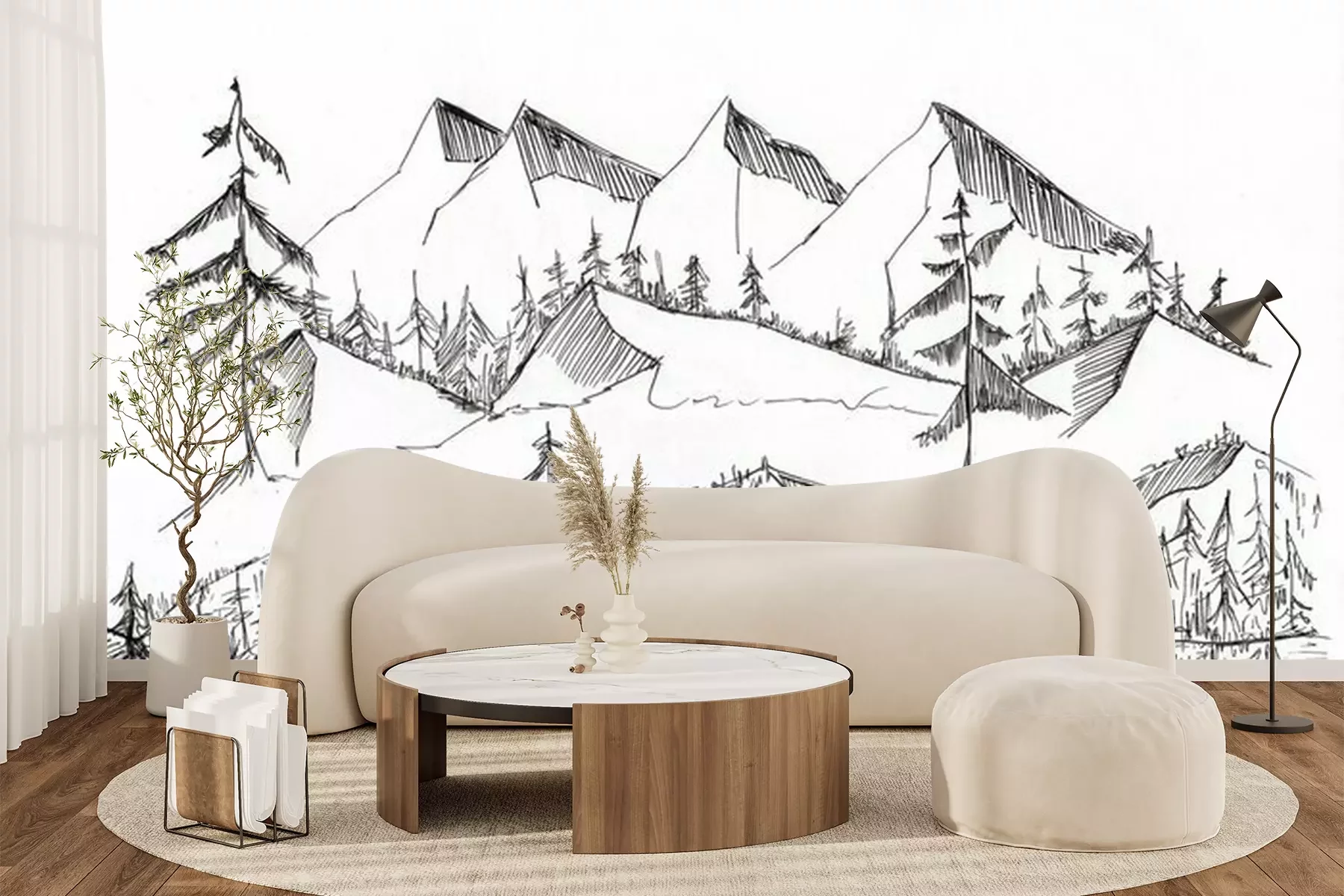 Sticker Sketch of wild Landscape with Mountains Hill and River, hand drawn illustration by Ink