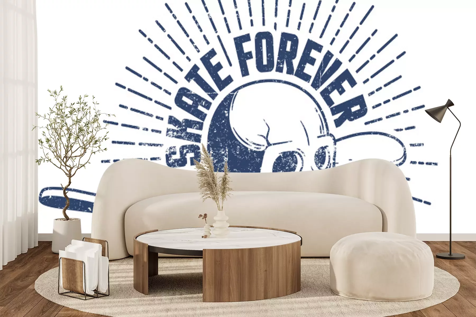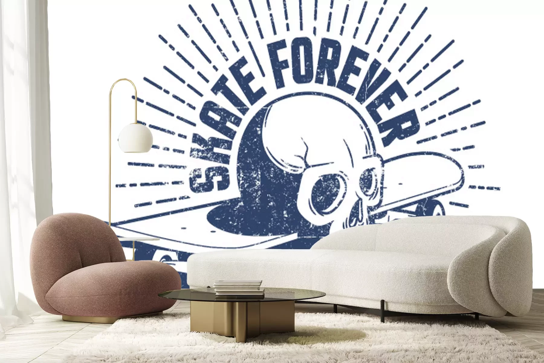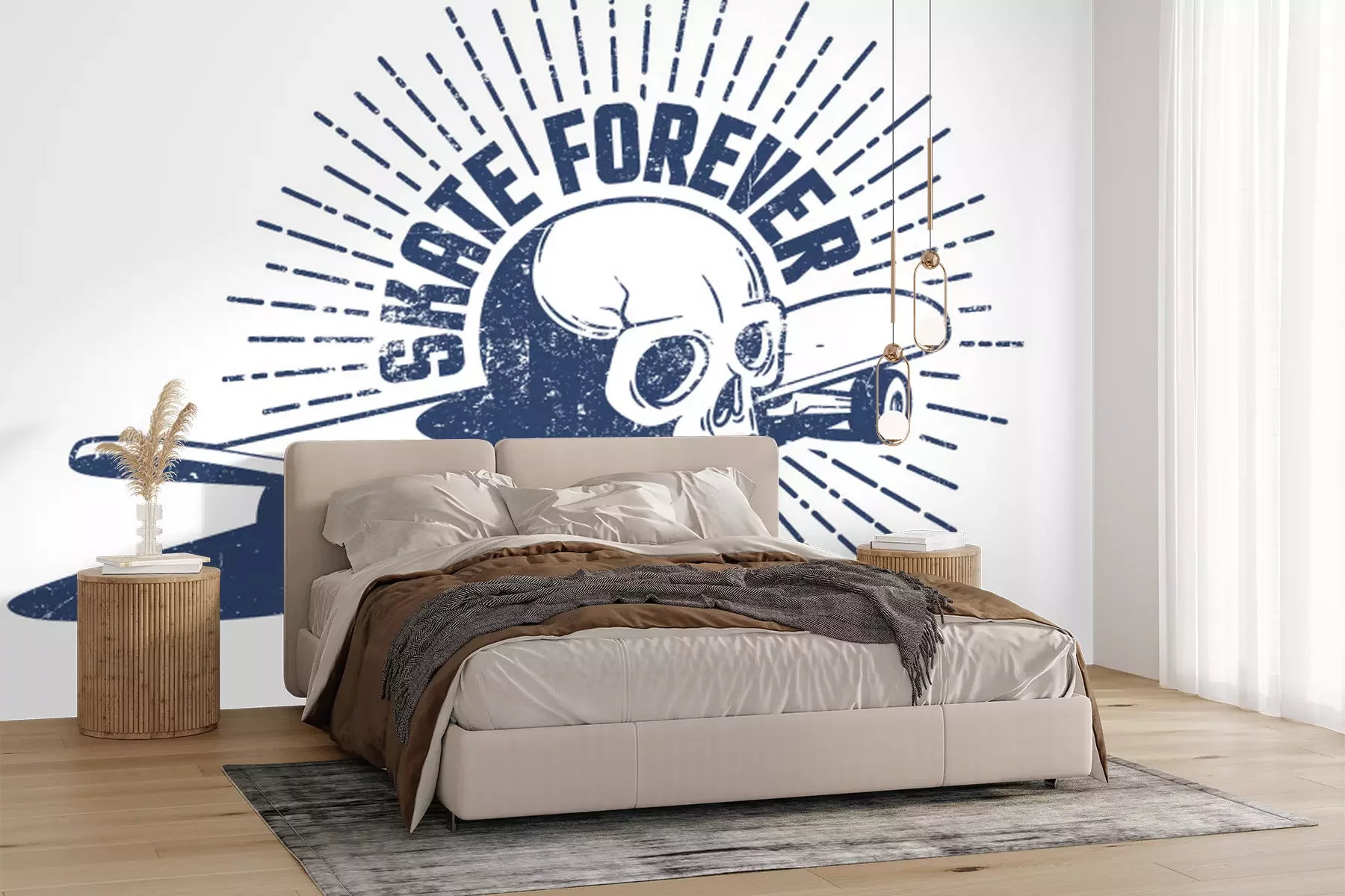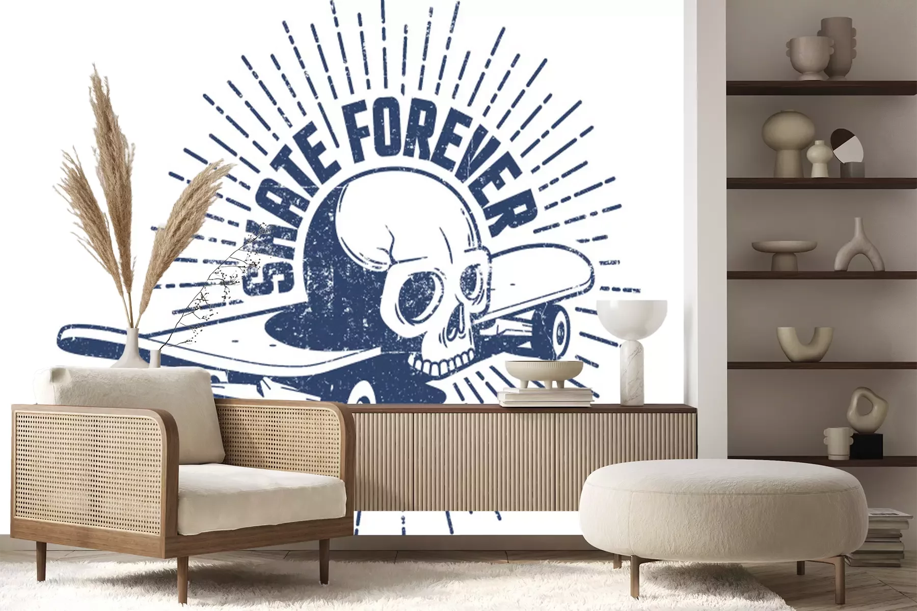 Sticker Skull and skateboard retro emblem. Skate forever vintage print. Grunge distressed texture on a separate layer.