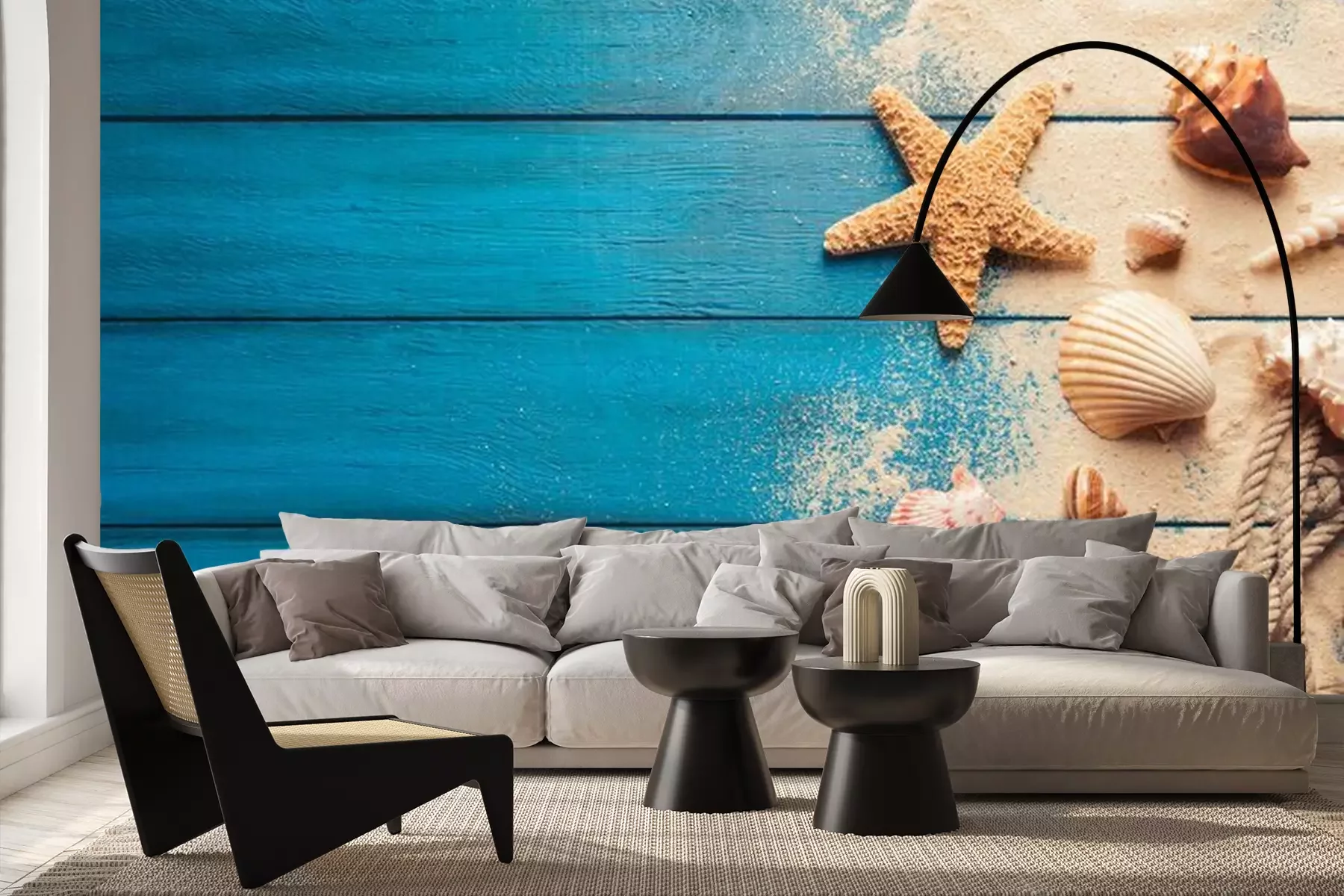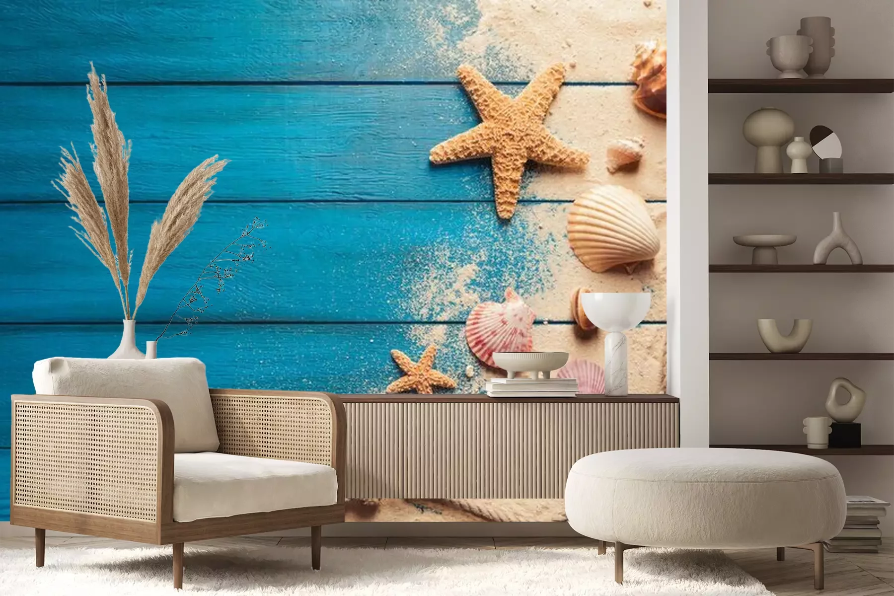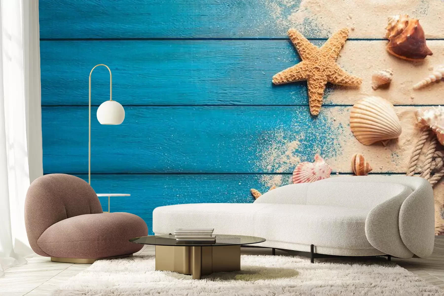 Sticker Strandszenenkonzept mit Muscheln und Seesternen auf einem blauen hölzernen Hintergrund