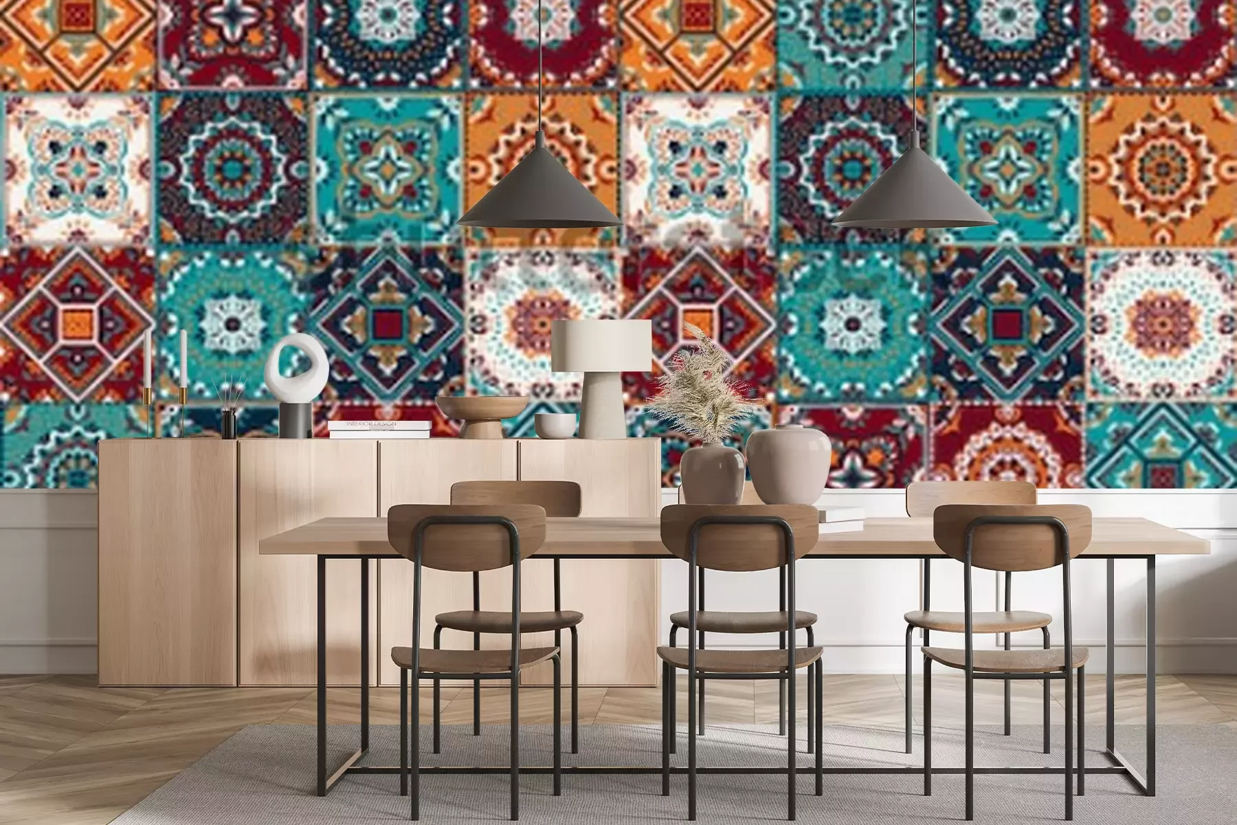 Sticker Talavera-Muster. Indisches Patchwork. Azulejos Portugal. Türkische Verzierung Marokkanisches Fliesenmosaik. Keramikgeschirr, Folk-Print. Spanische Keramik Ethnischer Hintergrund. Mediterrane nahtlose