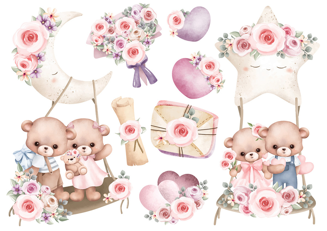 Sticker: Teddybären auf Schaukeln mit Blumen Mond und Stern