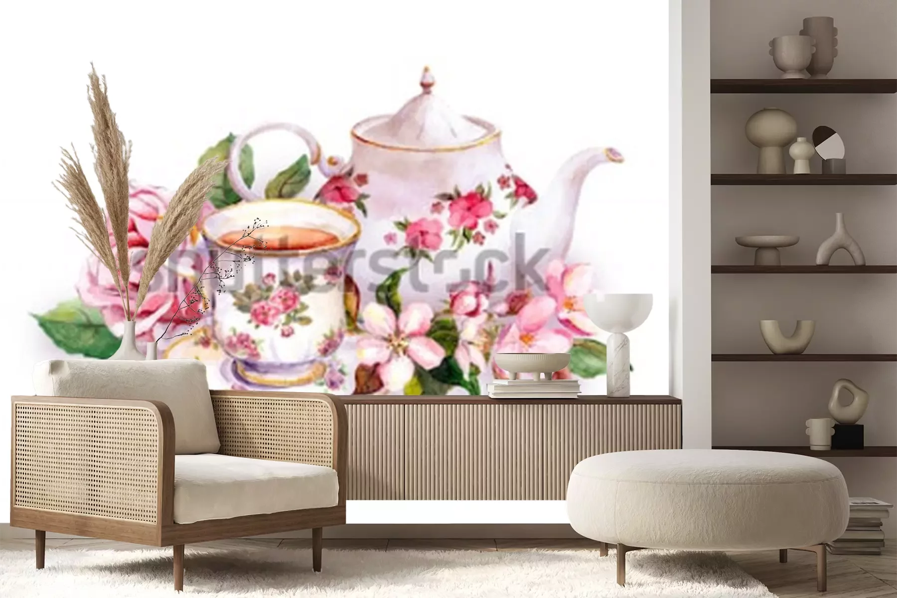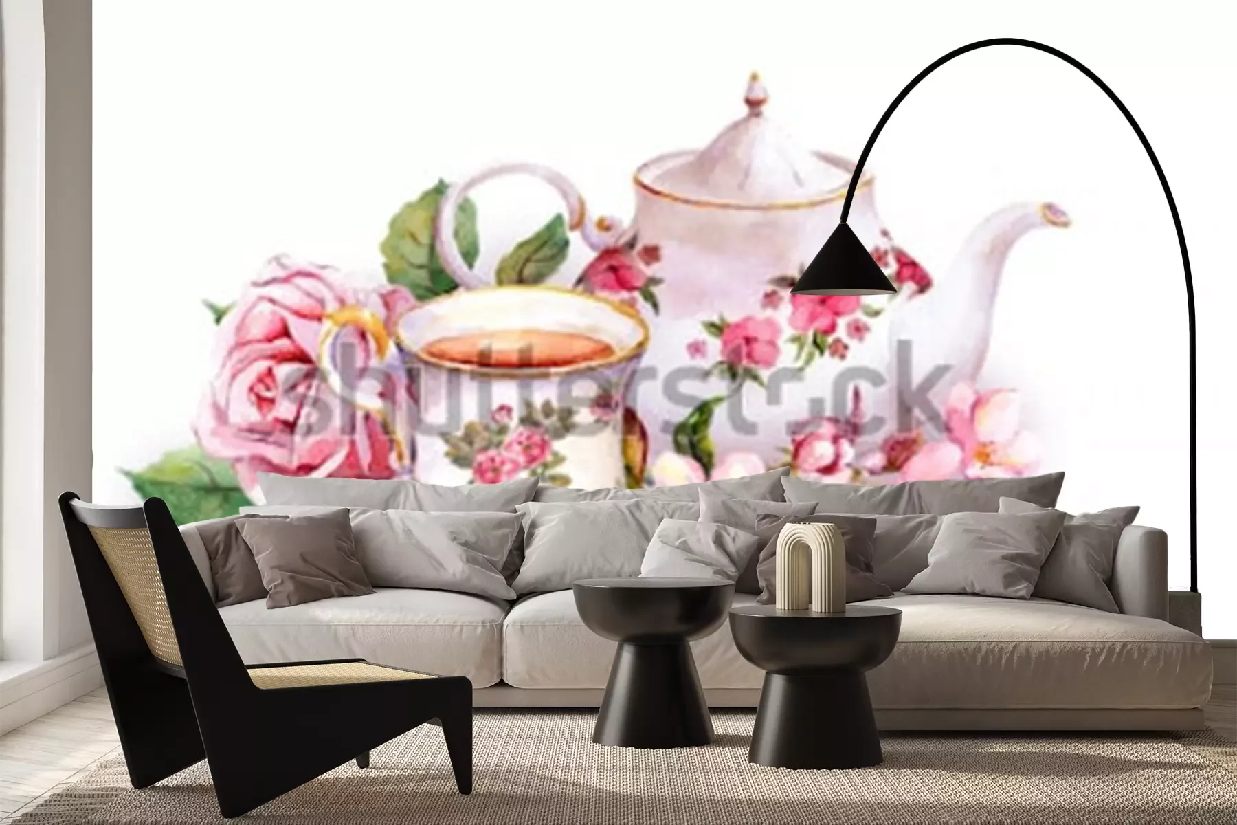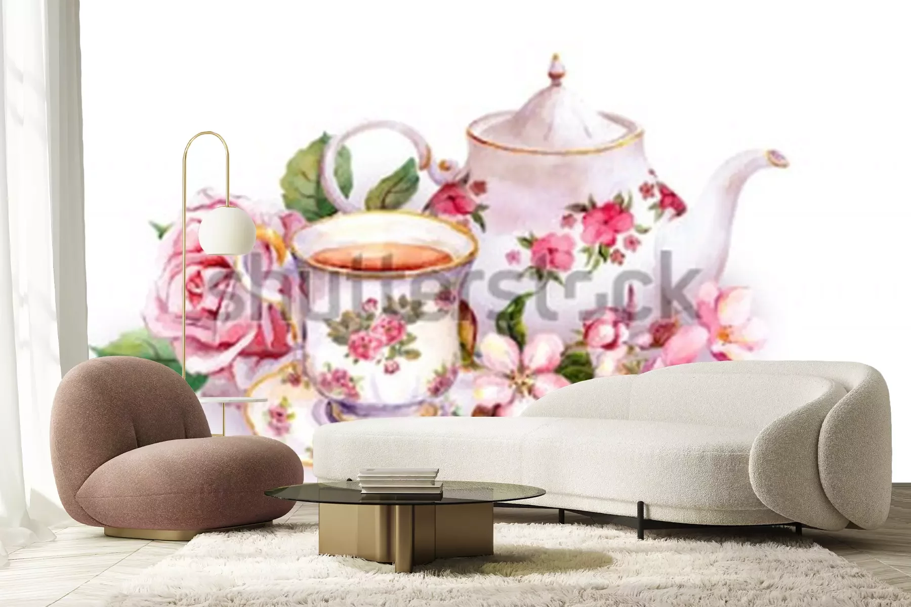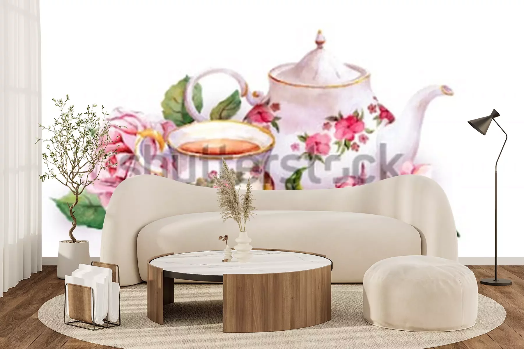 Sticker Teetasse und Teekanne mit Blumen. Kartenvorlage. Aquarell