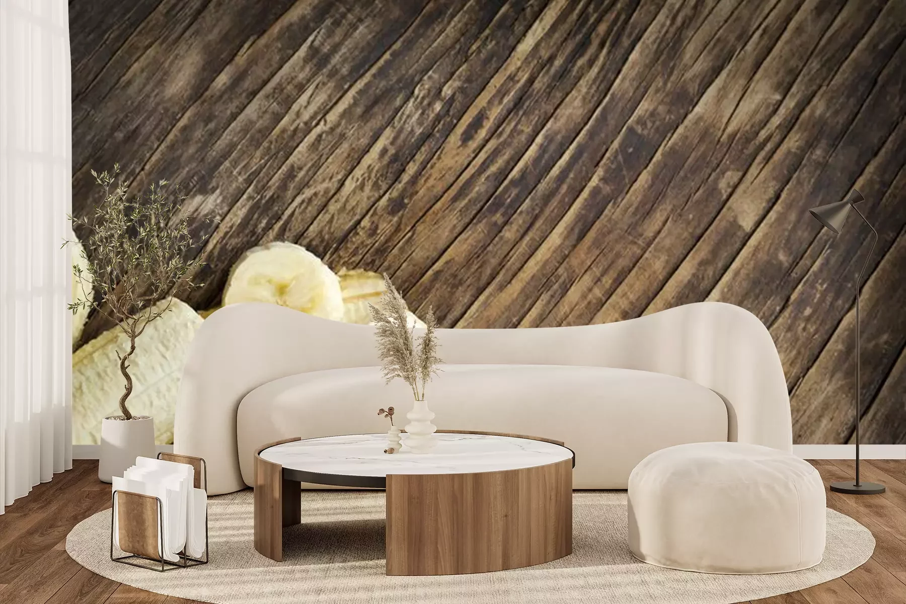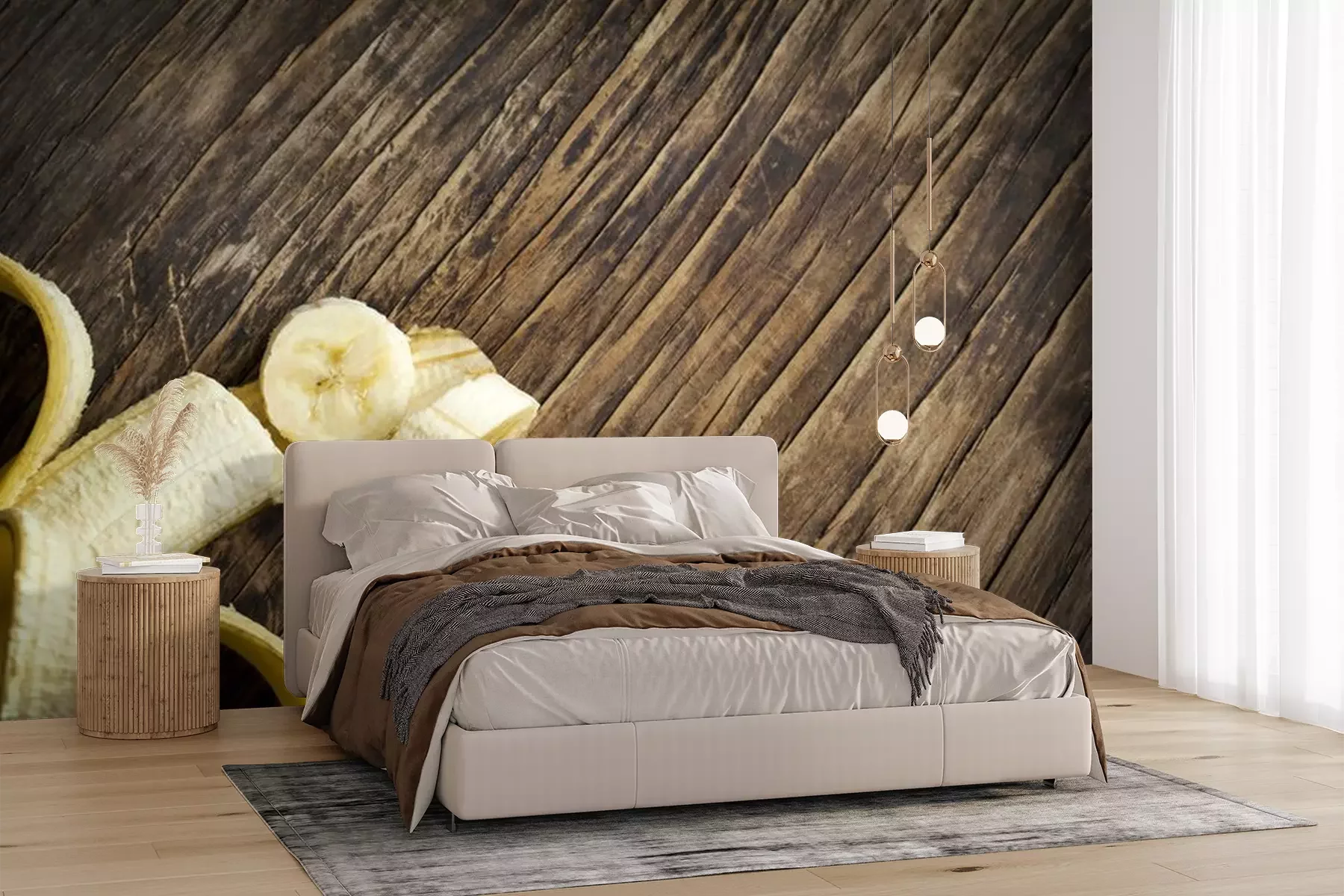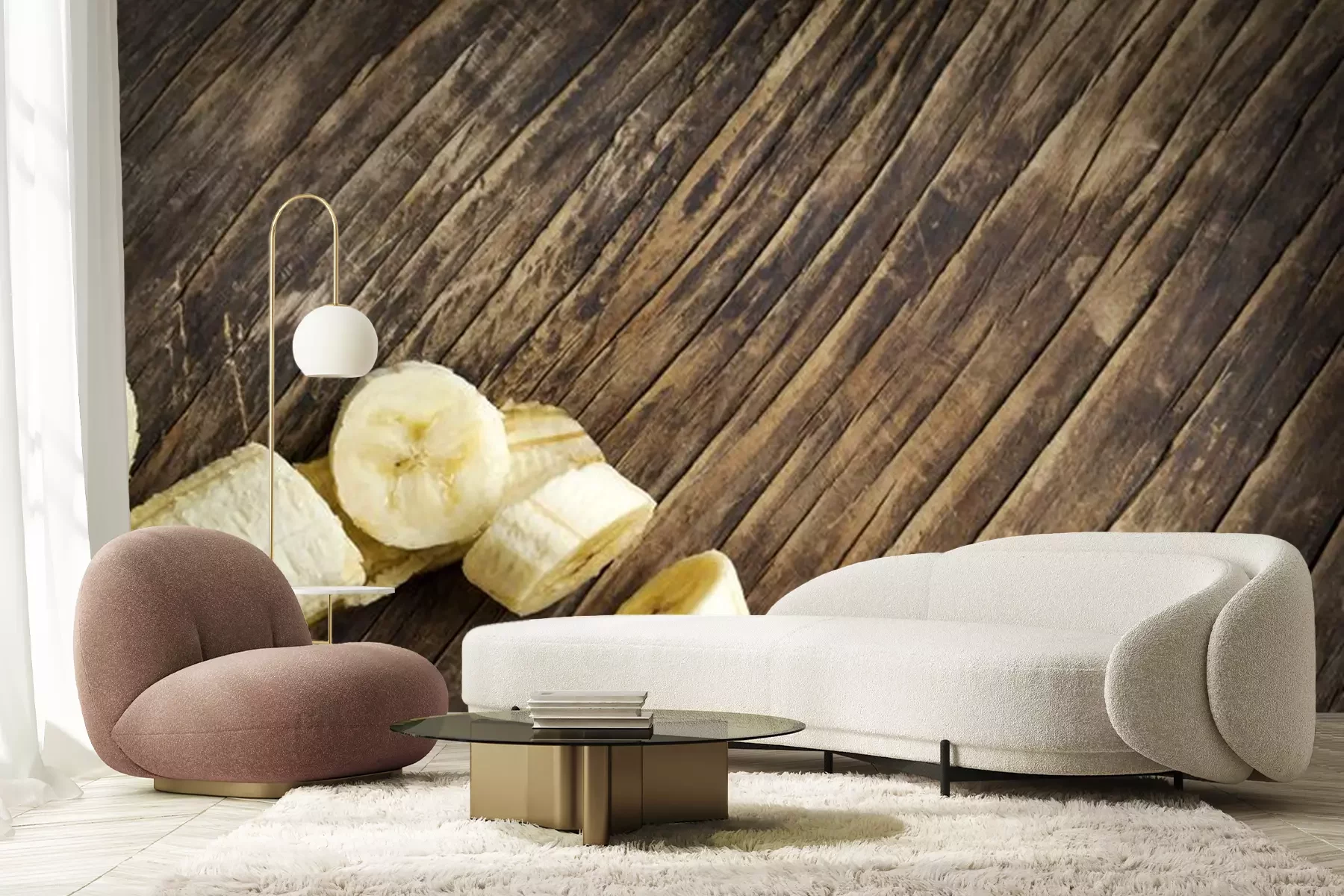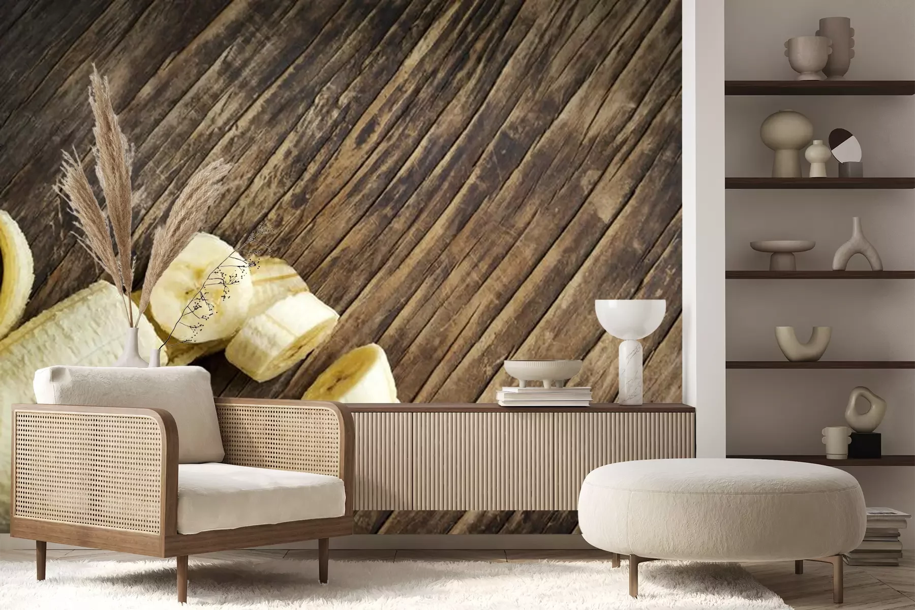 Sticker Teilweise geschnittene Banane auf dunklem Holz