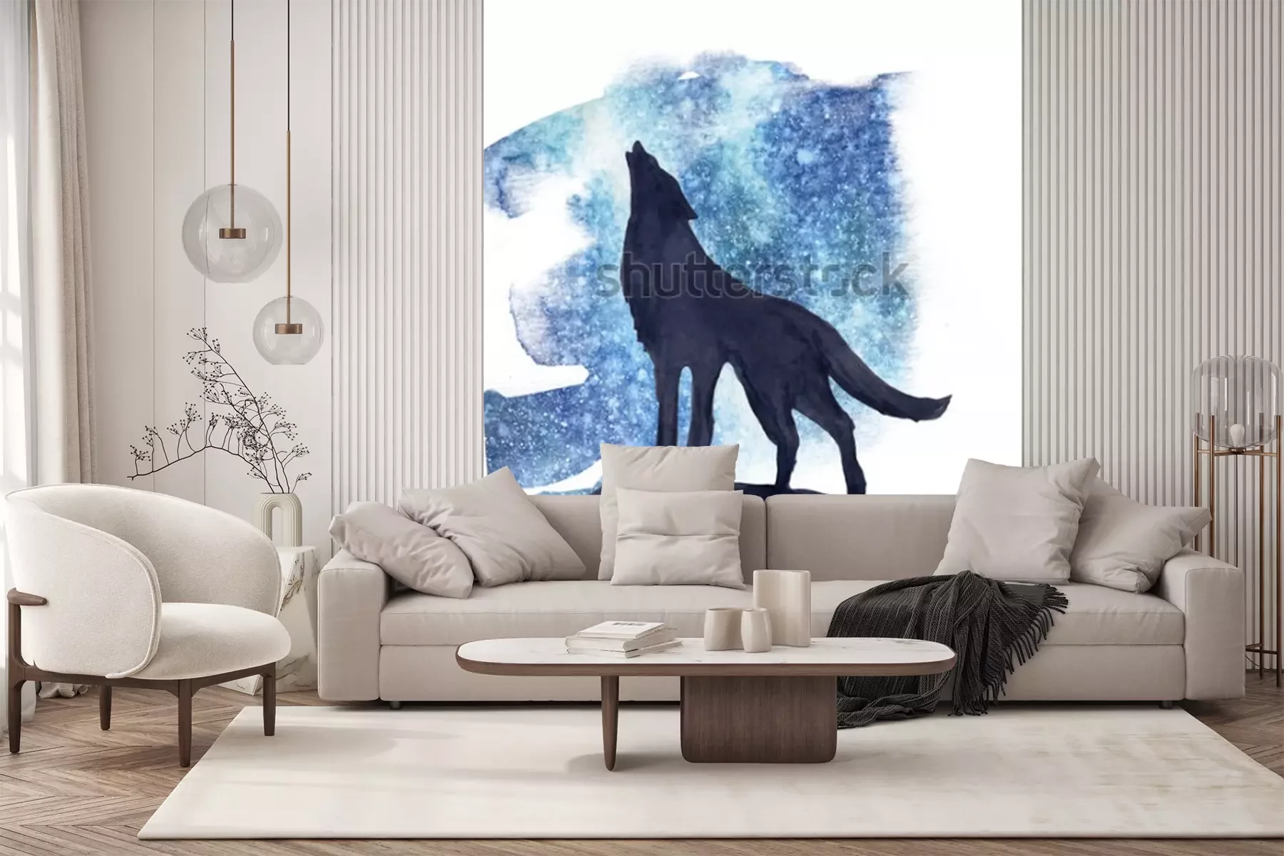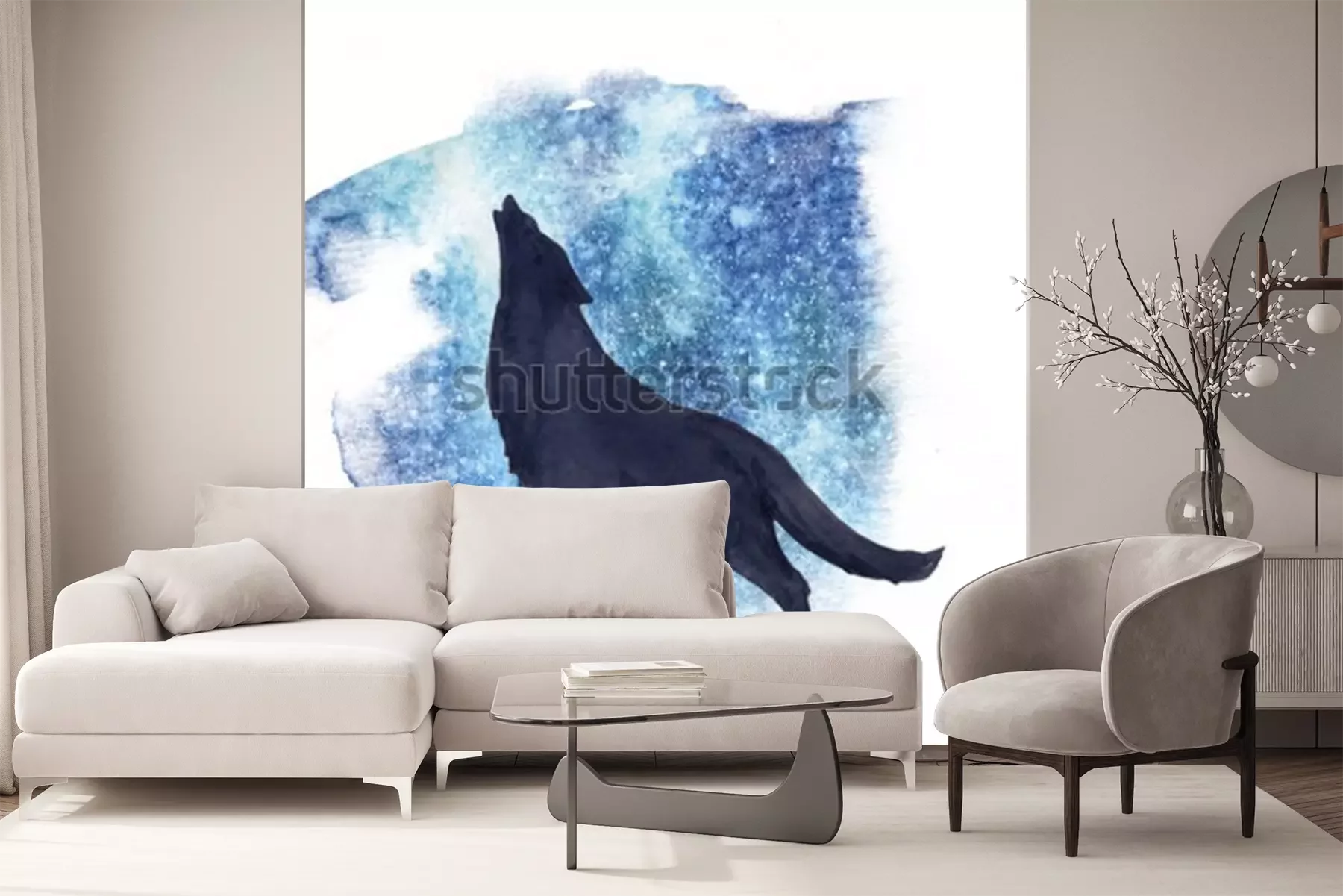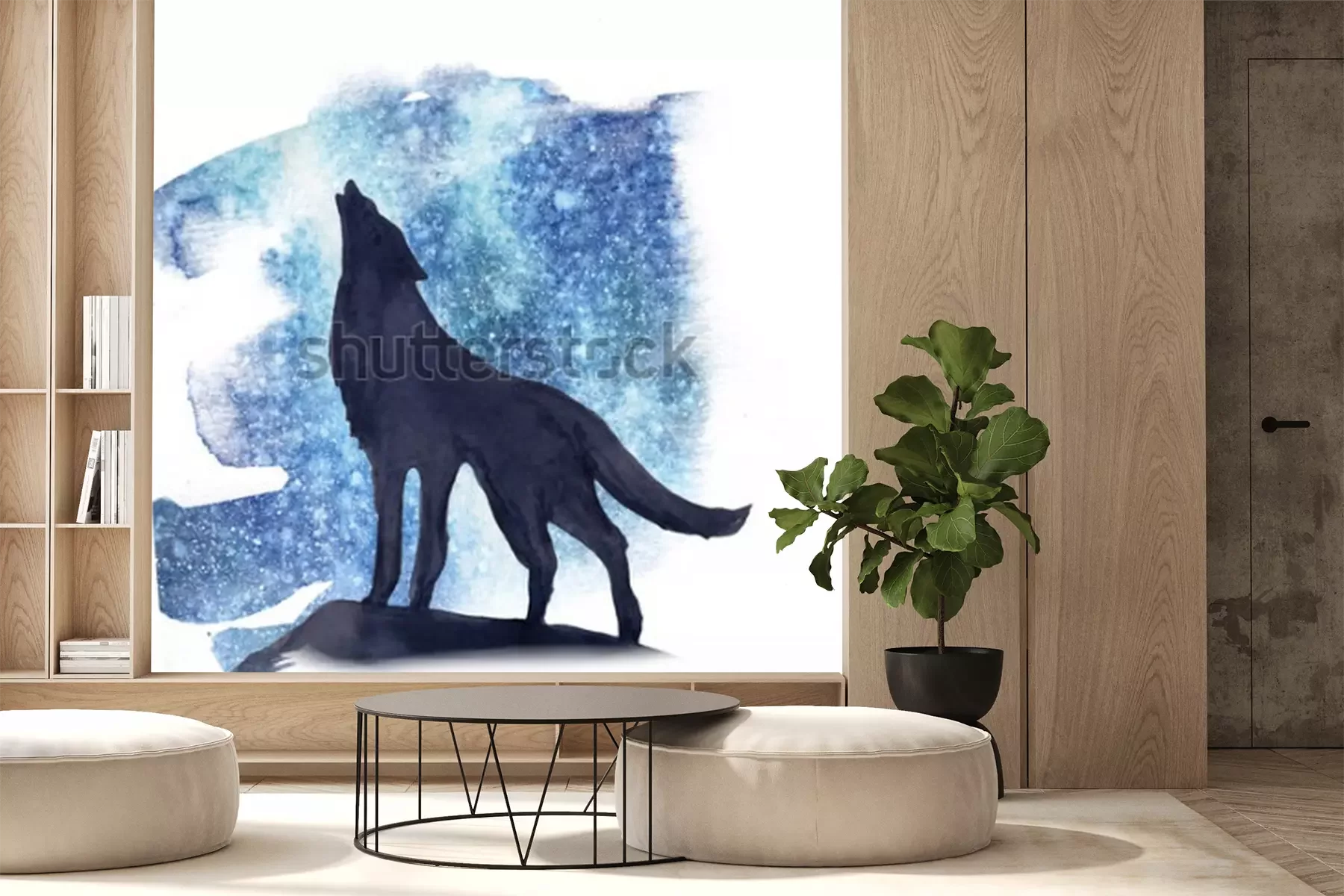 Sticker Tiere Wald heulender Wolf und Aquarellhimmel