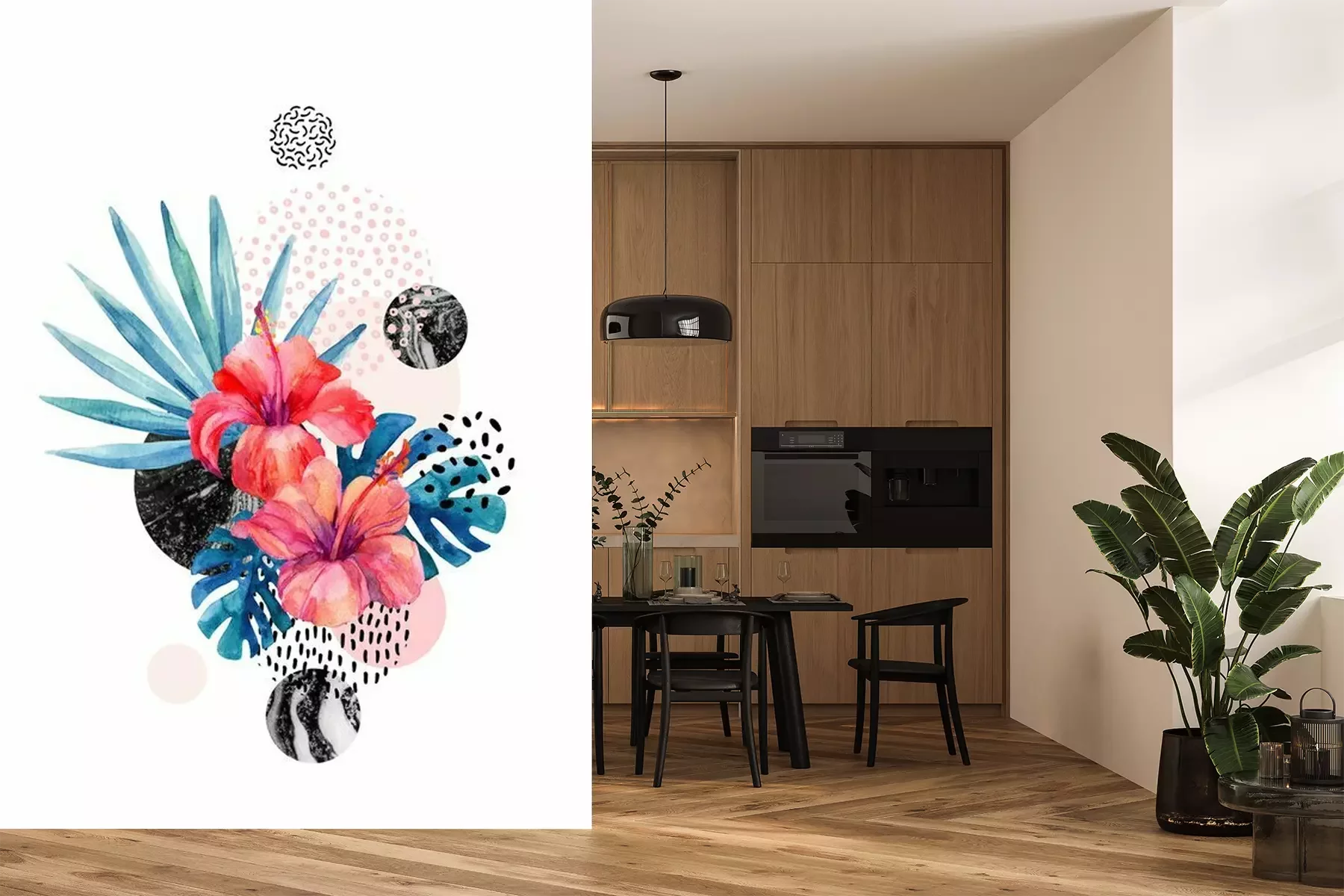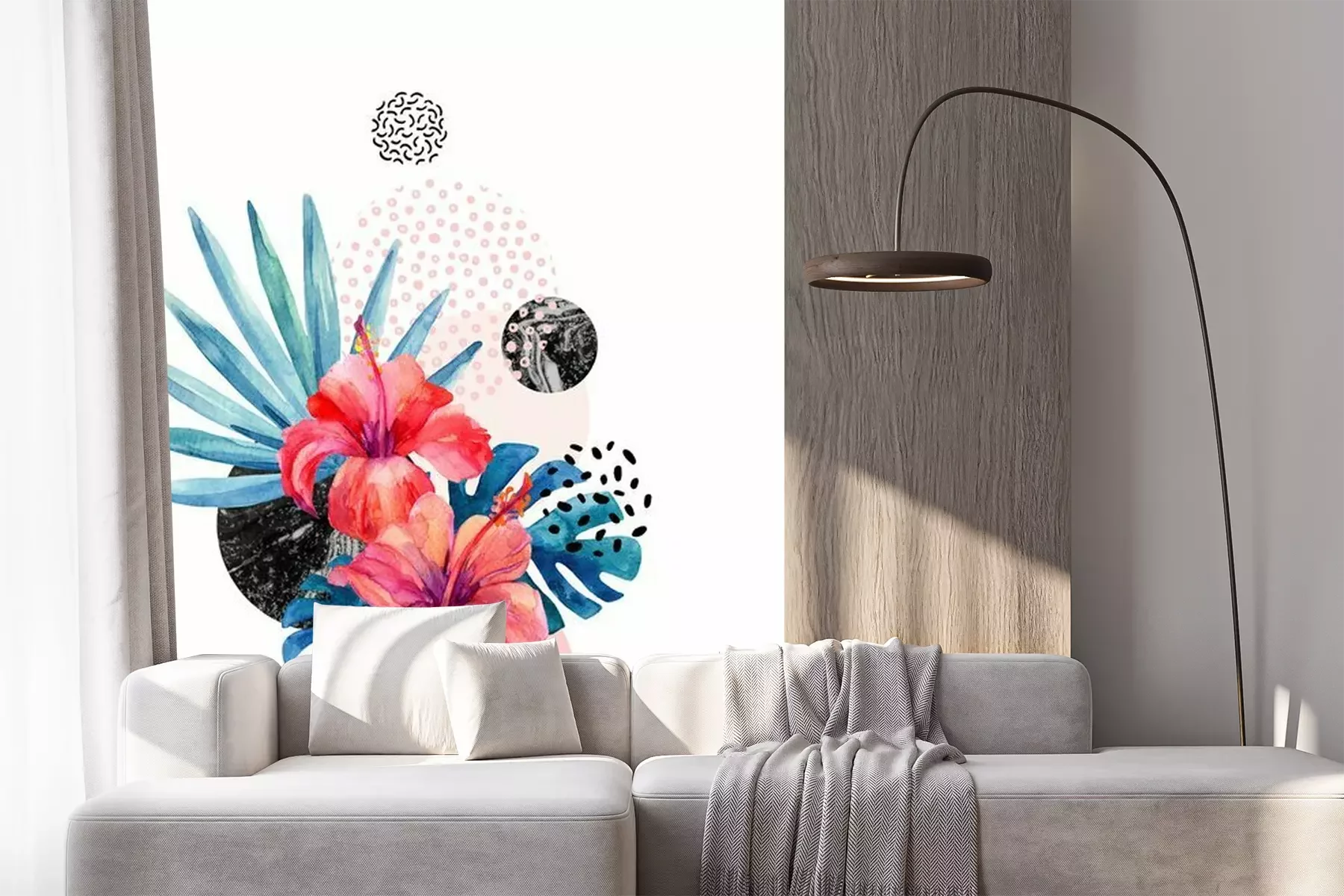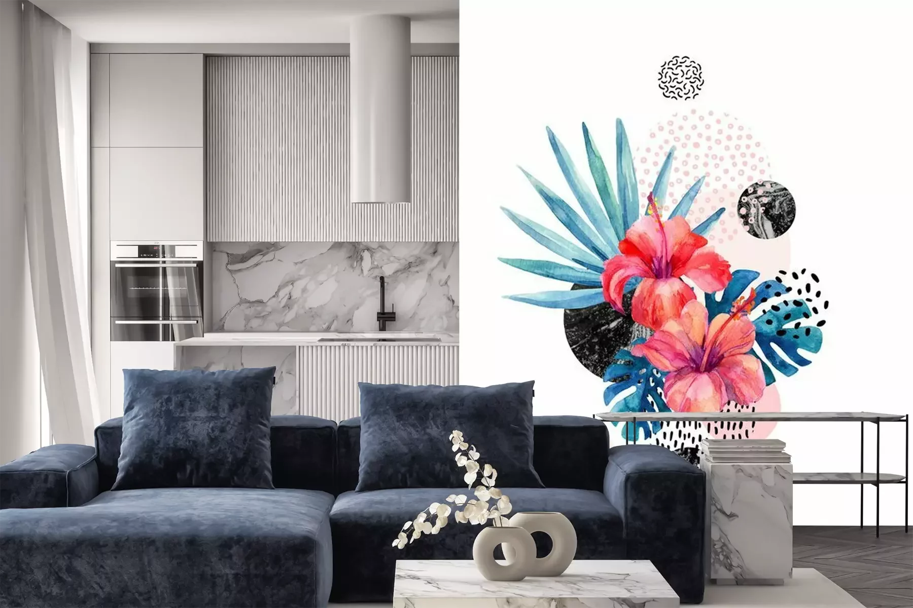 Sticker Tropische Blumen des Aquarells auf geometrischem Hintergrund mit Marmorierung, Gekritzelbeschaffenheiten