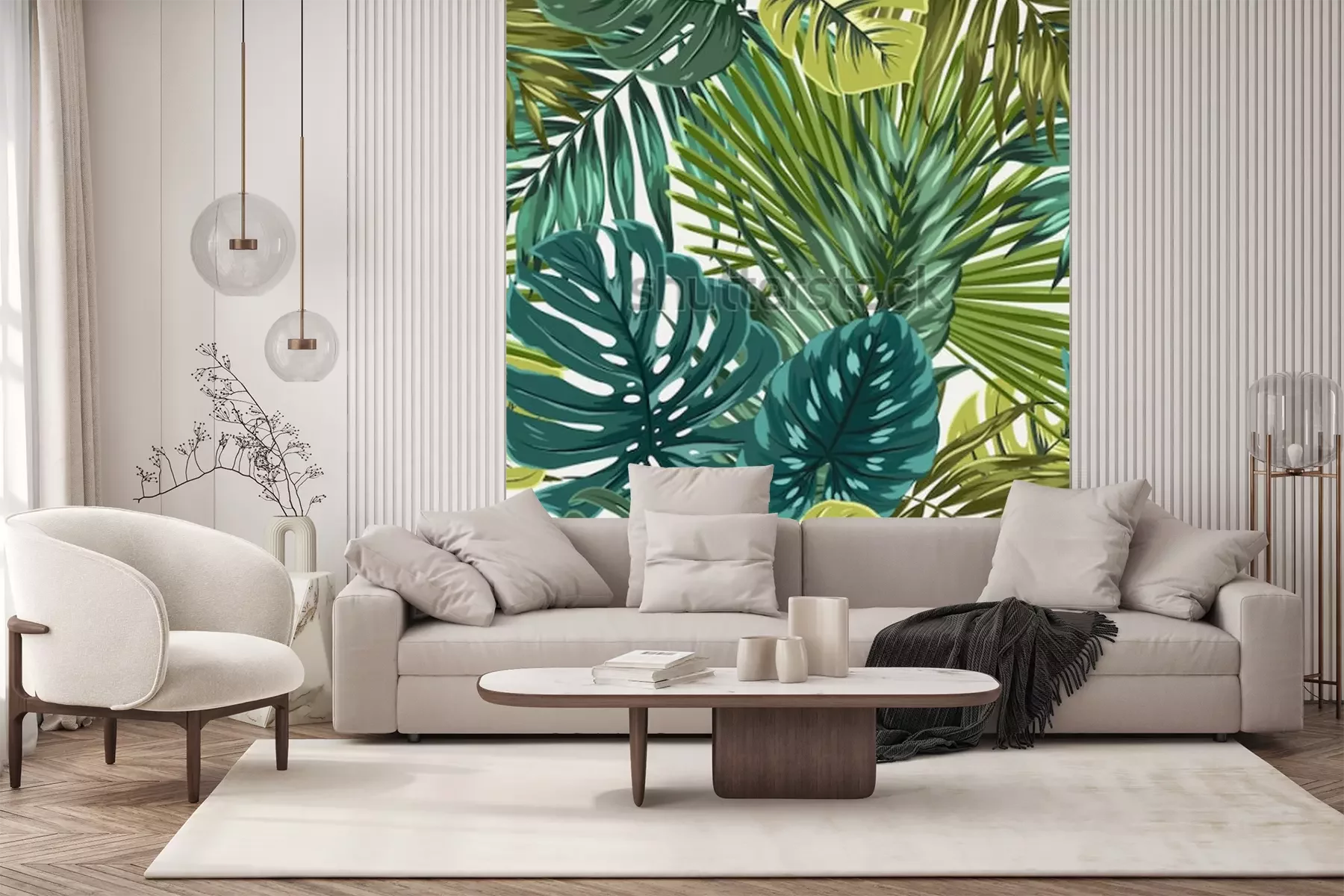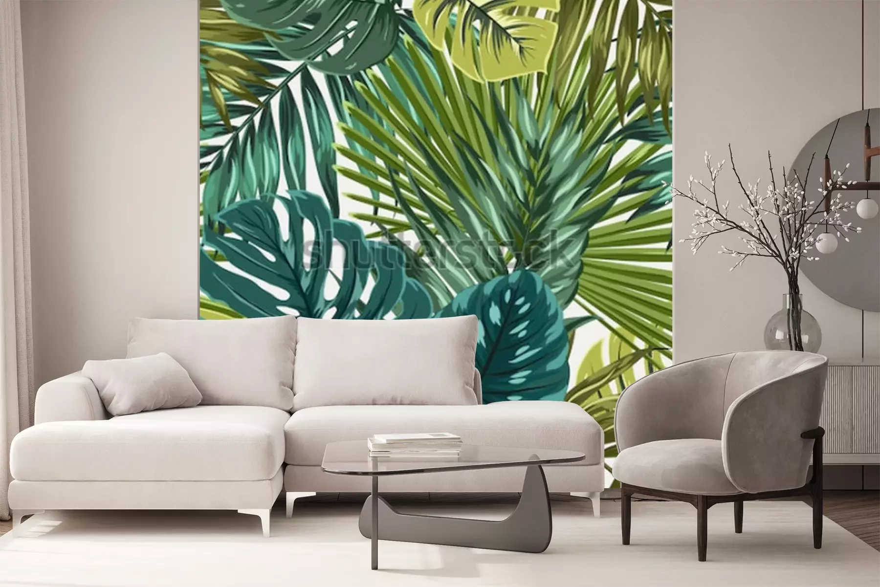 Sticker Tropisches Regenwaldpalmenmonstera lässt nahtlose Musterbeschaffenheit der Tarnung. Hellgrünes Türkisblau auf beige Hintergrund. Ferienfeiertagsparadiesinsel. Botanische vektorauslegungabbildung.