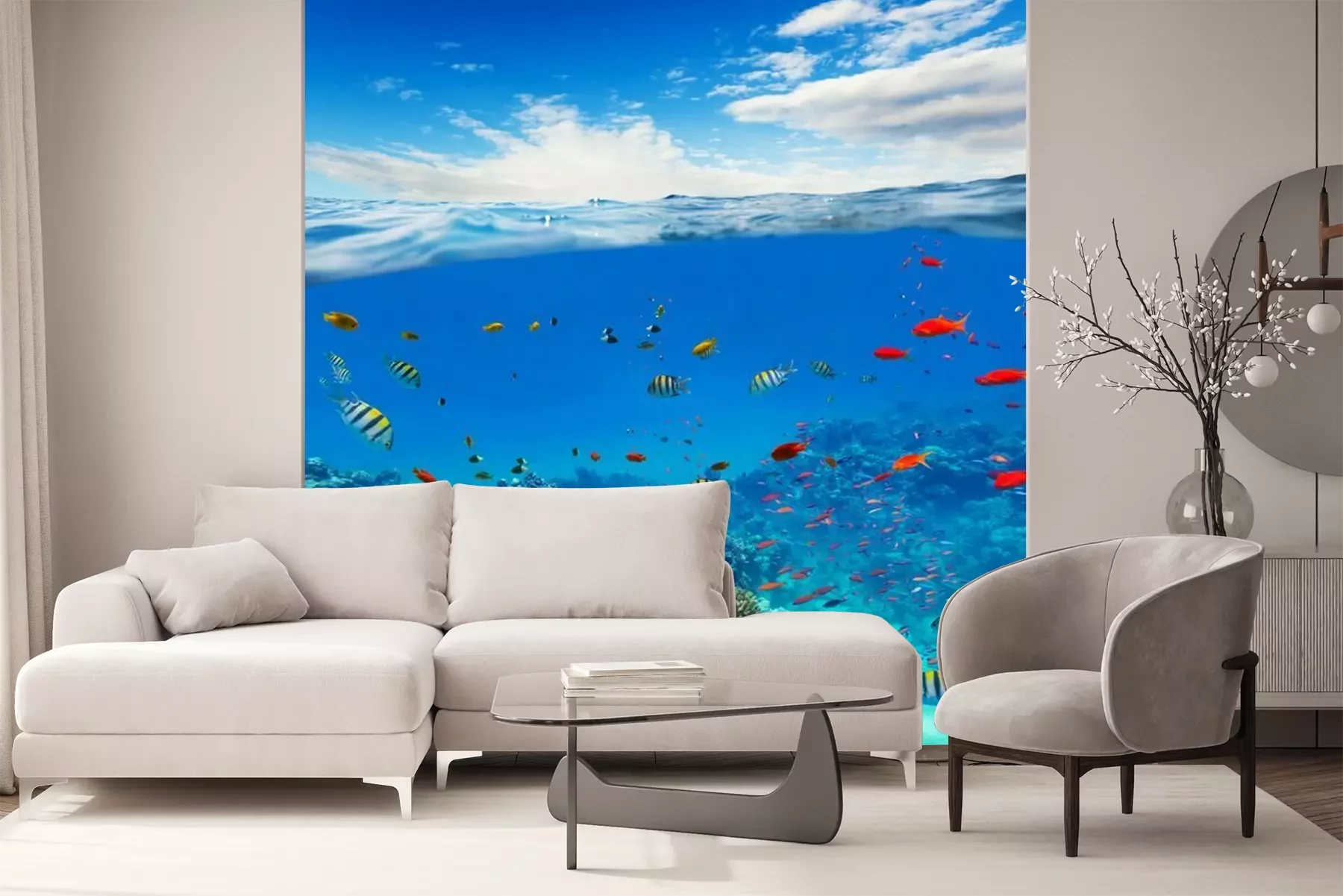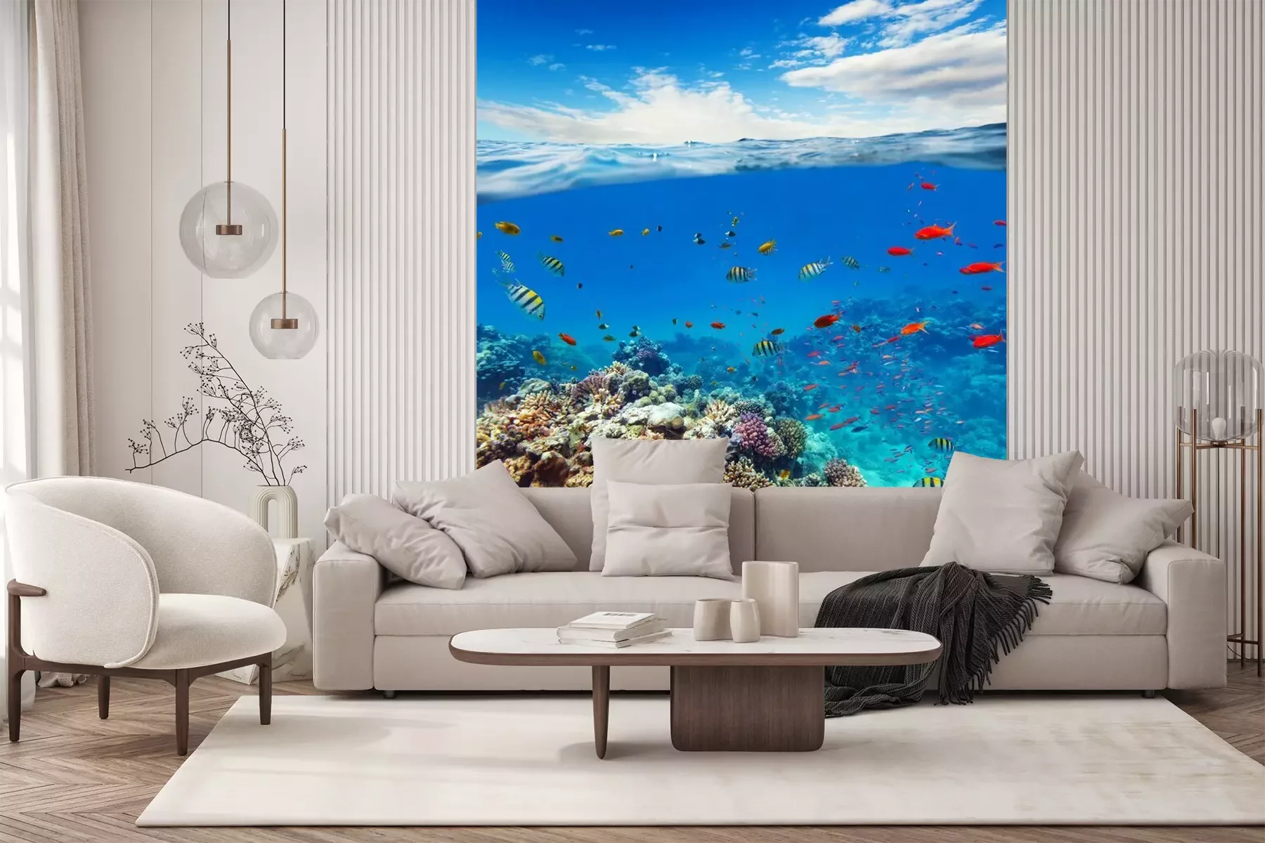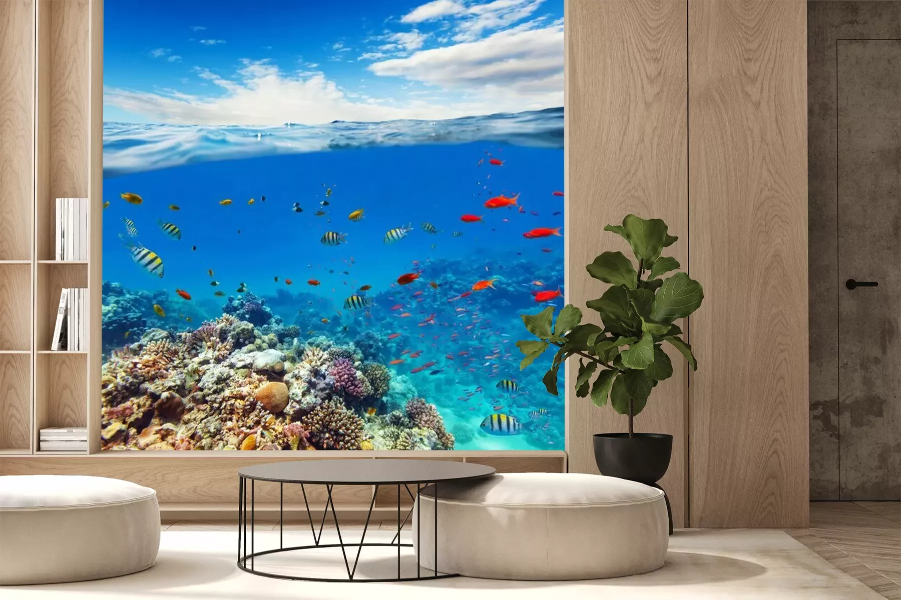 Sticker Unterwasser-Korallenriff mit Horizont und Wasserwellen