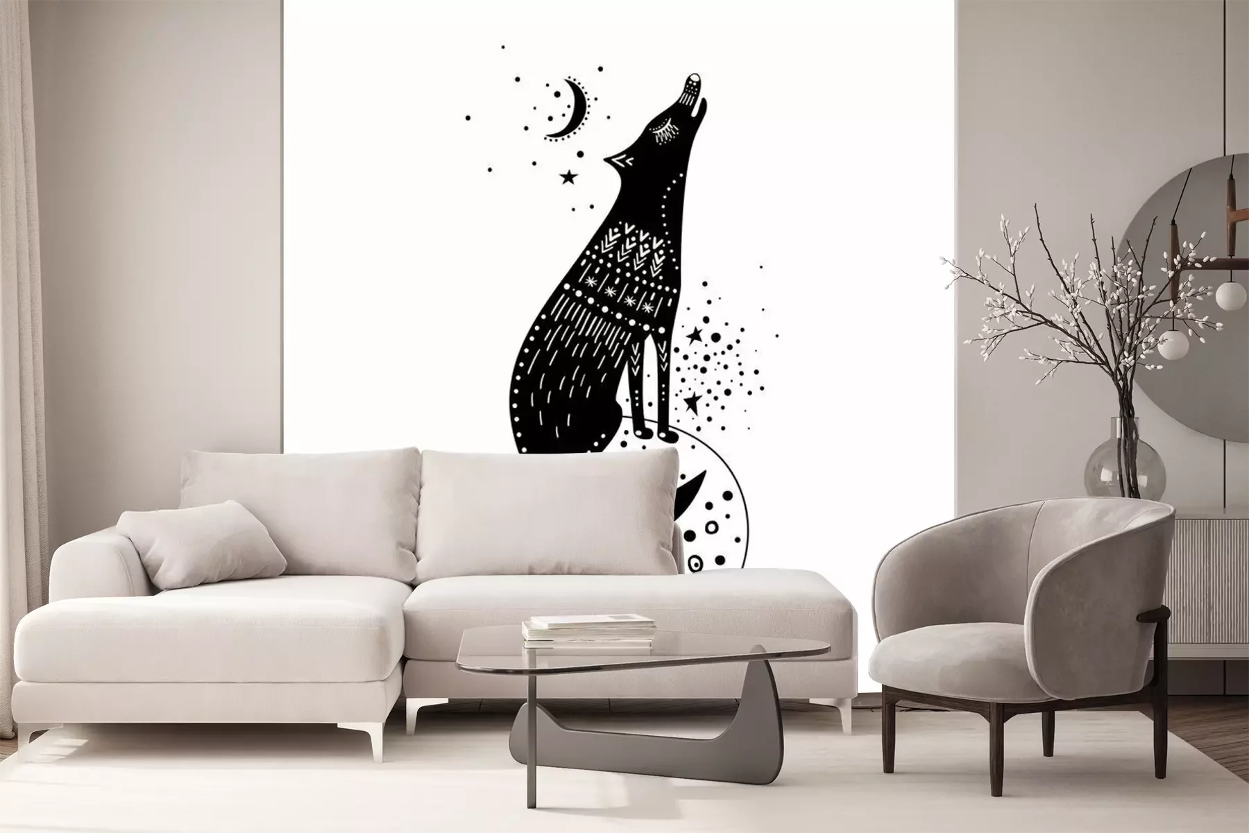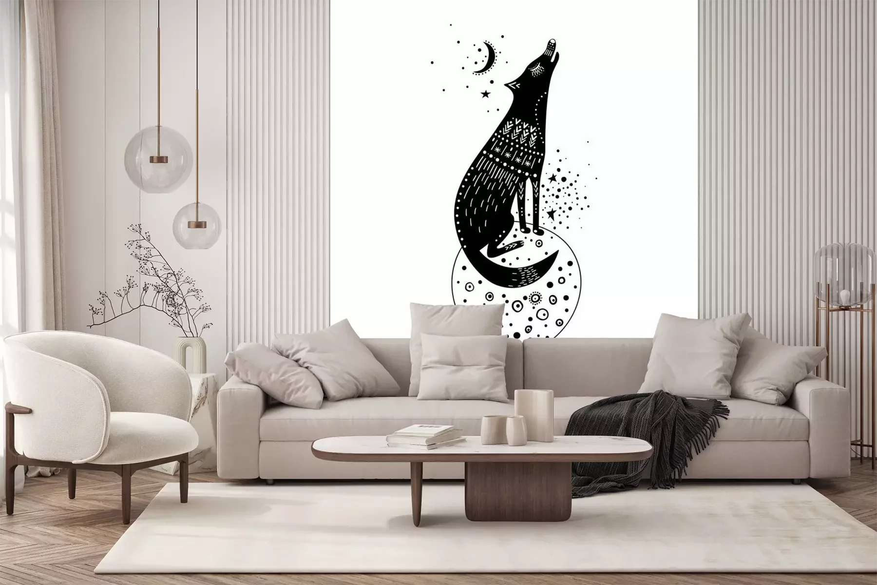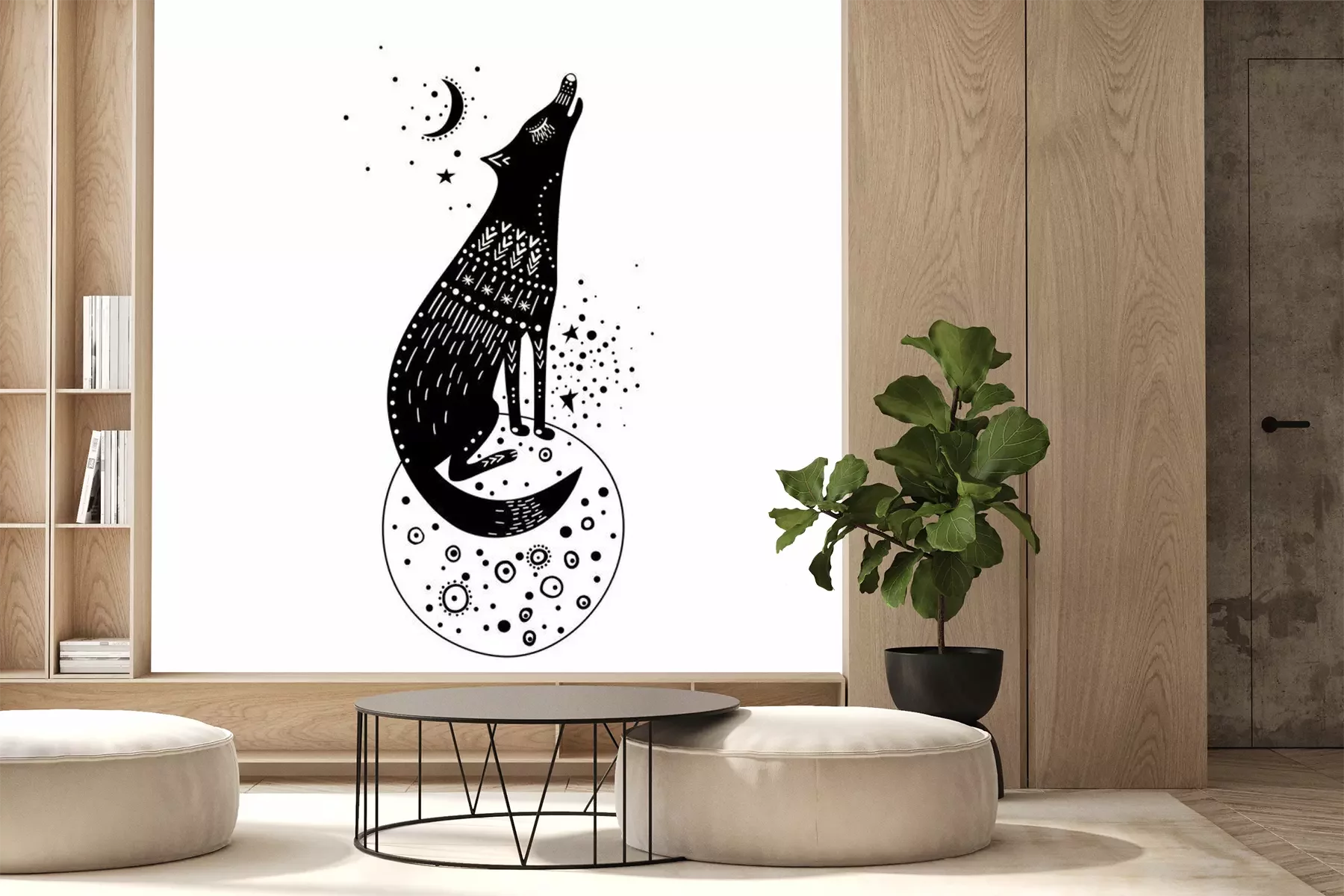 Sticker Vector childish hand-drawn illustration. Wolf sitting on a planet in space and howling at the moon. Black and white