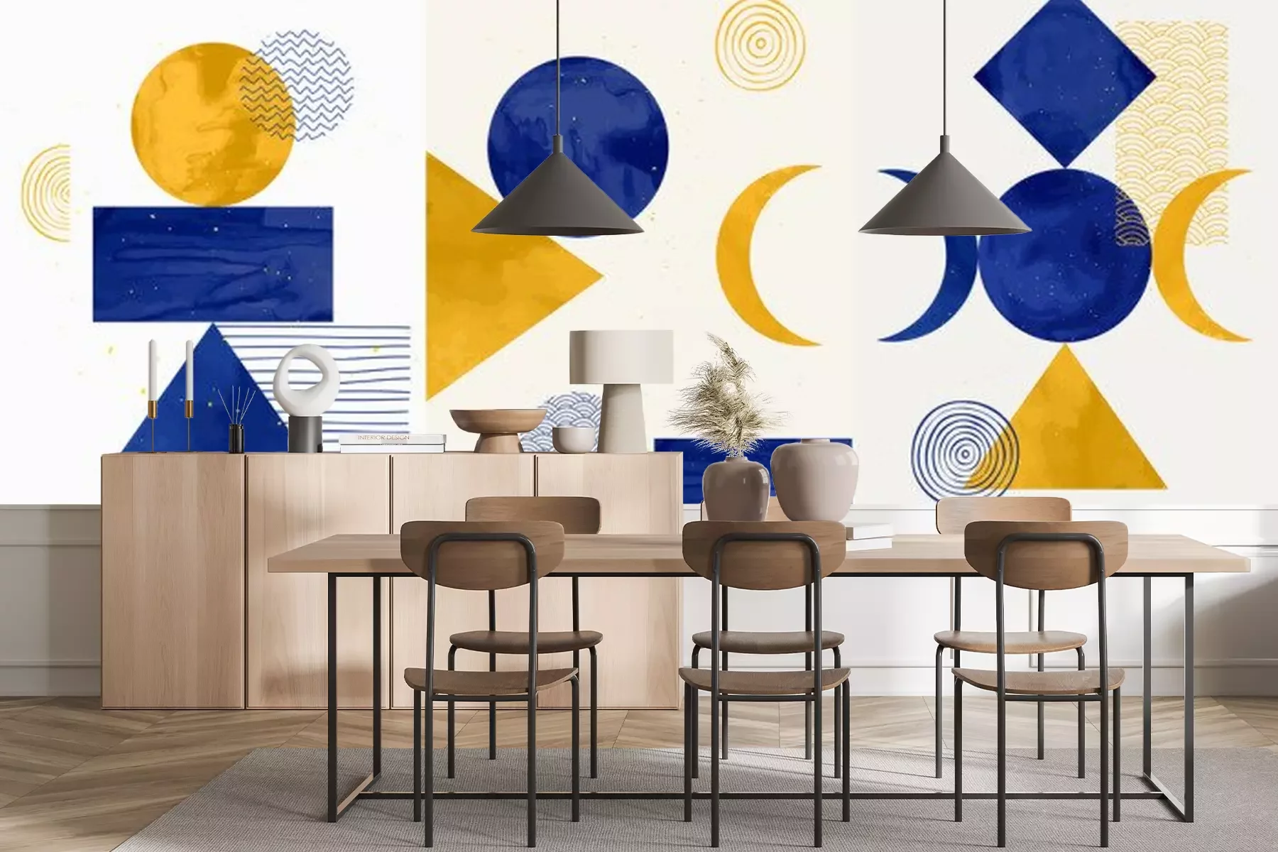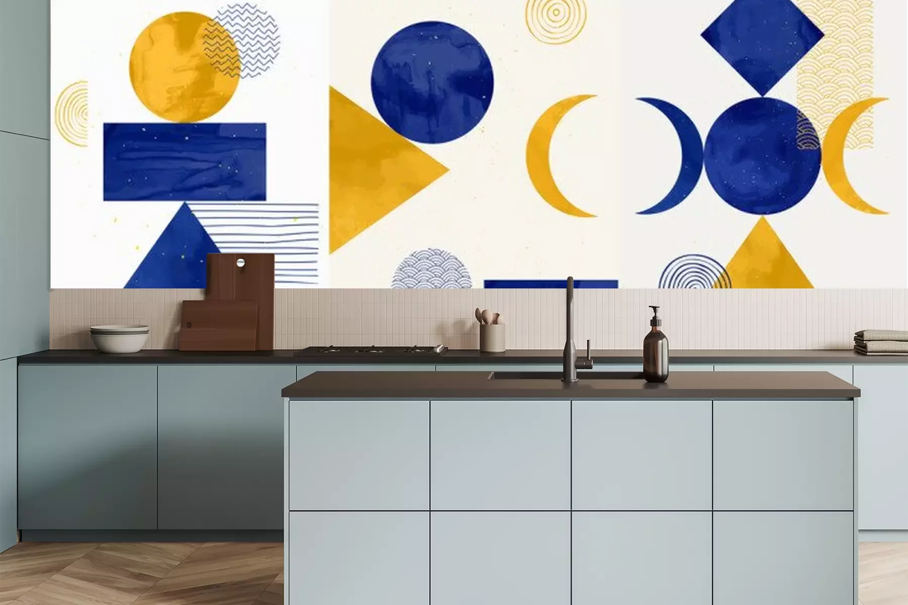 Sticker Vector illustration. Abstract contemporary aesthetic backgrounds. Design for poster, postcard, invitation card, flyer, brochure cover. Room wall decor. Blue watercolor paints with golden splash dots