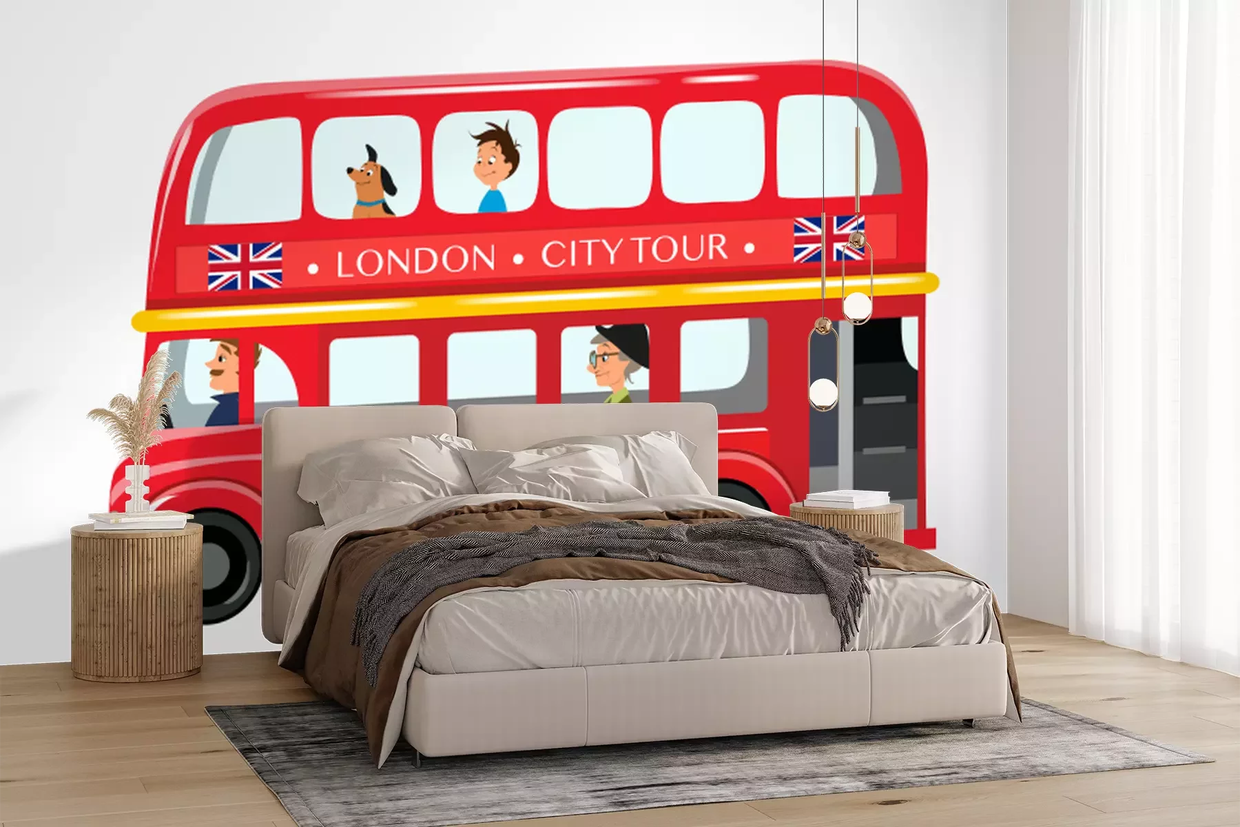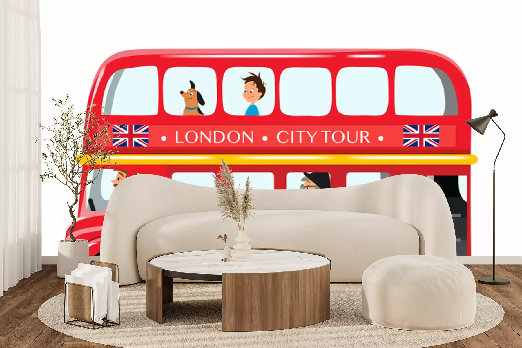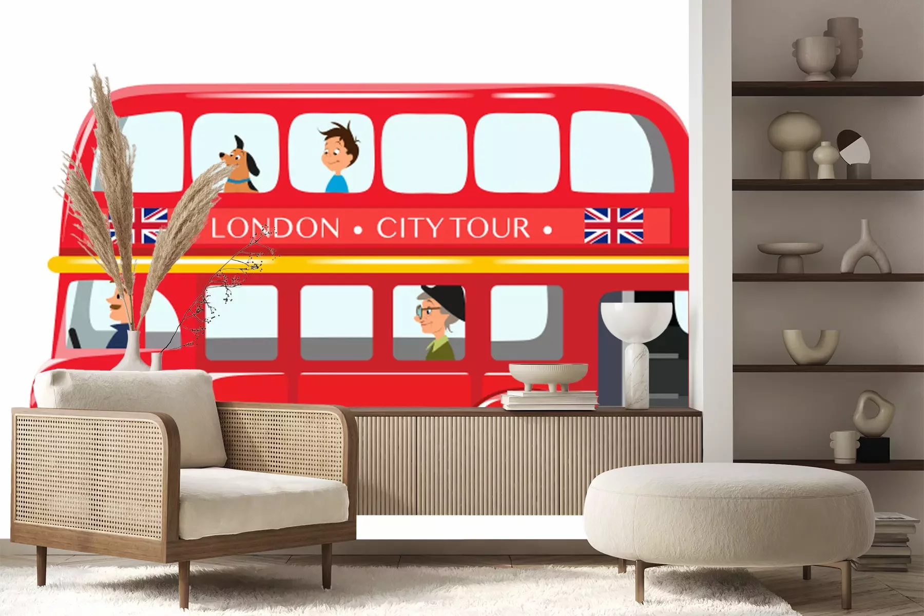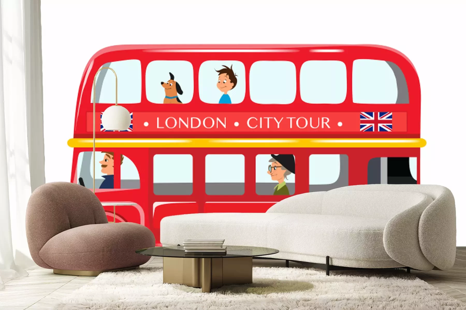 Sticker Vector illustration isolated on white background. English red double-decker bus side view flat style. Element infographic, website, icon, postcards, place for text. Cute and funny characters inside