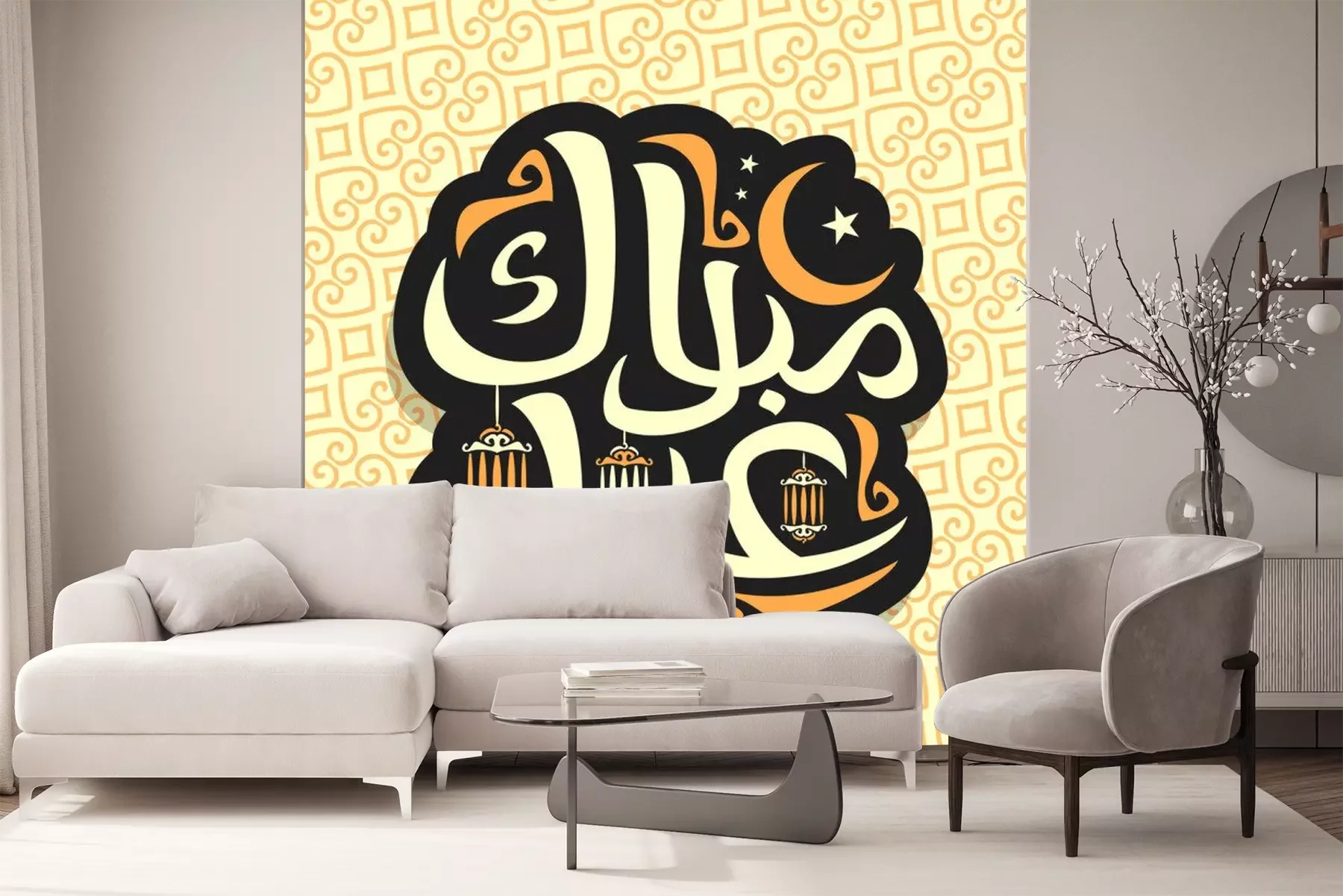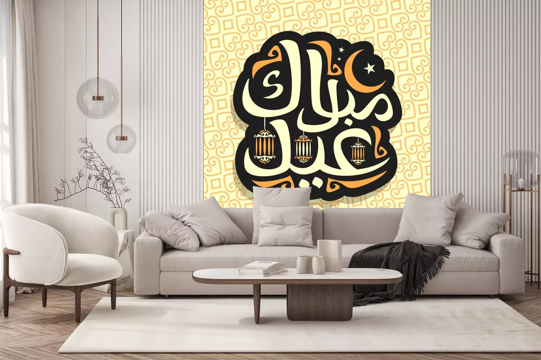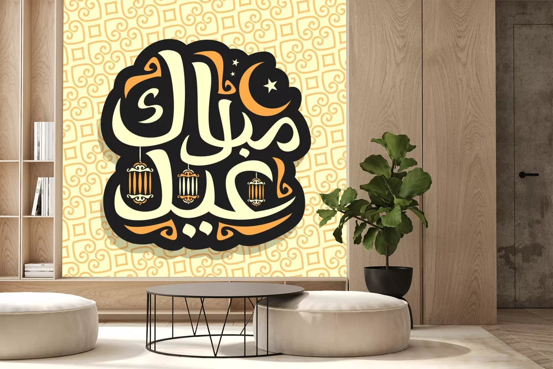 Sticker Vector logo for muslim holiday Eid Mubarak, calligraphy sign with original brush typeface for words eid mubarak in arabic language, black label with crescent, stars and lanterns on oriental pattern.