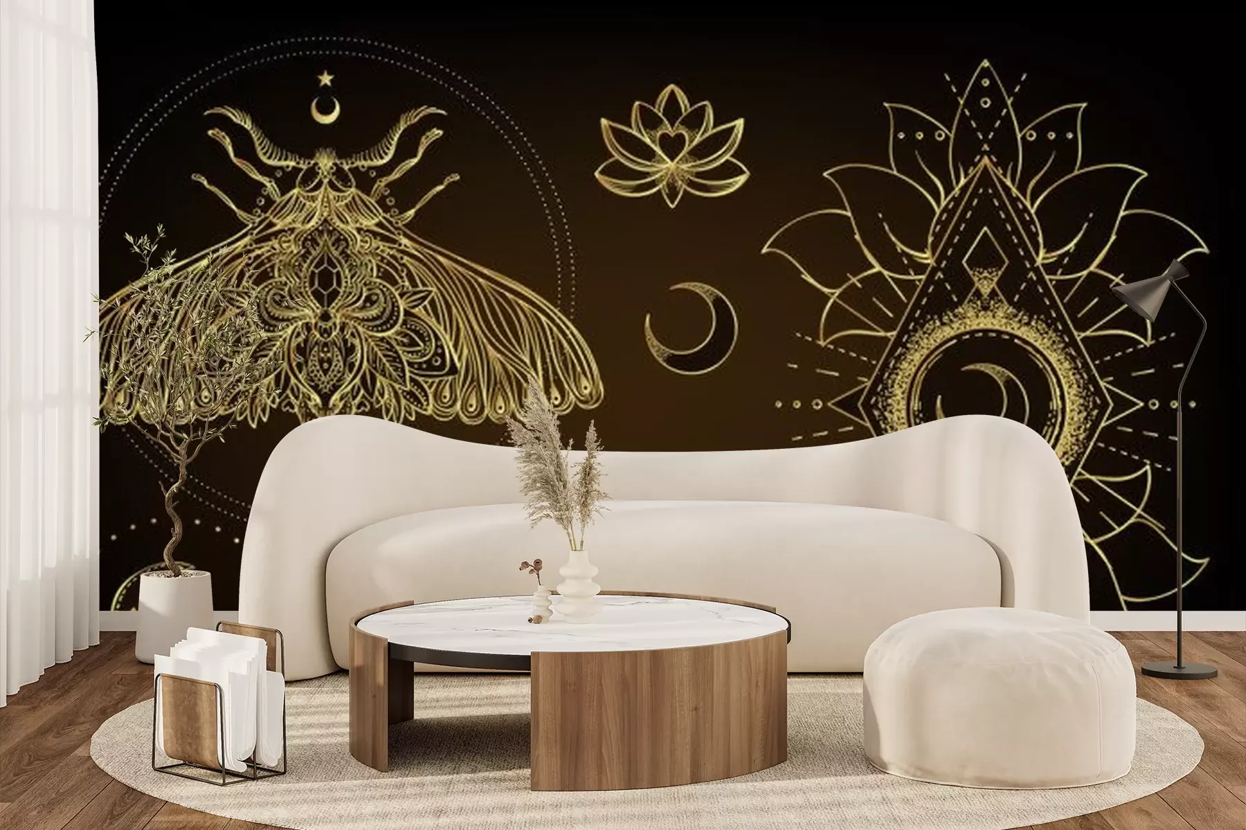 Sticker Vector ornamental Lotus flower, ethnic art, patterned Indian paisley. Hand drawn illustration isolated. Invitation. Golden stickers, flash temporary tattoo, mehndi symbol. Gold gradient over black.
