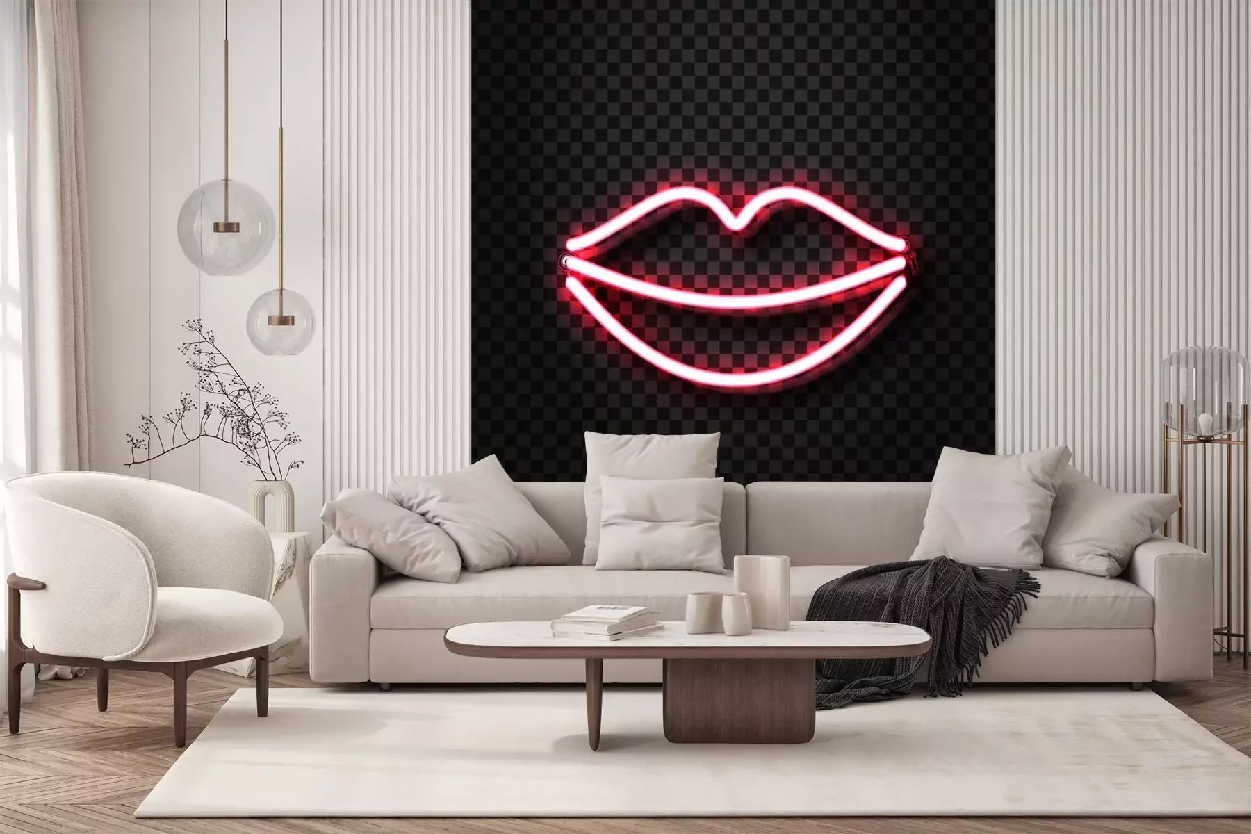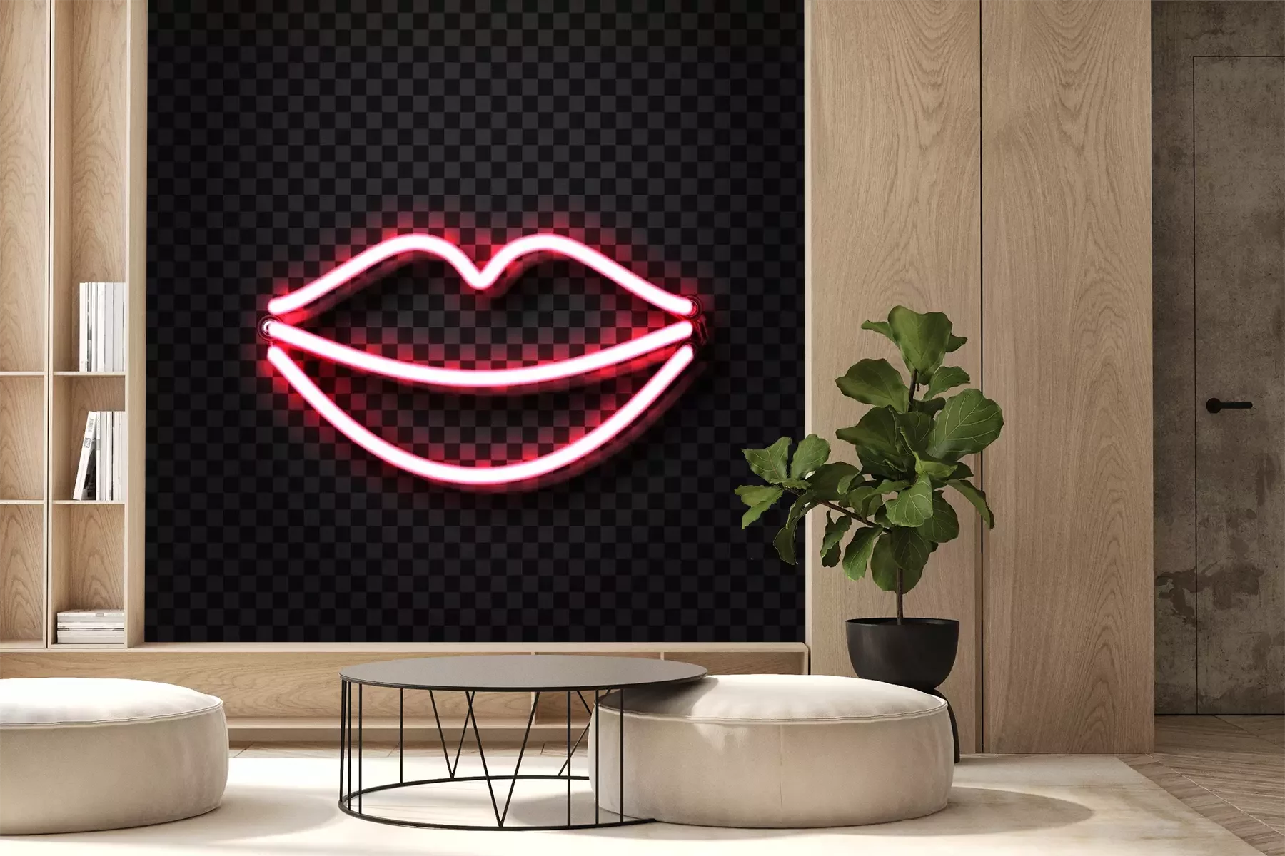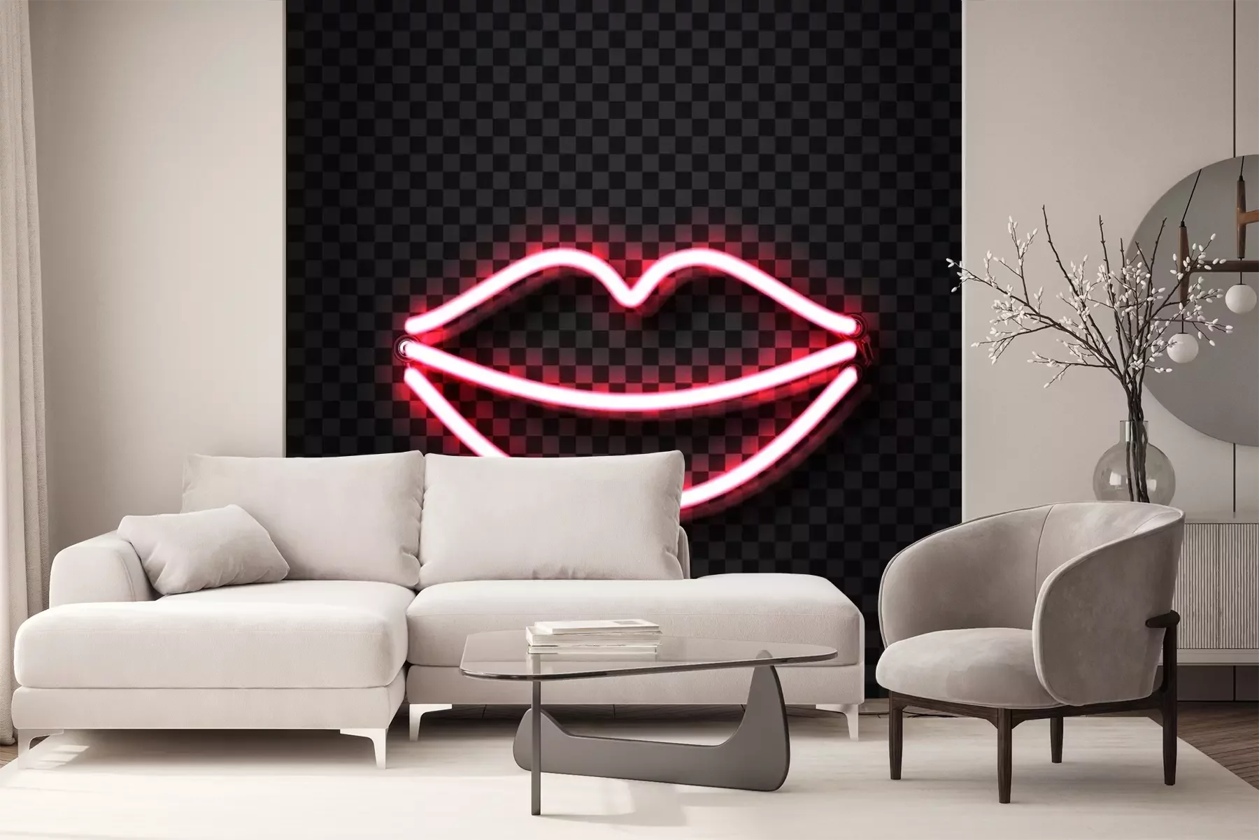 Sticker Vector realistische lokalisierte erotische Lippen Neonzeichen für Dekoration und die Abdeckung auf dem transparenten Hintergrund. Konzept des erotischen Show- und Nachtclubs.