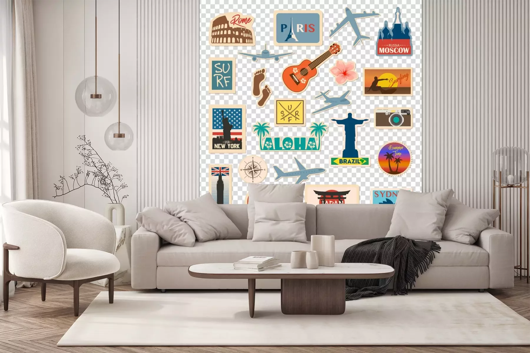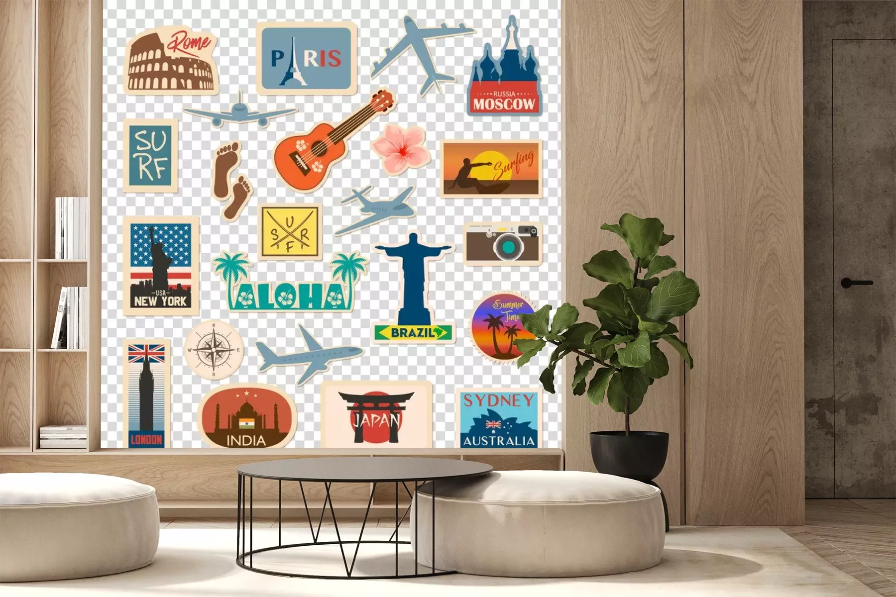 Sticker Vector Reiseaufkleber- und -aufklebersatz mit berühmten Ländern, Städten, Monumenten, Flaggen und Symbolen in der Retro- oder Weinleseart. Umfasst Italien, Frankreich, Russland, USA, England, Indien,