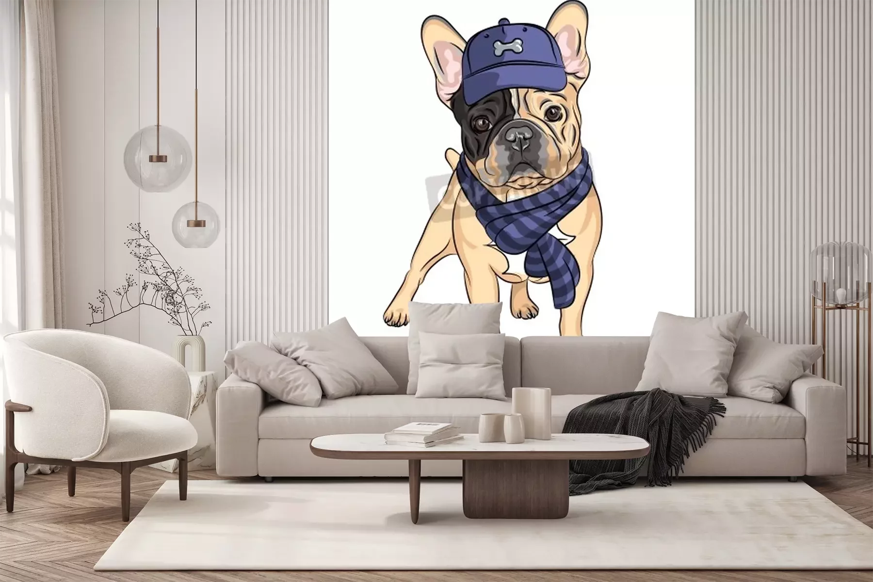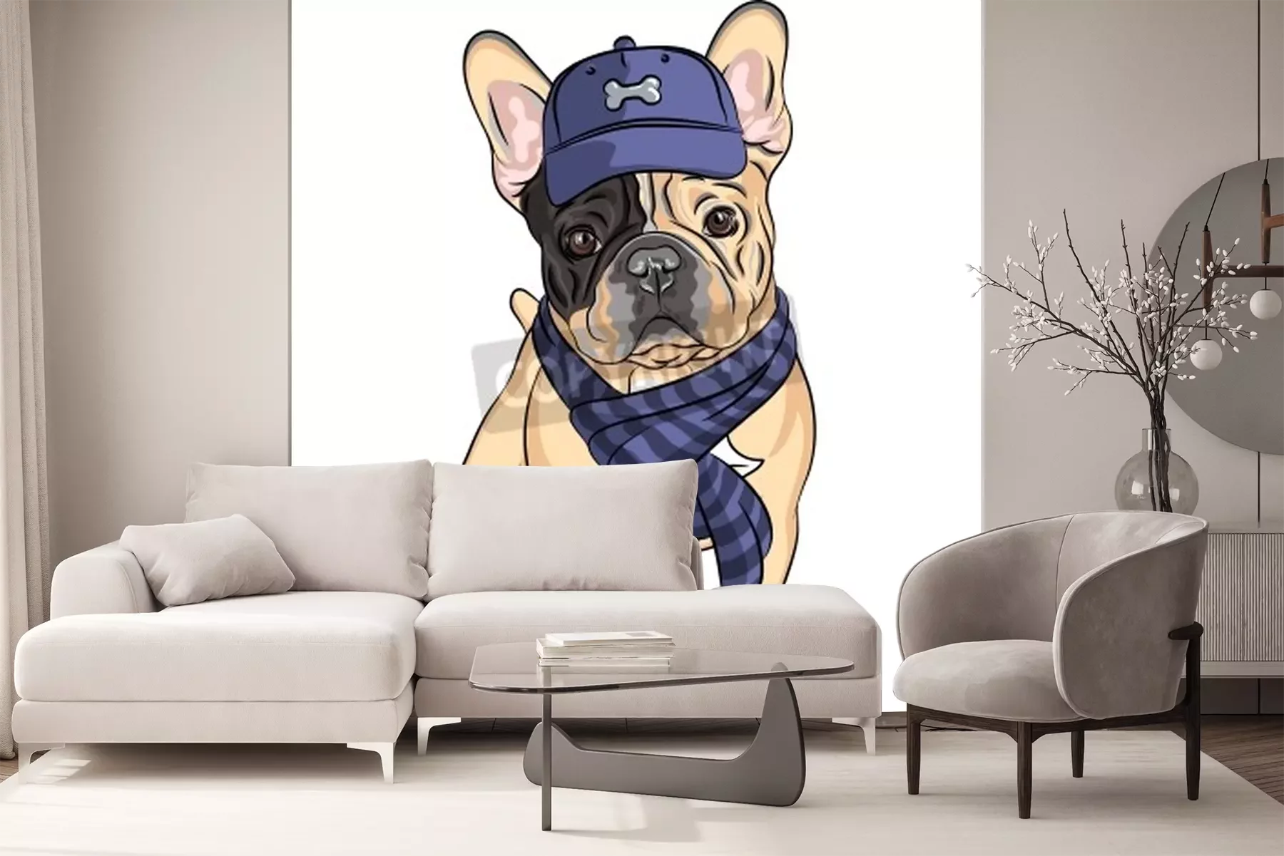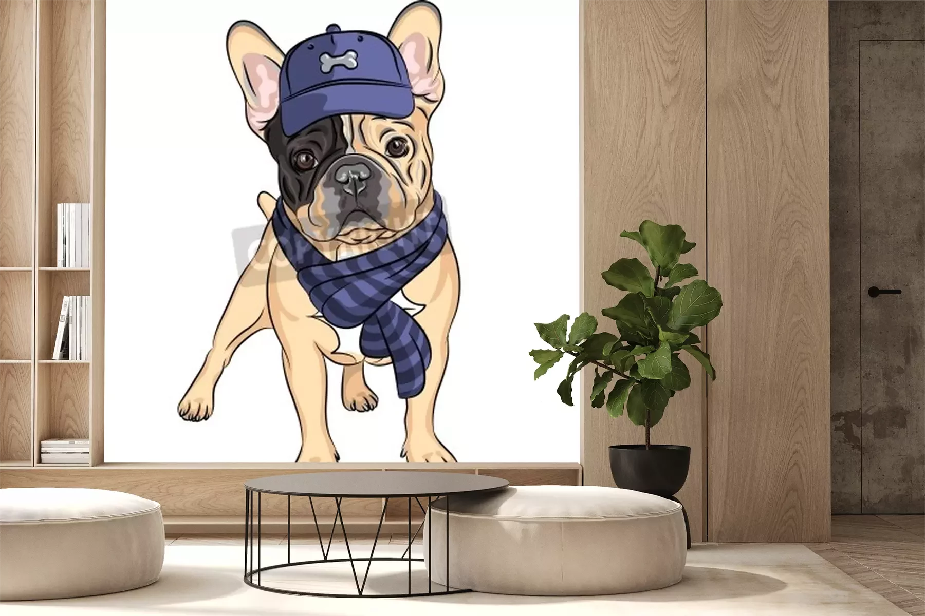 Sticker Vektor Hipster Hund Französisch Bulldogge Rasse in einer blauen Kappe und Schal