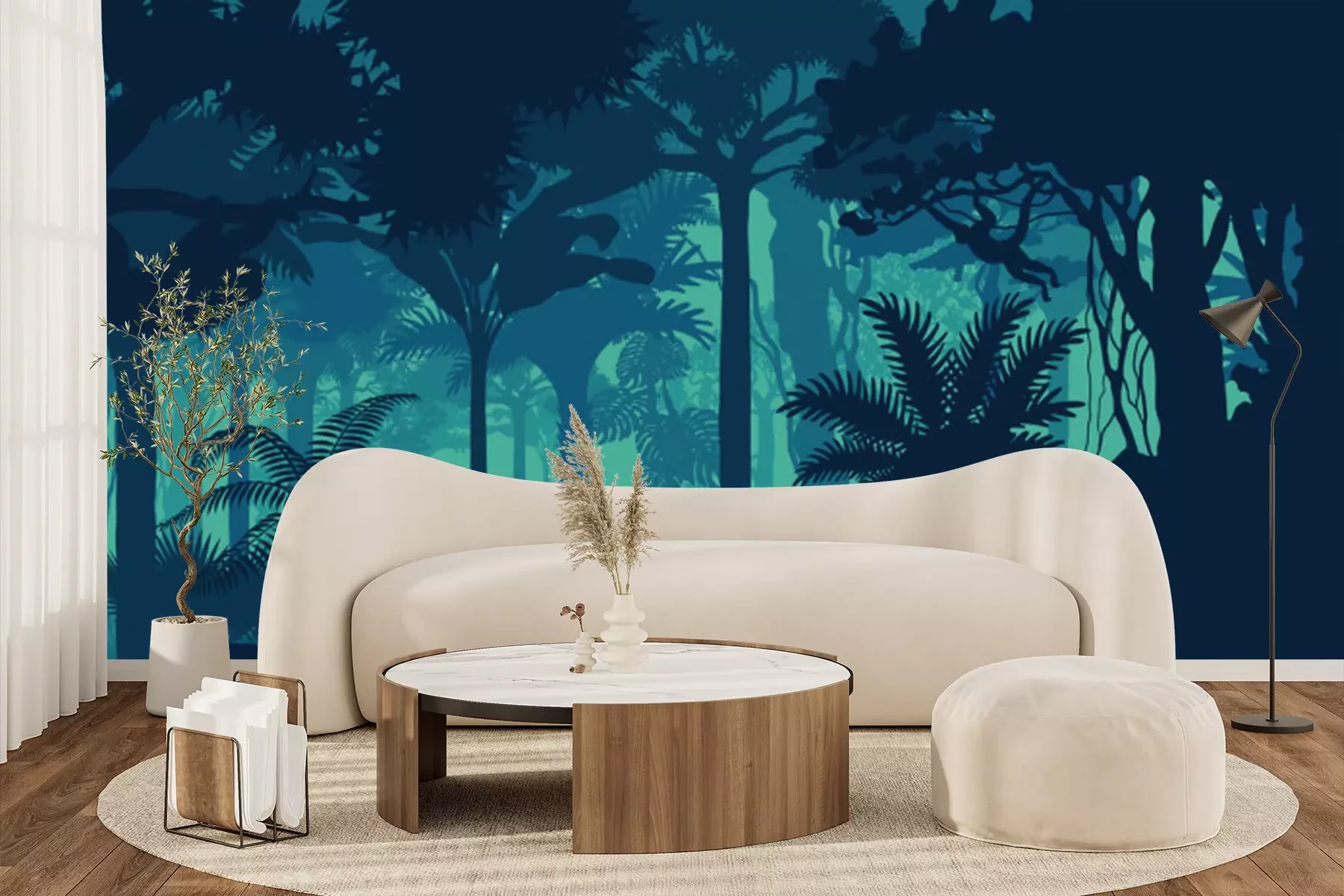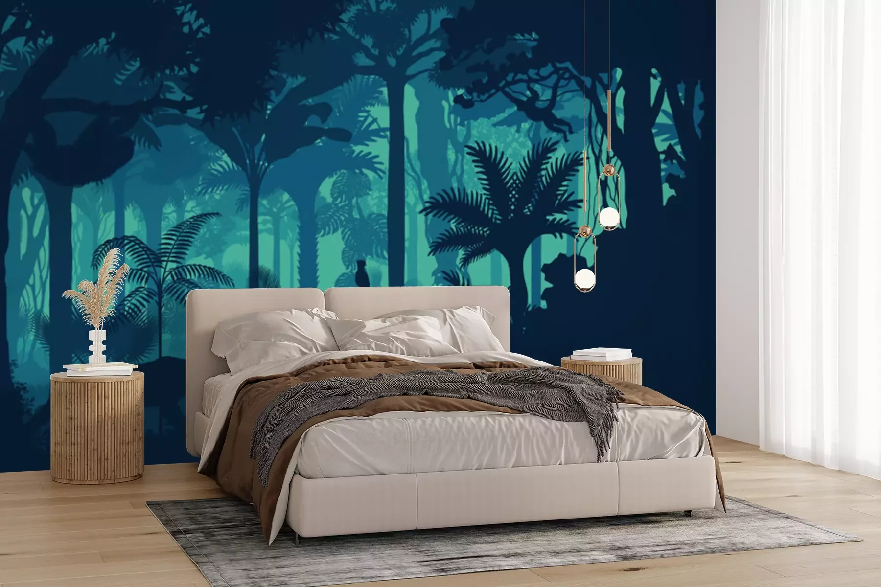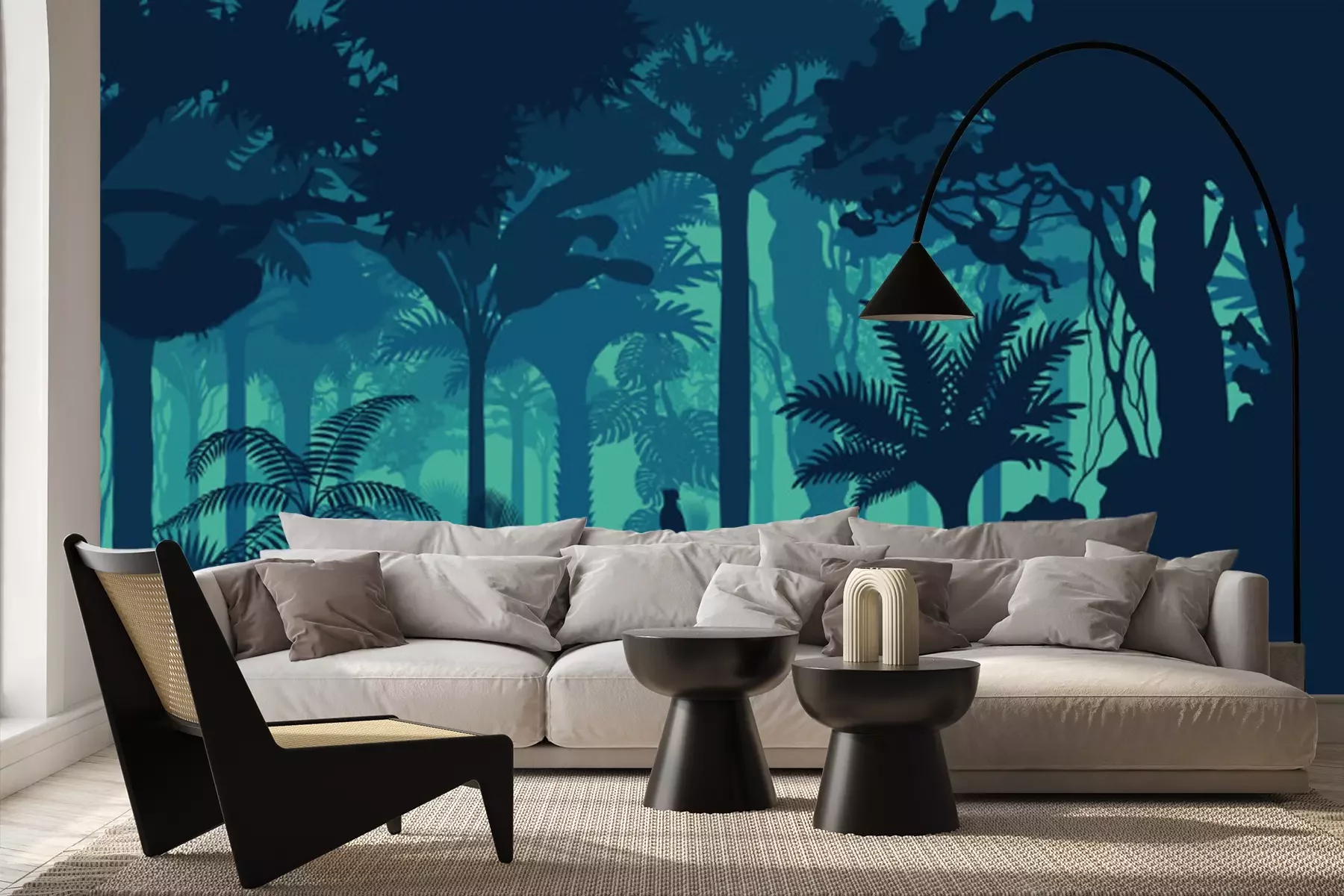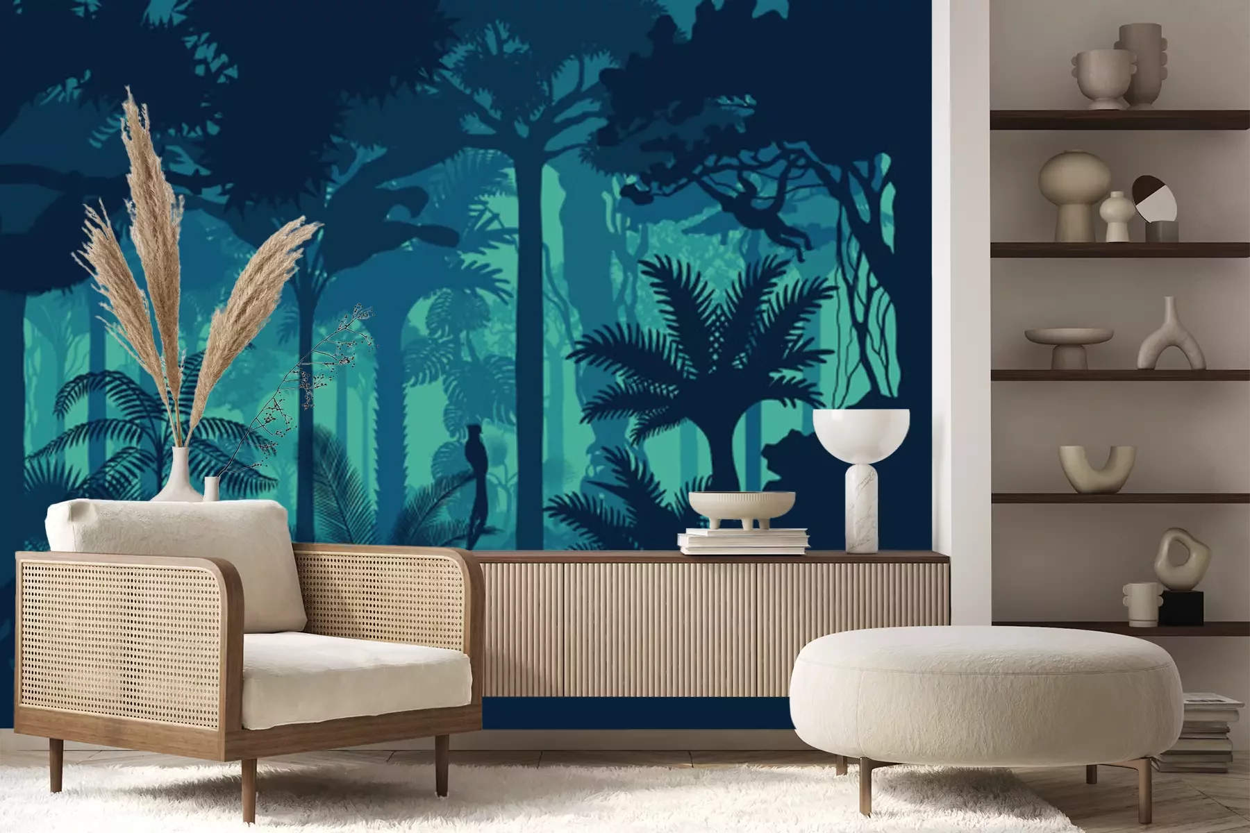 Sticker Vektorabend tropischen Regenwald Dschungel Hintergrund mit Jaguar, Faultier, Affe und qetzal