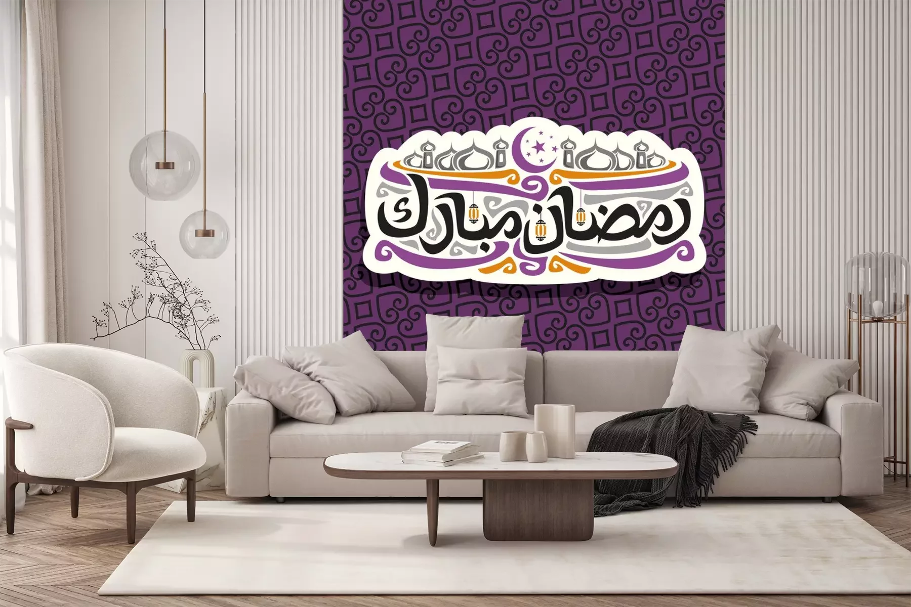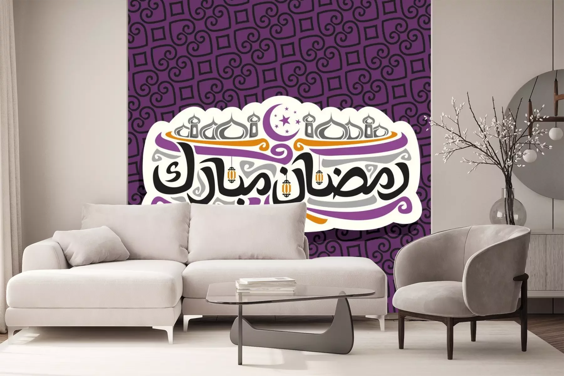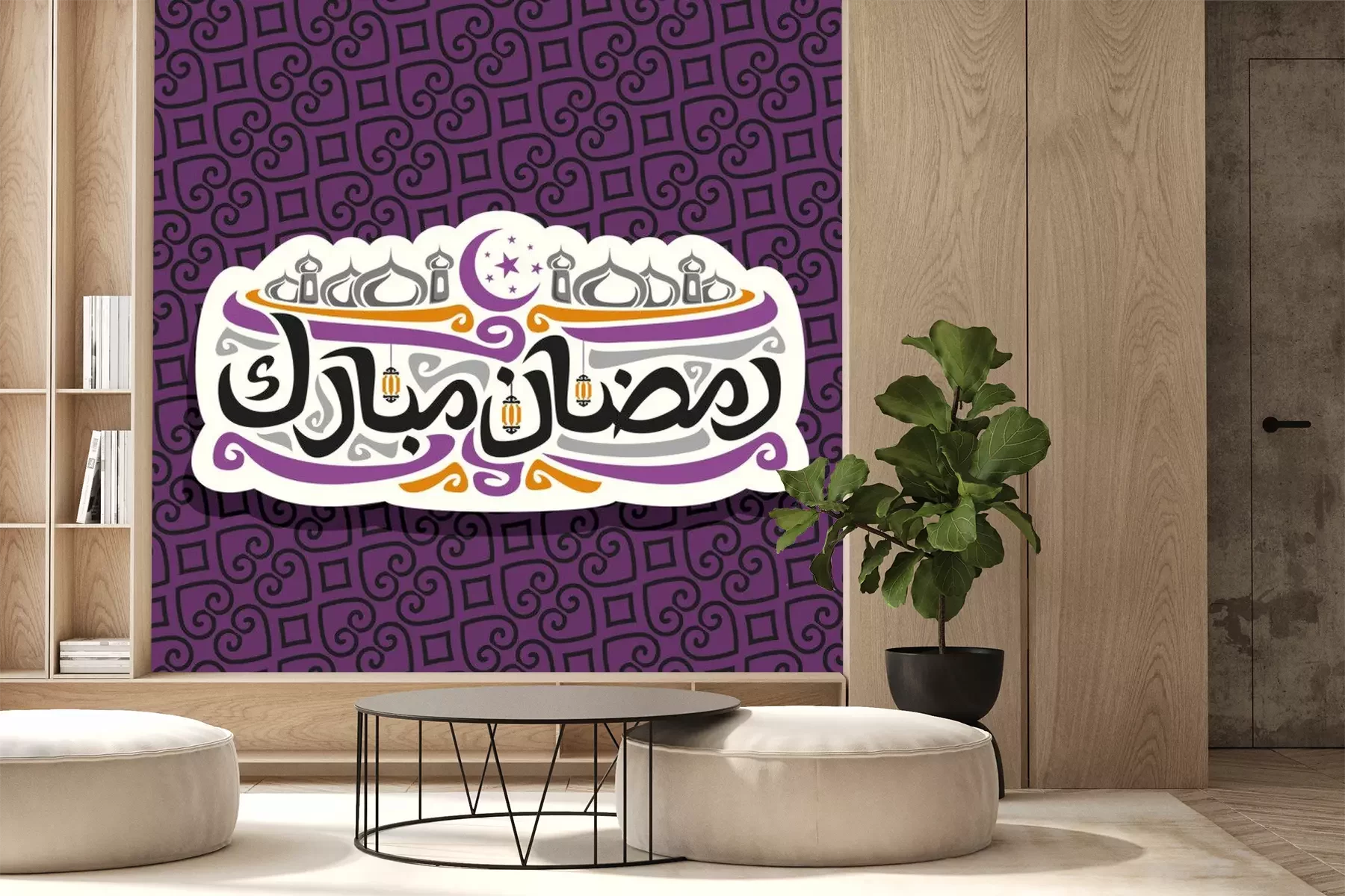 Sticker Vektorlogo für moslemische Kalligraphie Ramadan Mubarak, schnitt Papierzeichen mit ursprünglichem Bürstenschriftwort für Wörter Ramadan Mubarak auf Arabisch, Aufkleber mit Hauben von Mubarak-Moschee,
