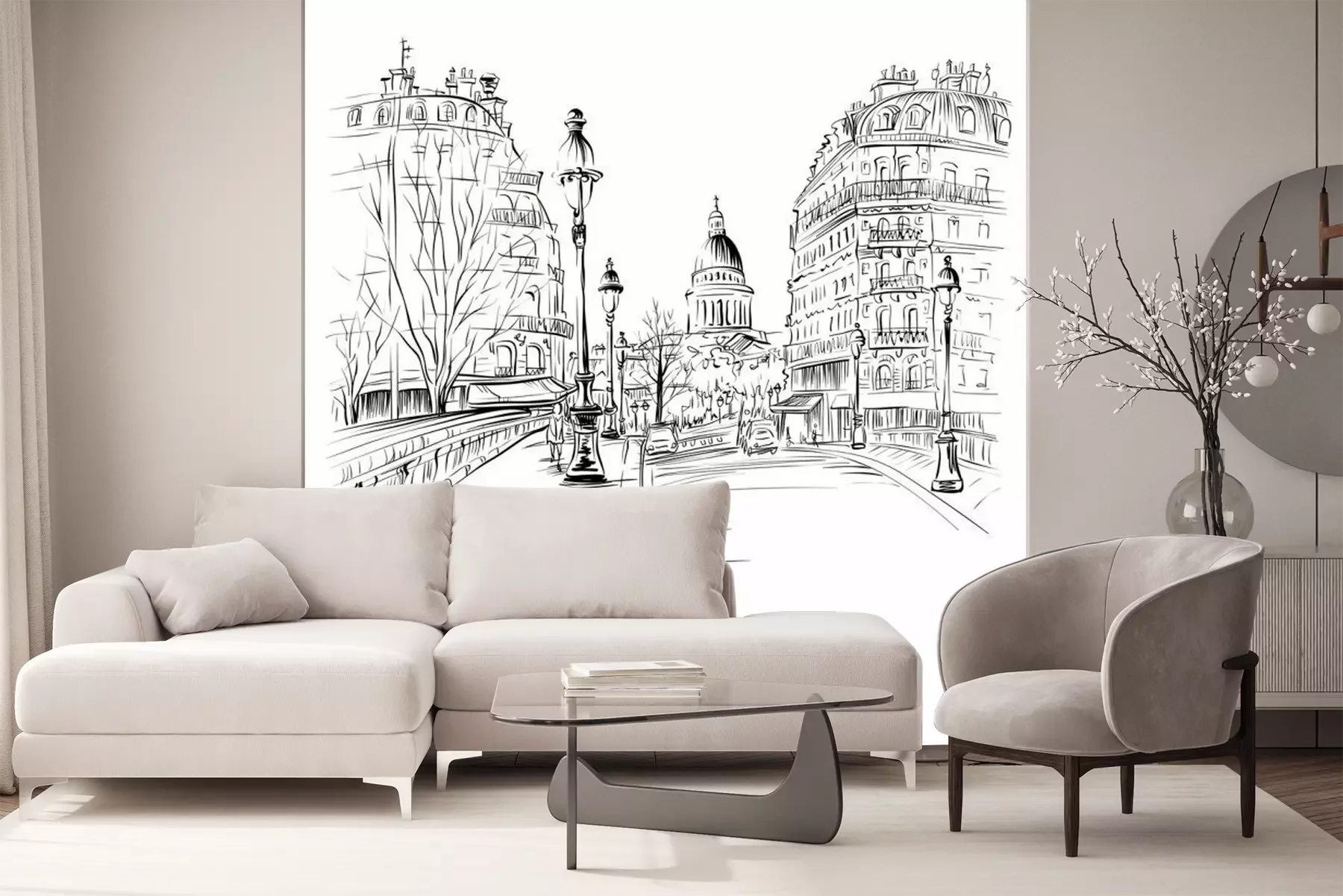 Sticker Vektorschwarzweiss-Handzeichnung. Brücke über Fluss Seine Pont Louis Philippe nahe dem Ile de la Cite am Wintermorgen, Pantheon im Hintergrund, Paris, Frankreich.