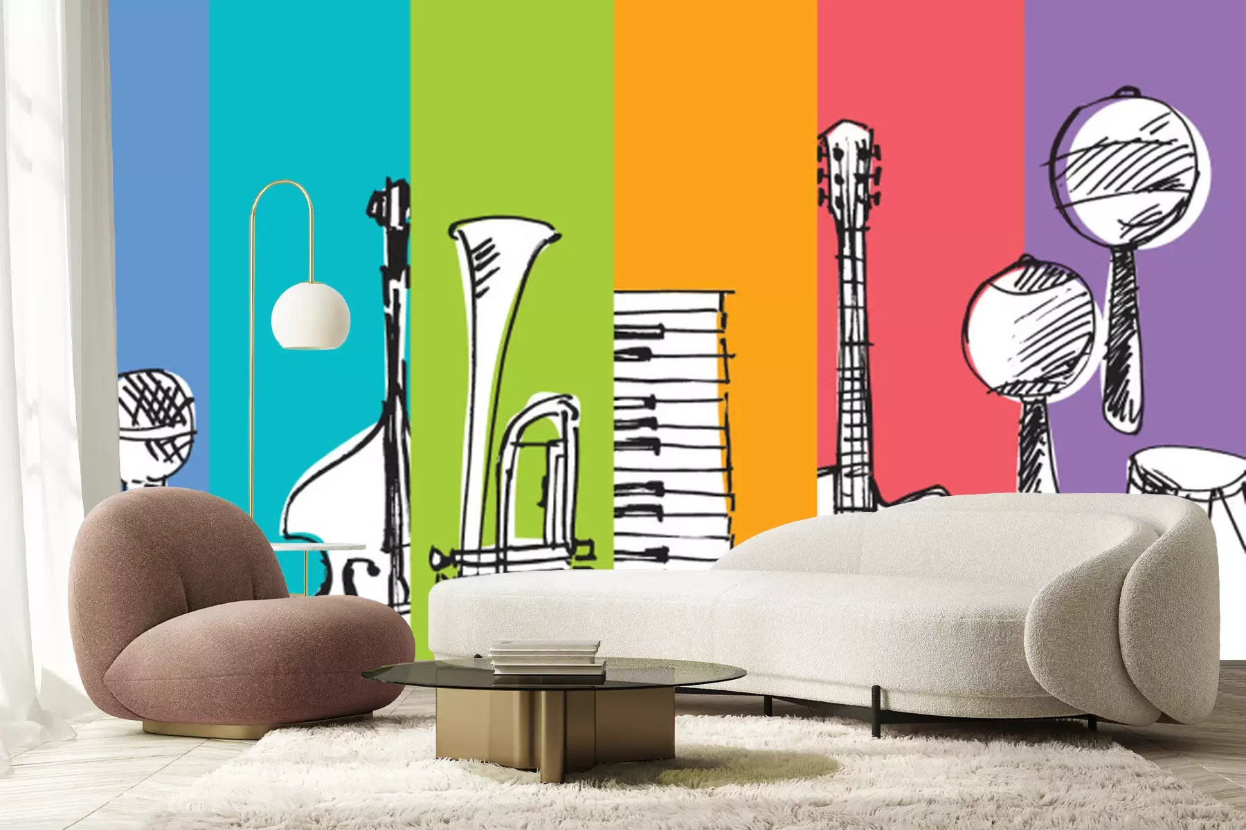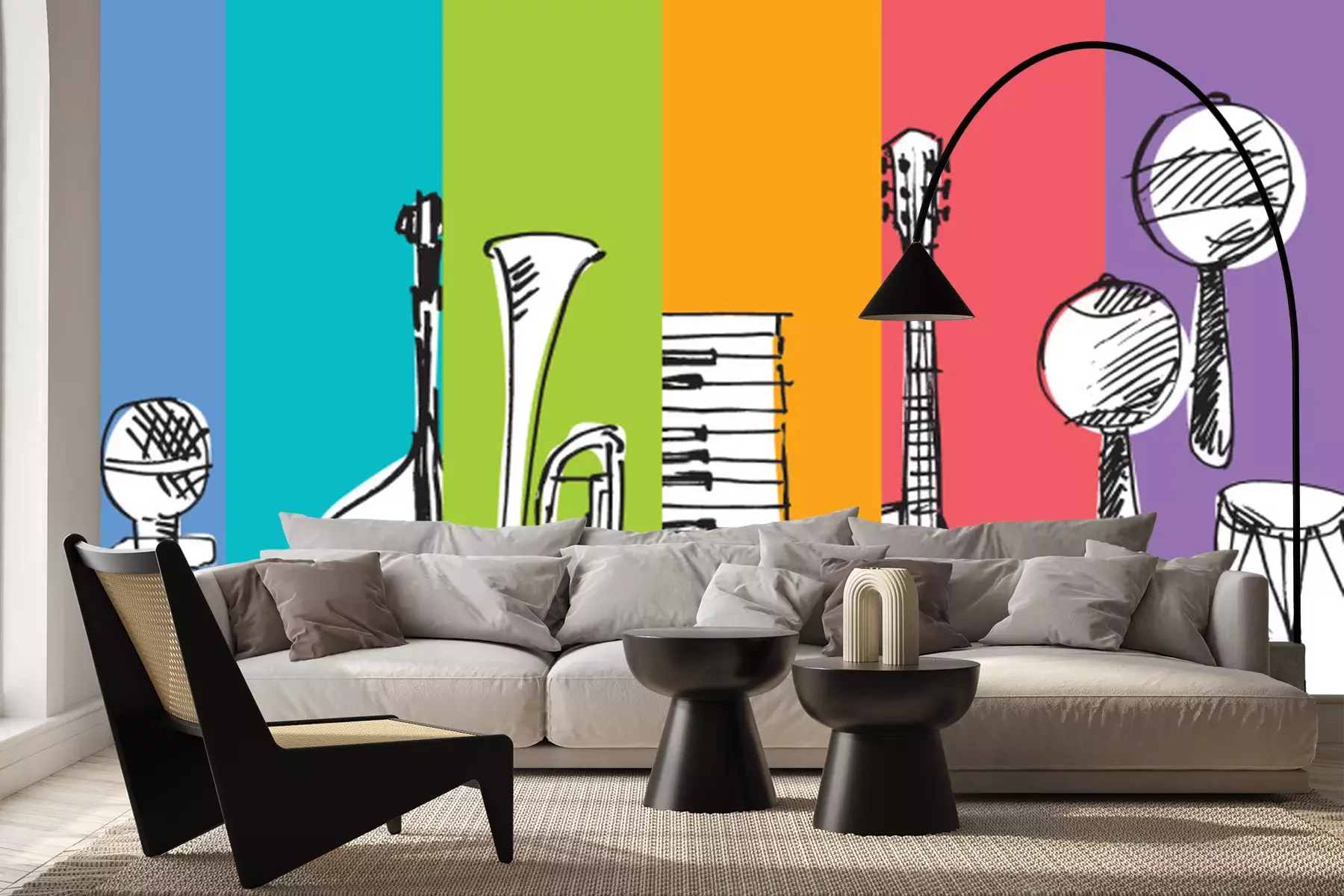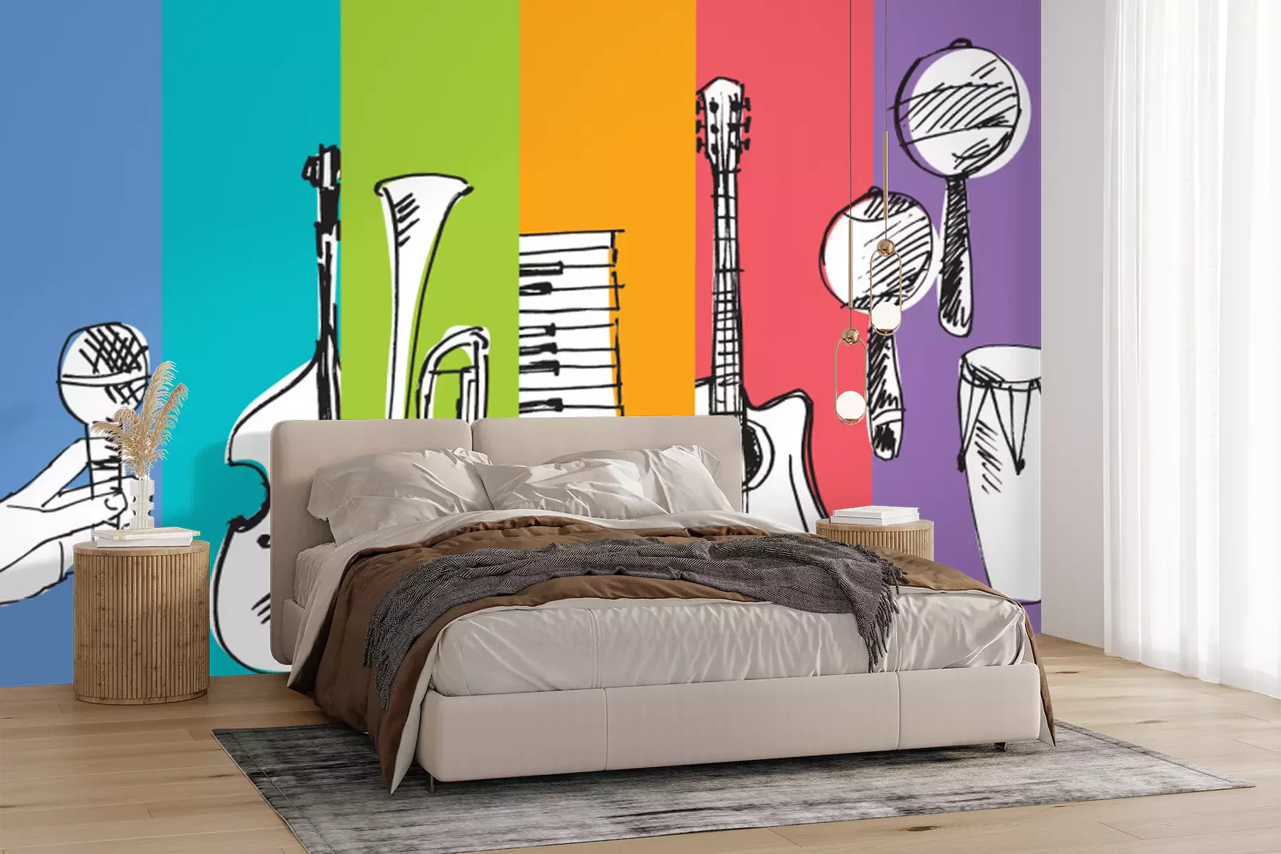 Sticker Verschiedene Musikinstrumente auf buntem Hintergrund
