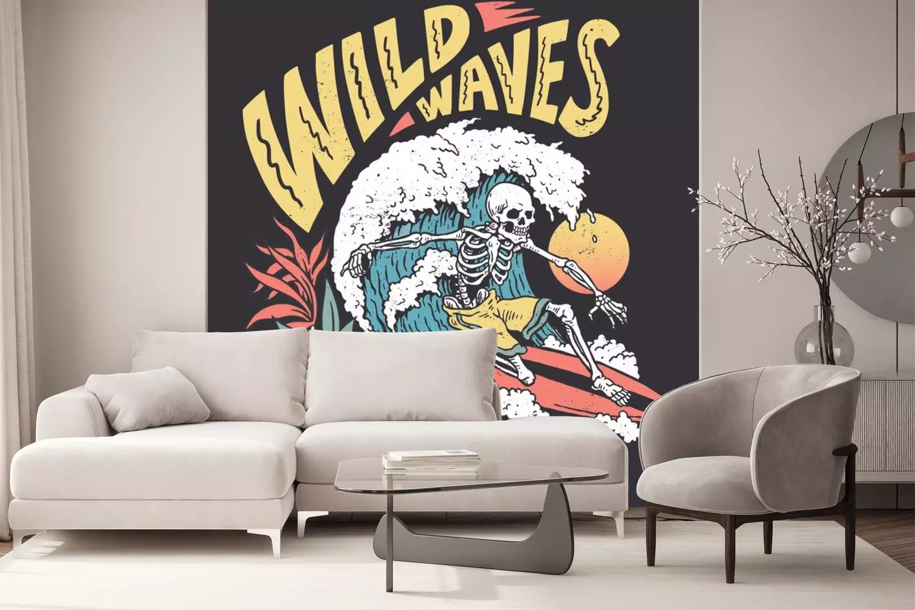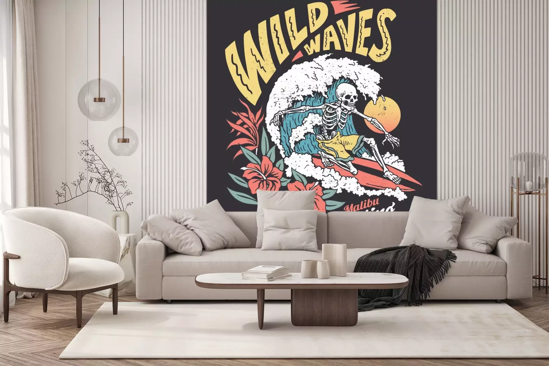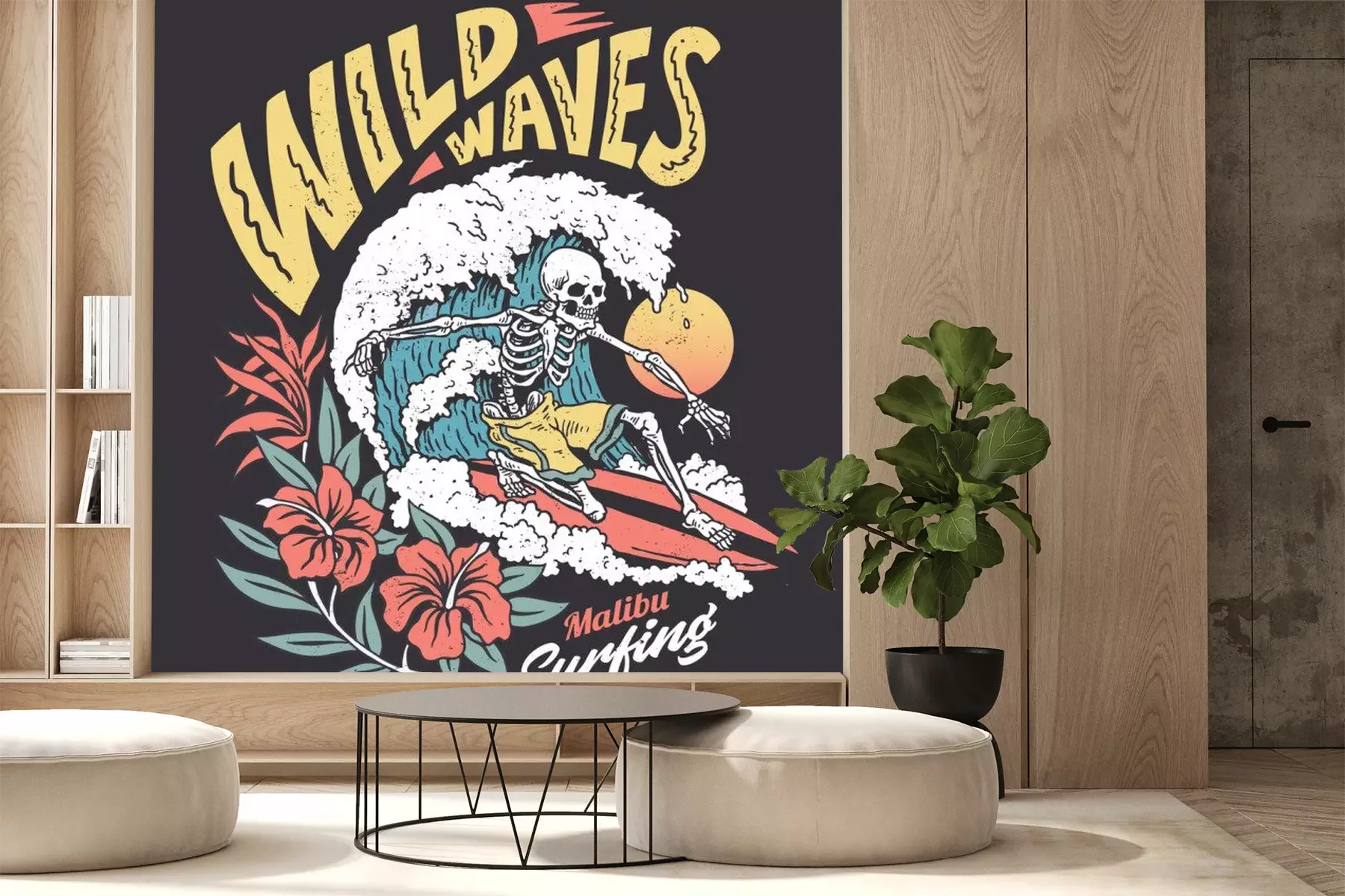 Sticker Vintage graphic of a surfing skeleton with hibiscus flowers
