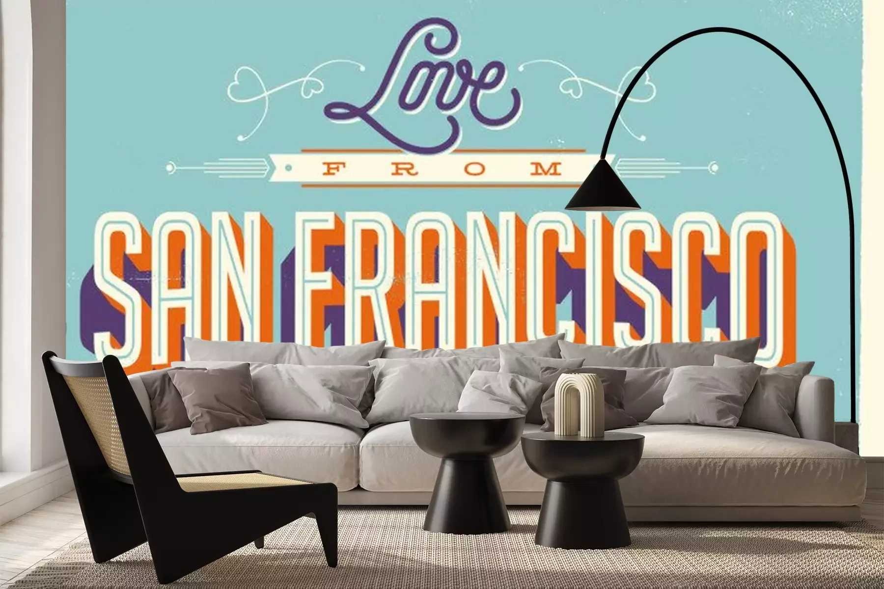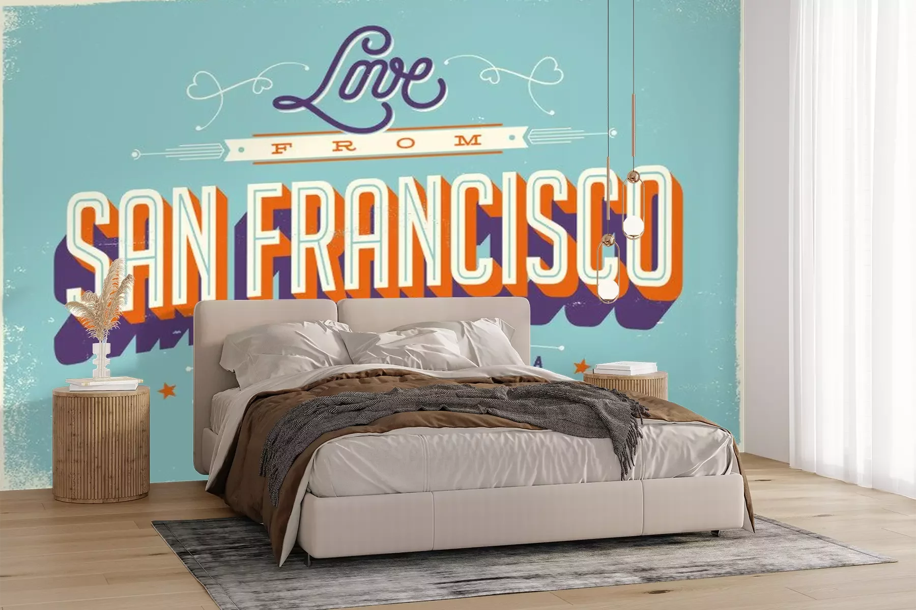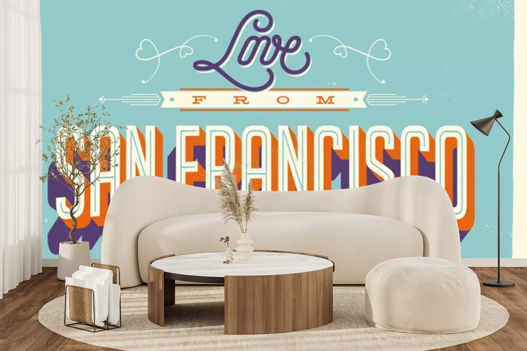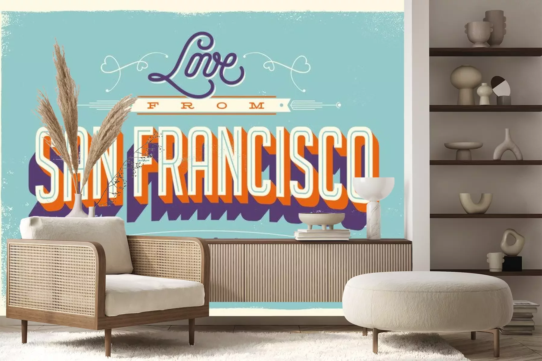 Sticker Vintage-Stil Touristische Grußkarte mit Textur-Effekte - Liebe aus San Francisco, Kalifornien - Vektor EPS10.