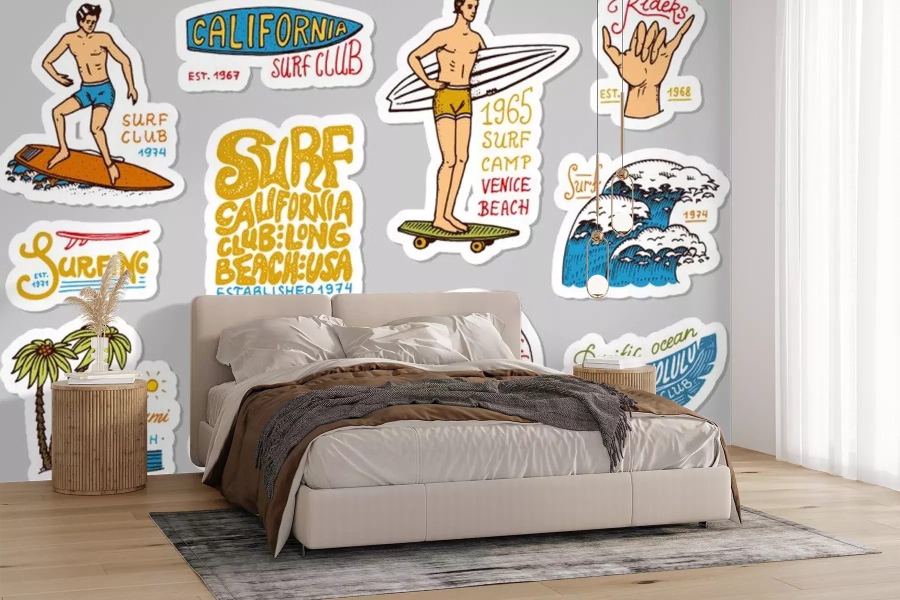 Sticker Vintage Surfer Abzeichen. Tropische Aufkleber und Kalifornien. Welle, Palme und Meer. Mann auf dem Surfbrett, Sommerstrand und Meer. Gravierte Emblem Hand gezeichnet. Banner oder Poster. Sport in Hawa