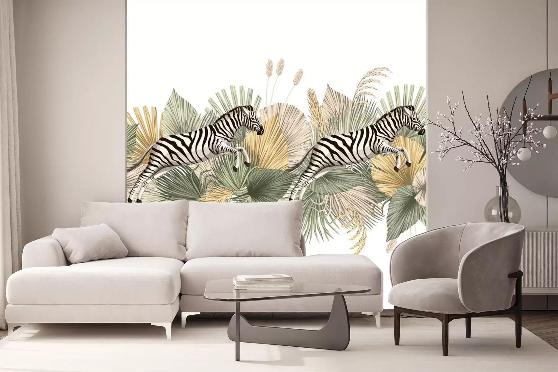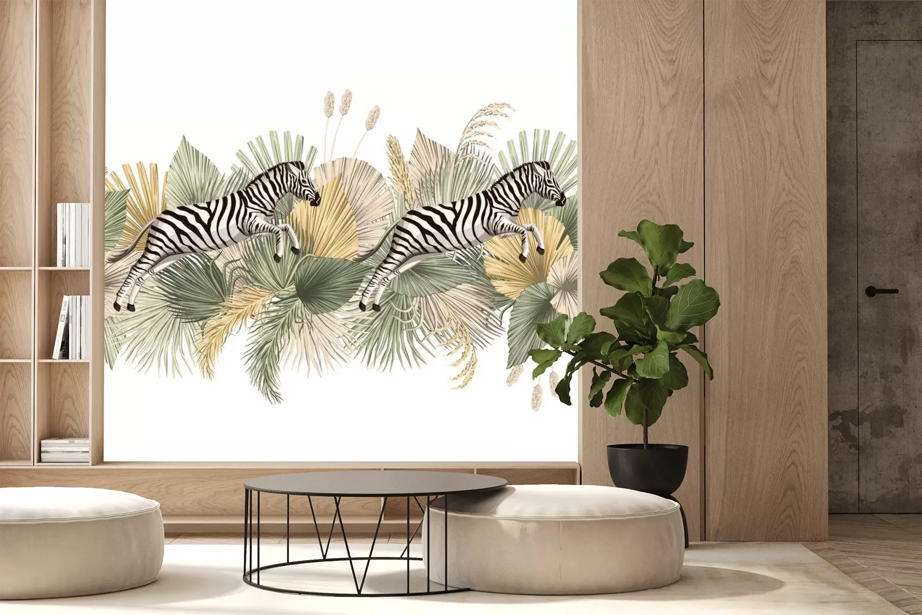 Sticker Vintage tropical palm leaves, zebra animal floral seamless border white background. Exotic safari wallpaper.