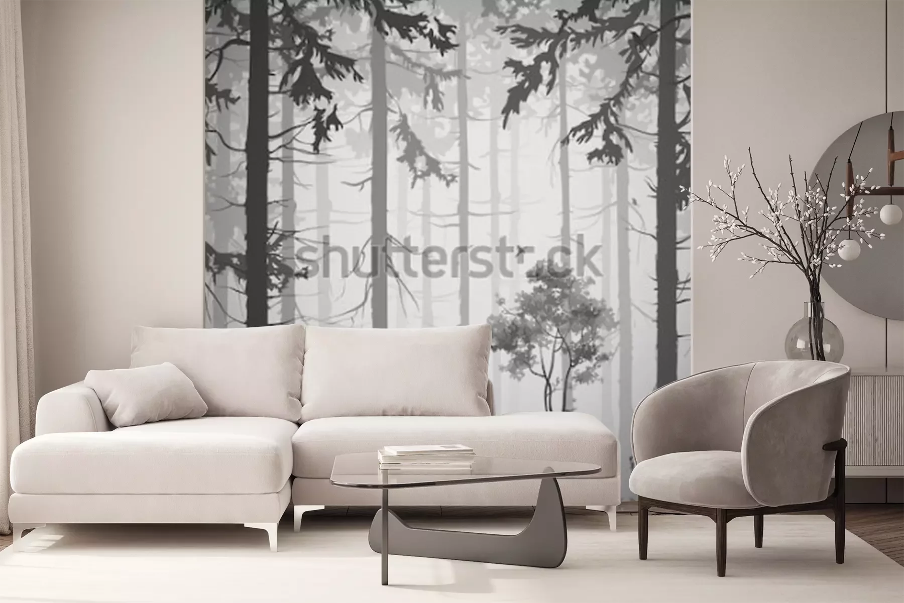Sticker Waldluftlandschaft mit Vögeln, Schwarzweiss, Vektorillustration