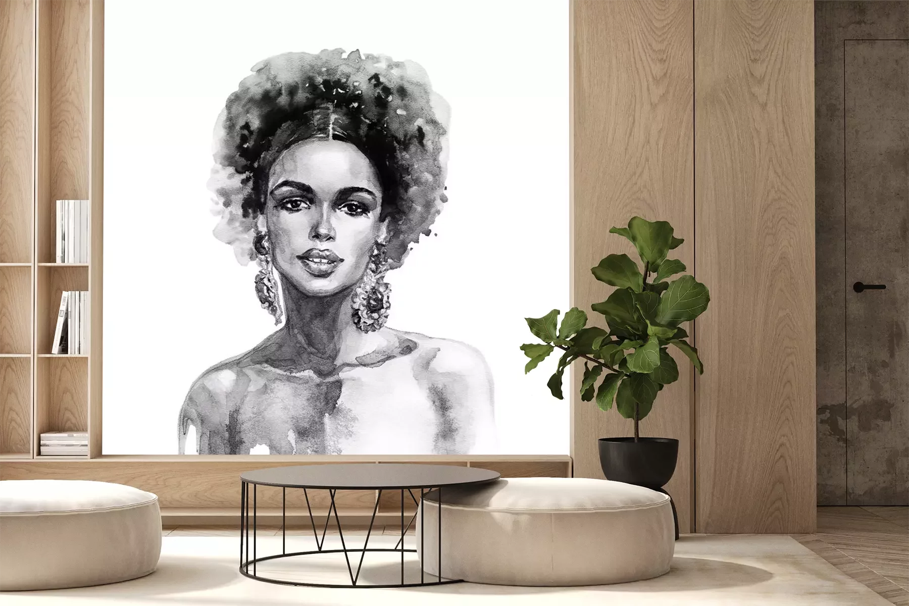 Sticker Watercolor beauty african woman. Painting fashion illustration. Hand drawn portrait of pretty girl on white background