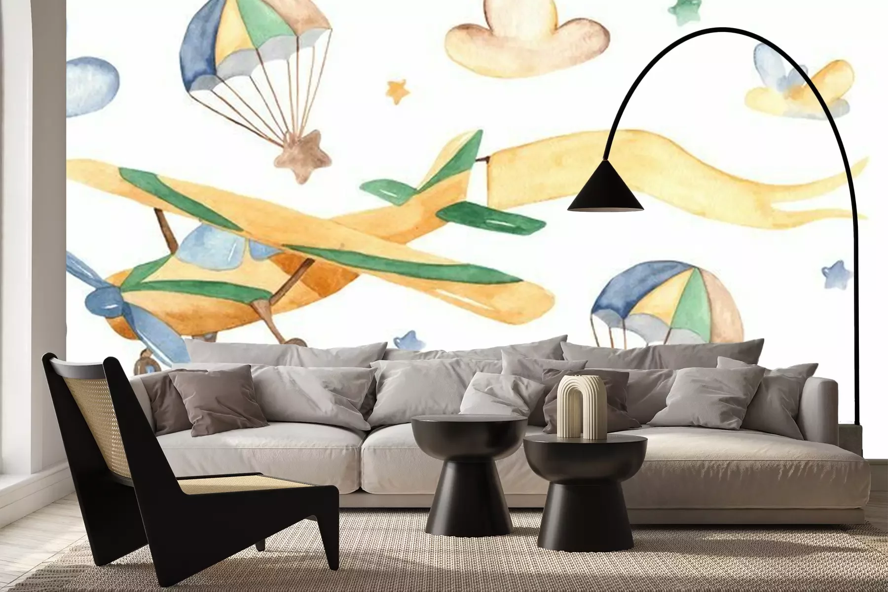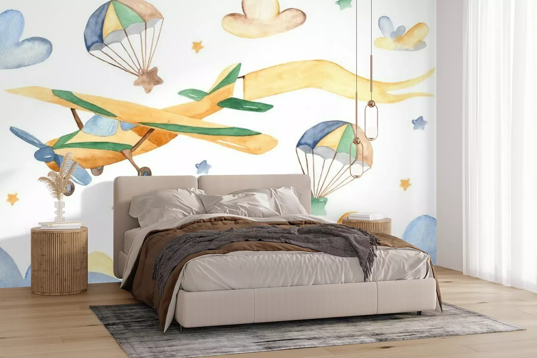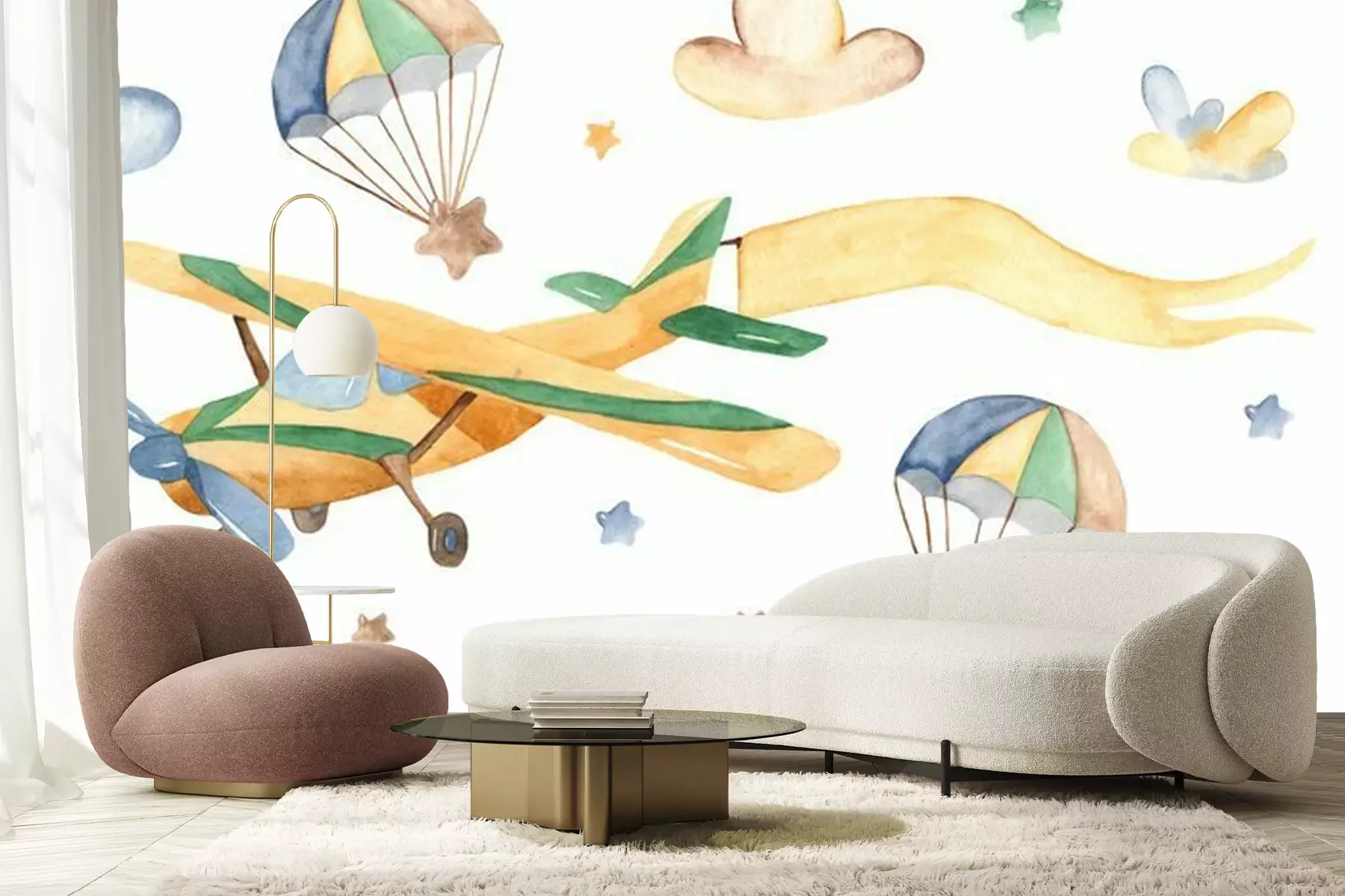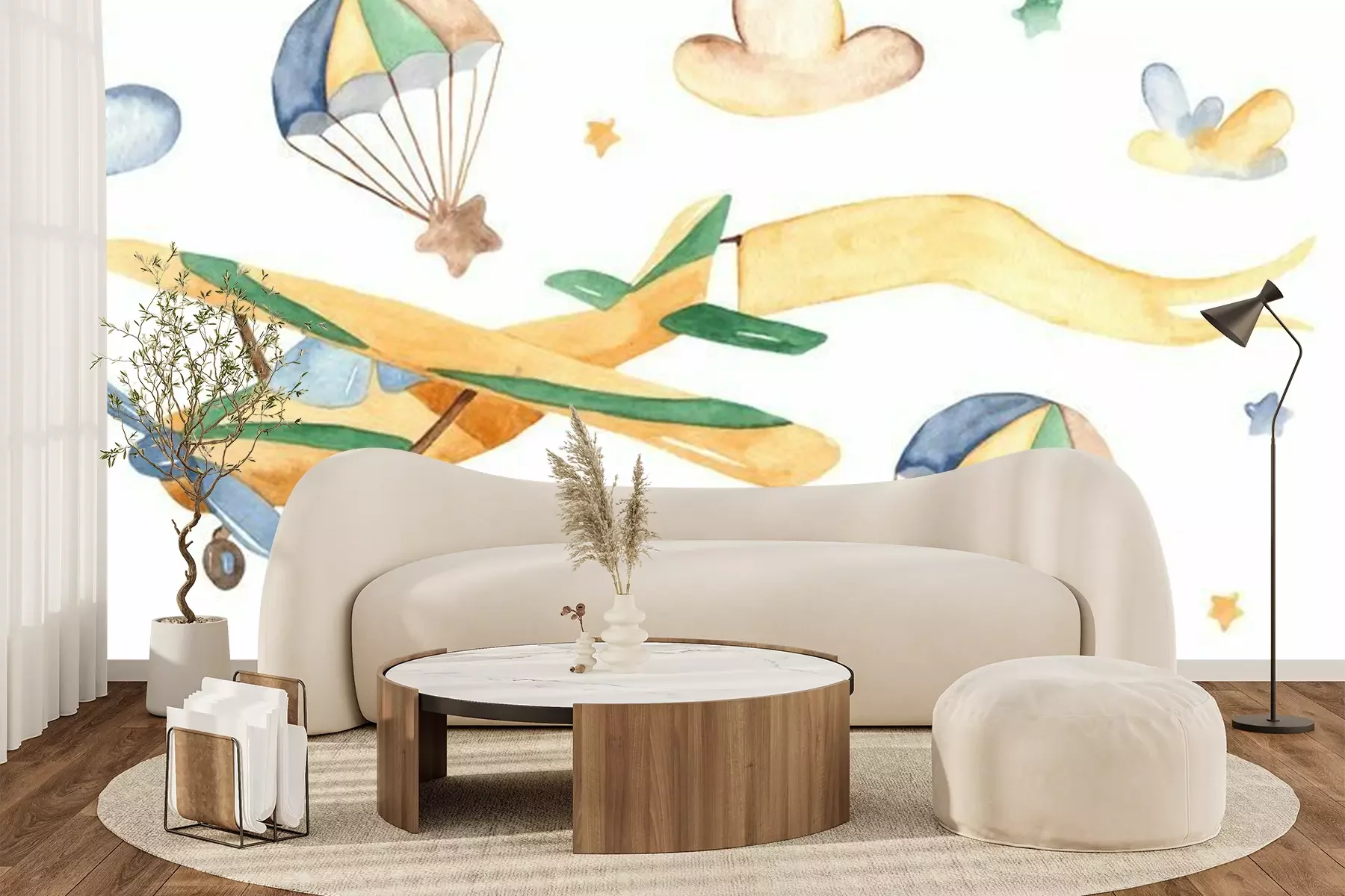 Sticker Watercolor card with cute airplane and clouds. Child illustration for baby shower, kindergarten, cards, invitations.