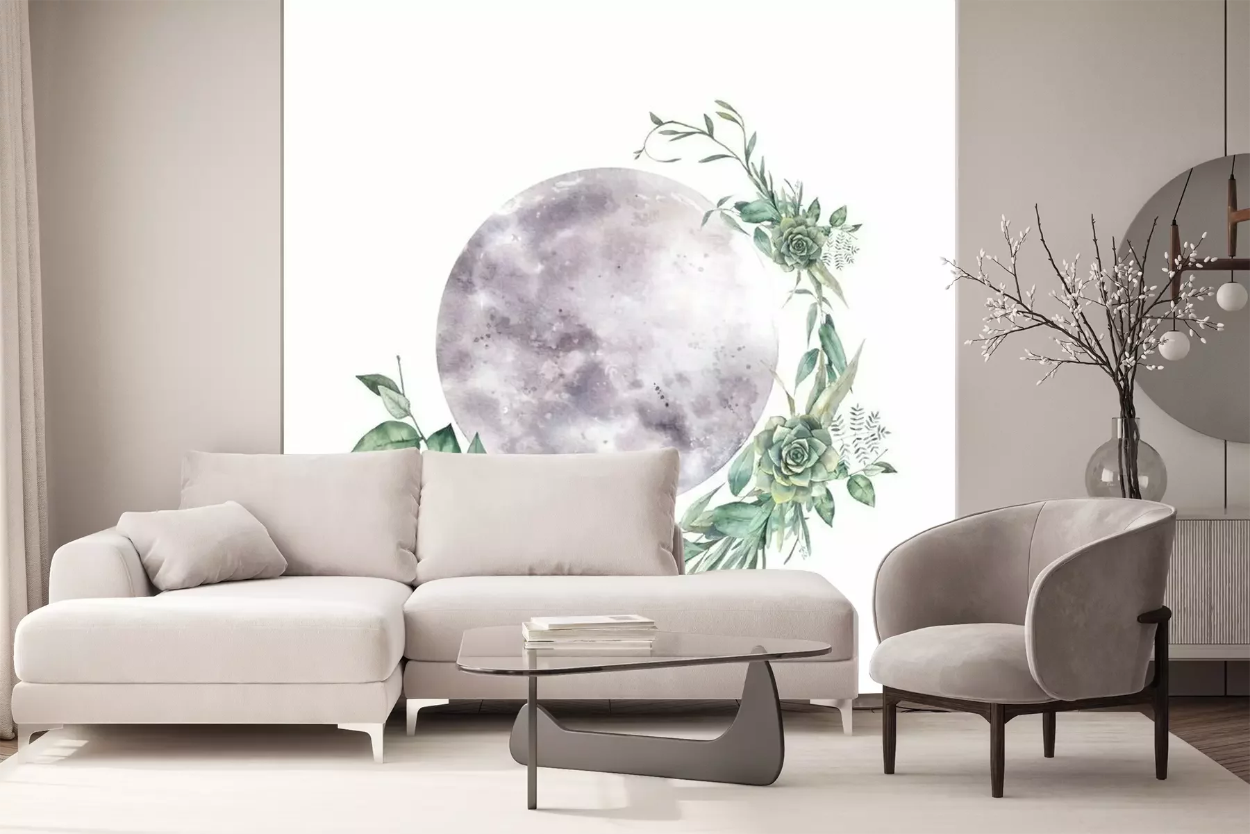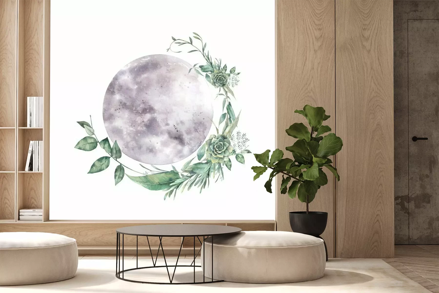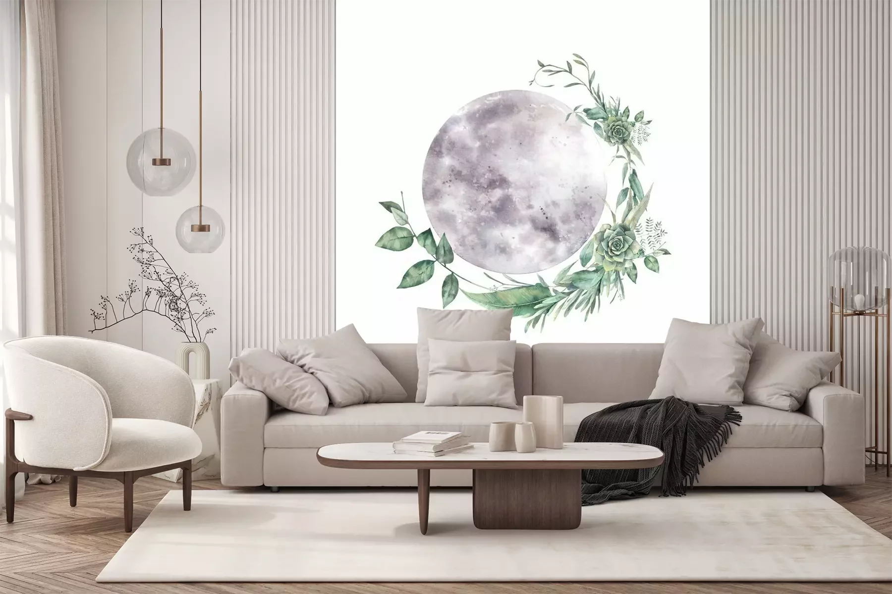Sticker Watercolor moon and floral wreath. Natural illustration for logo, tattoo, banner, sticker. Isolated art on white background