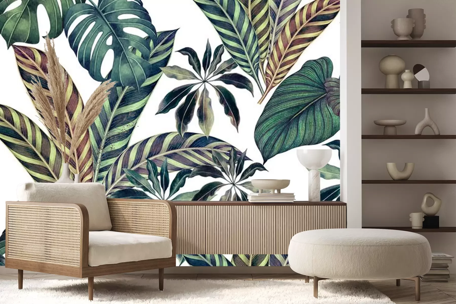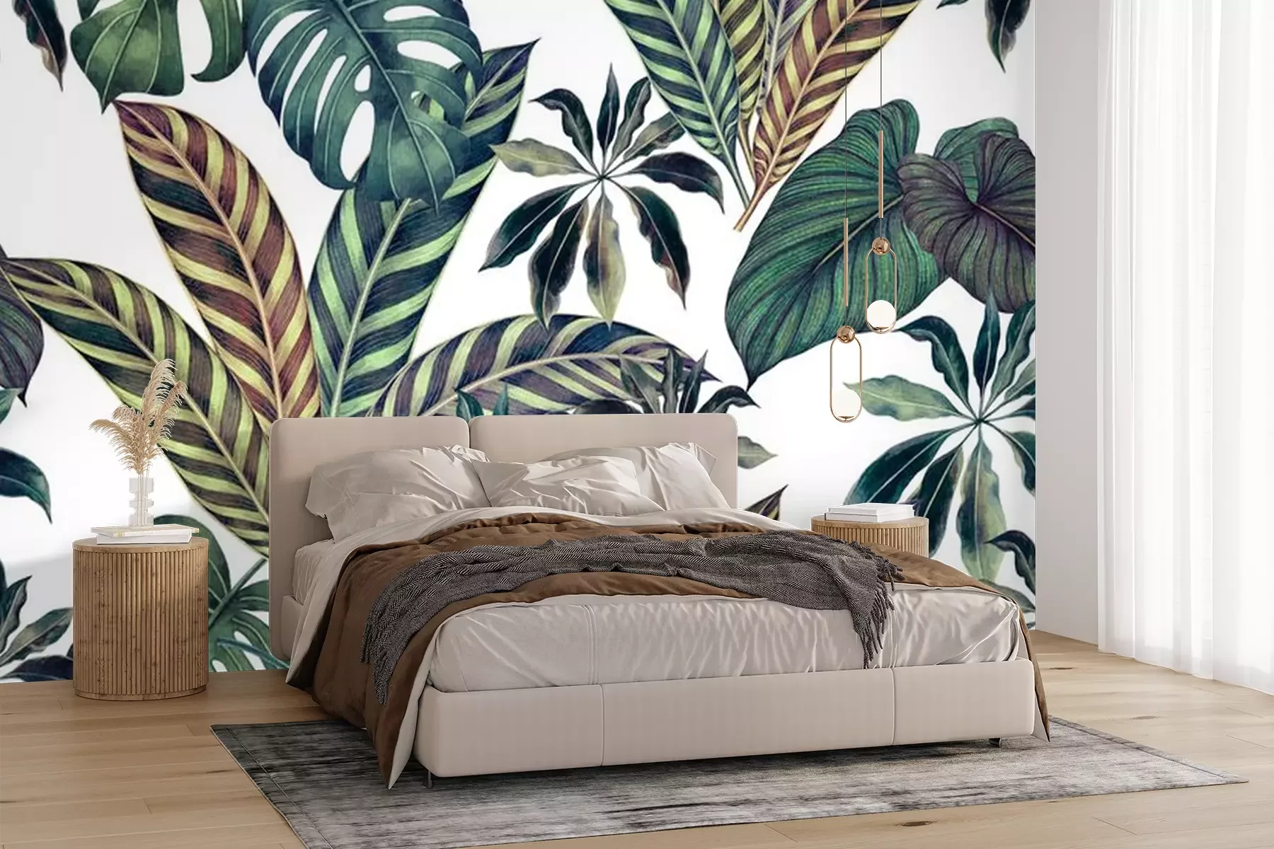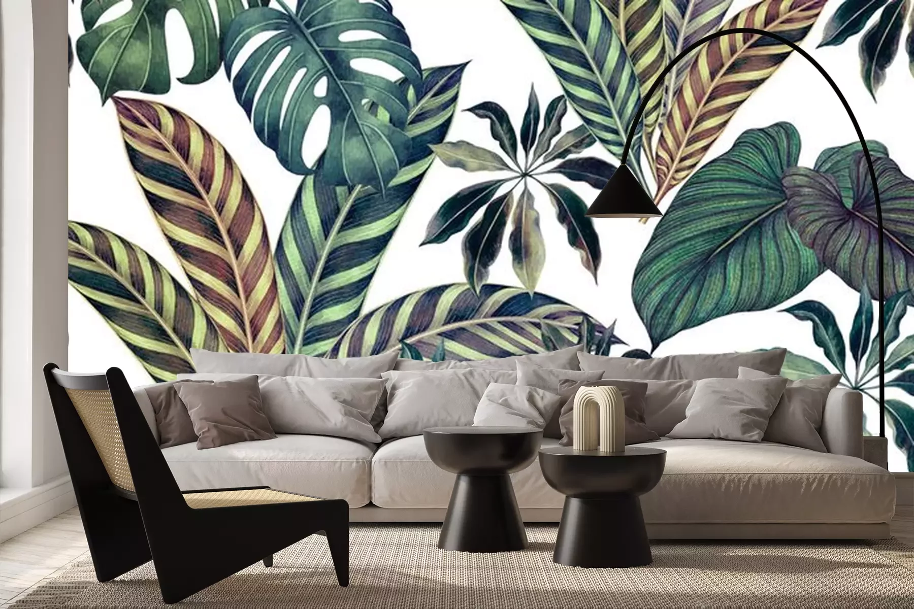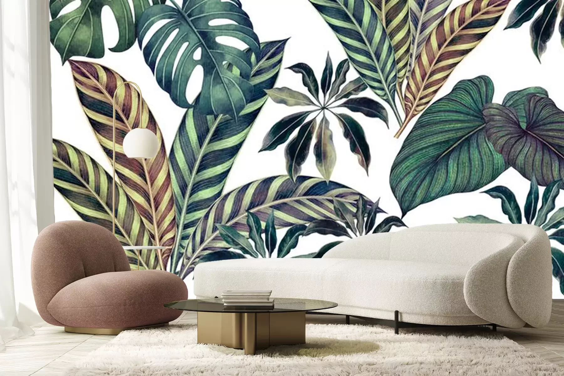 Sticker Watercolor painting colorful tropical leaf,green leave seamless pattern background.Watercolor hand drawn illustration tropical exotic leaf prints for wallpaper,textile Hawaii aloha summer style..