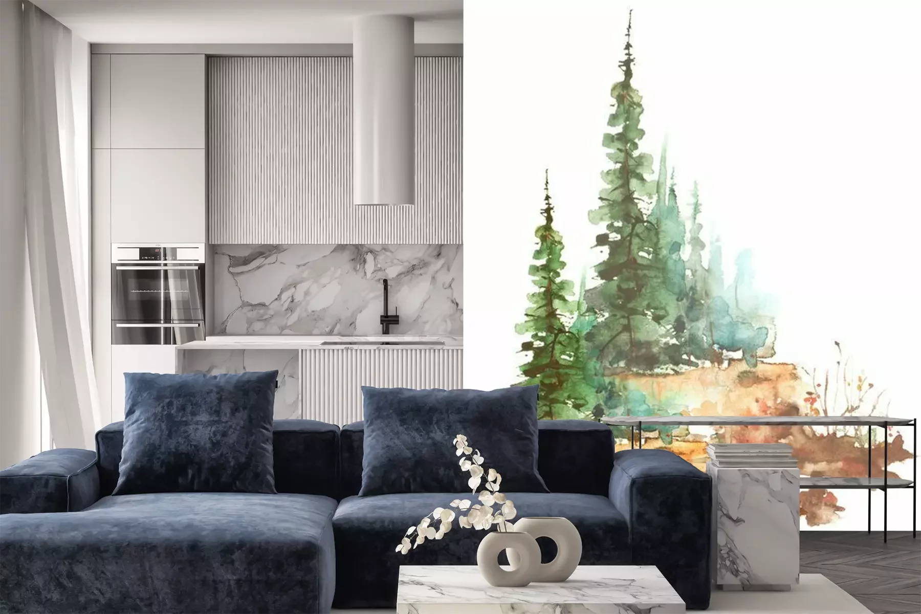 Sticker Watercolor trees, forest, pine, green spruce, landscape. Summer forest landscape, bushes, wild grass, slope. Illustration made for a different design. Isolated on white background. Abstract paint