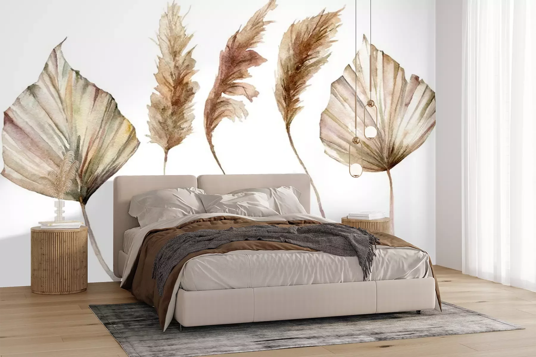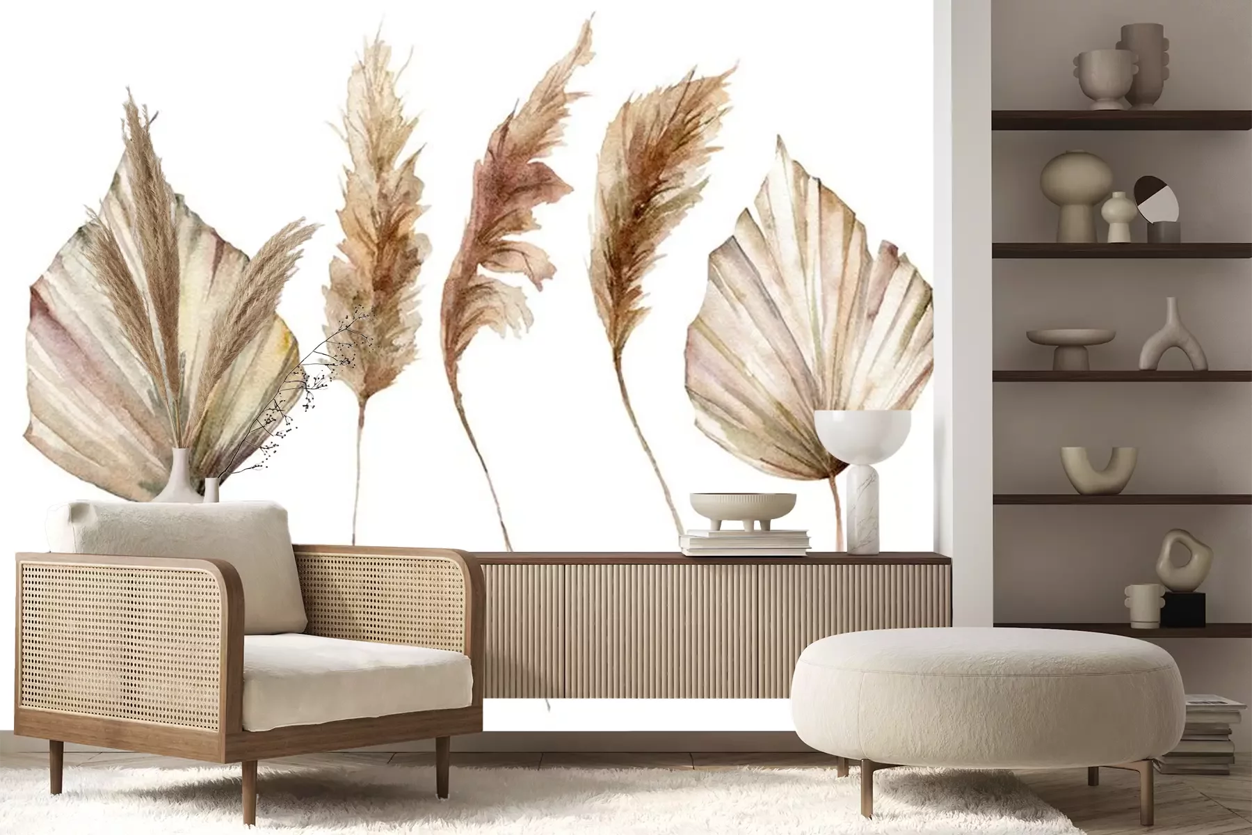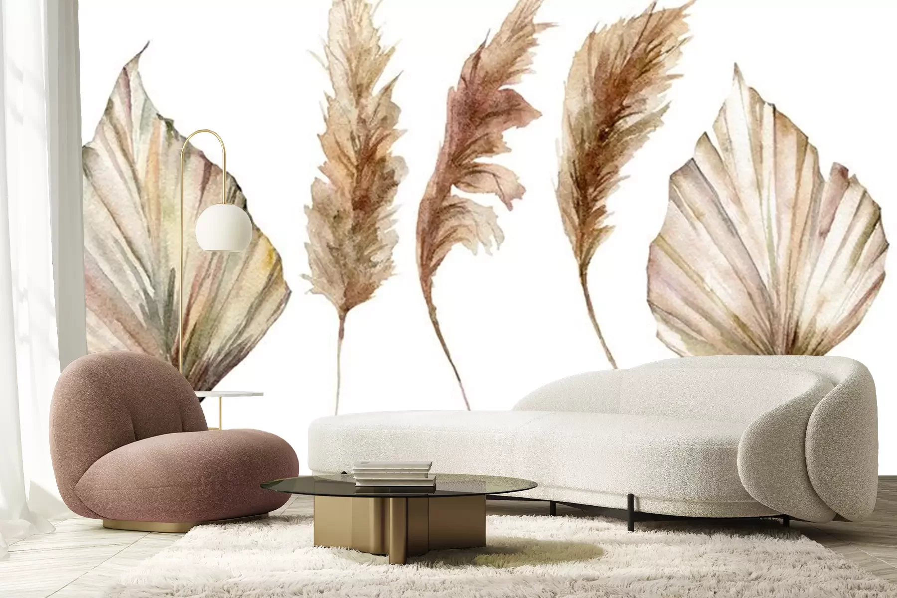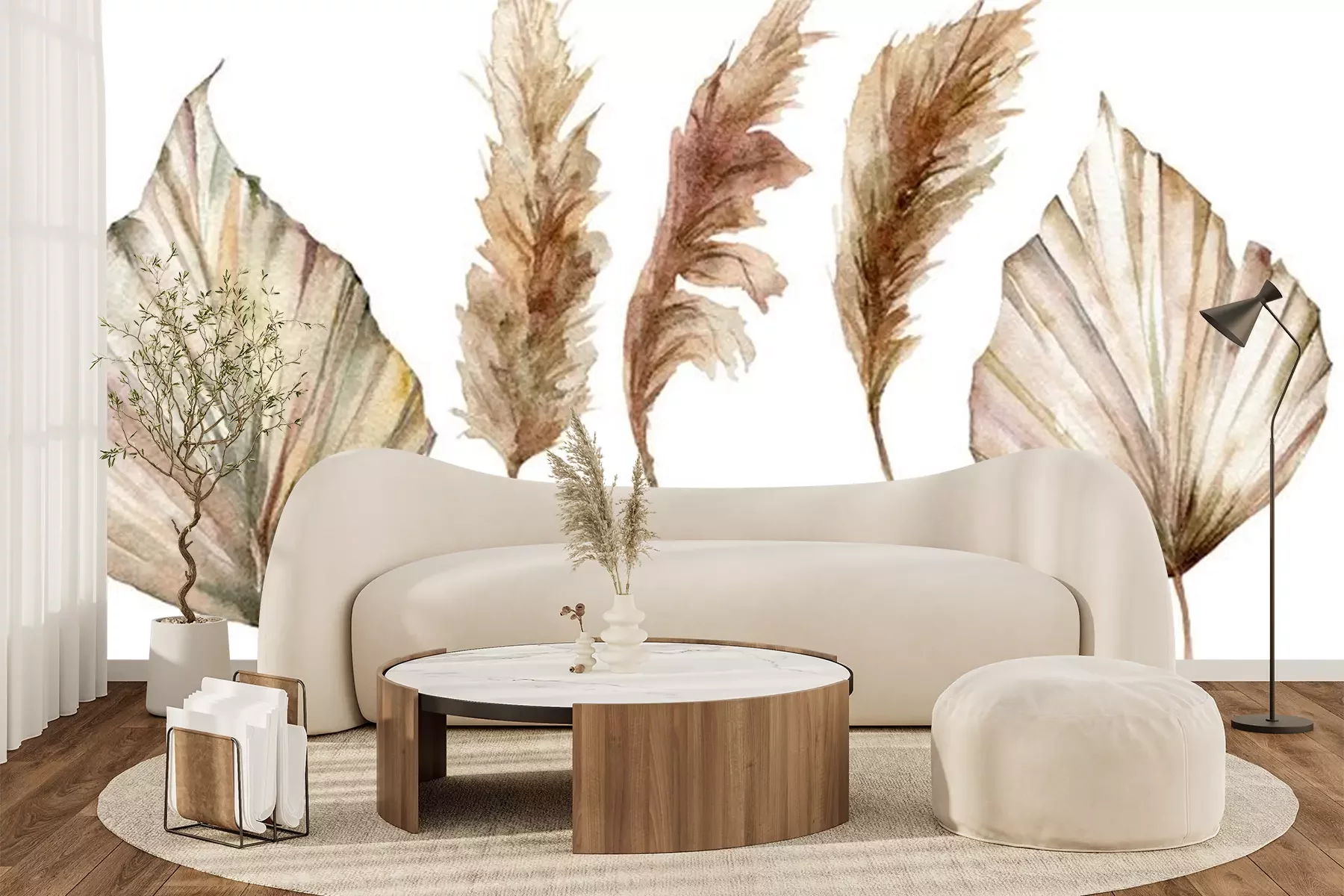 Sticker Watercolor tropical set with dry palm leaves and pampas grass. Hand painted exotic leaves isolated on white background. Floral illustration for design, print, fabric or background.