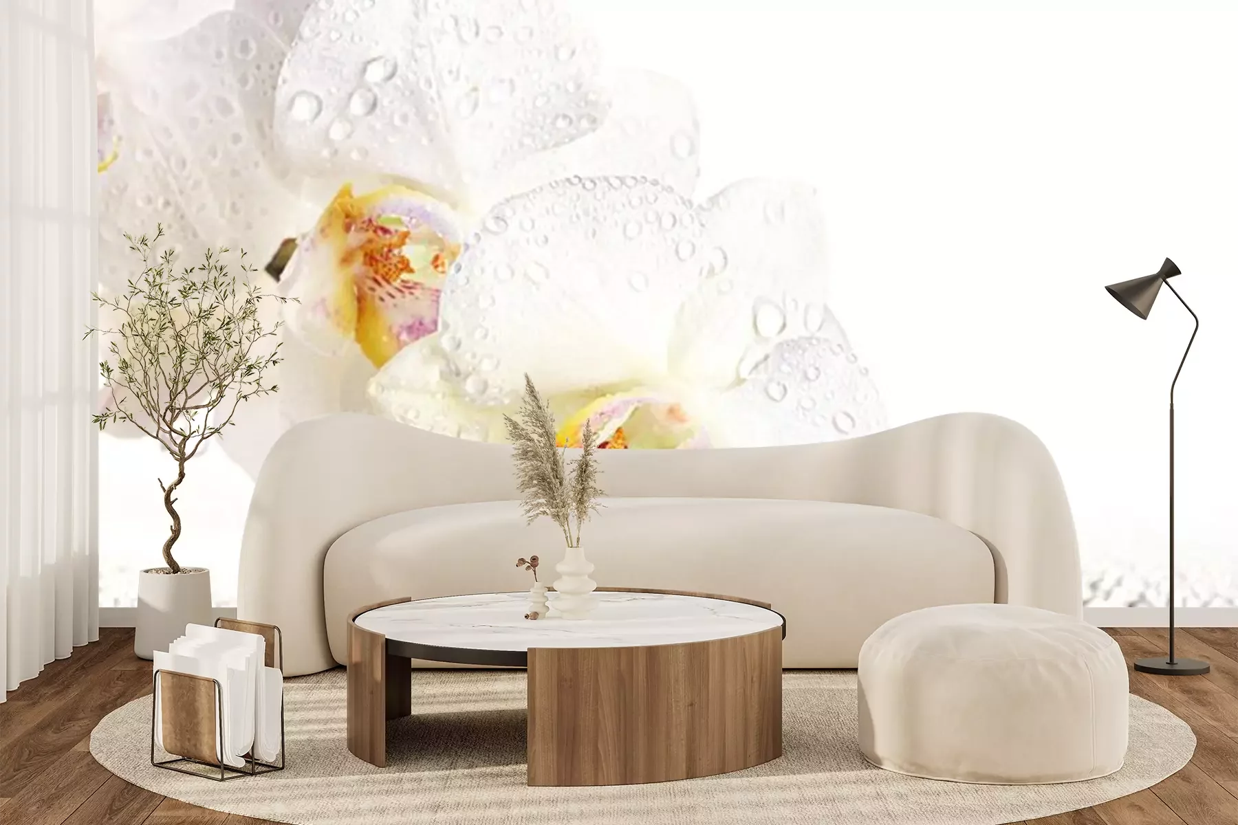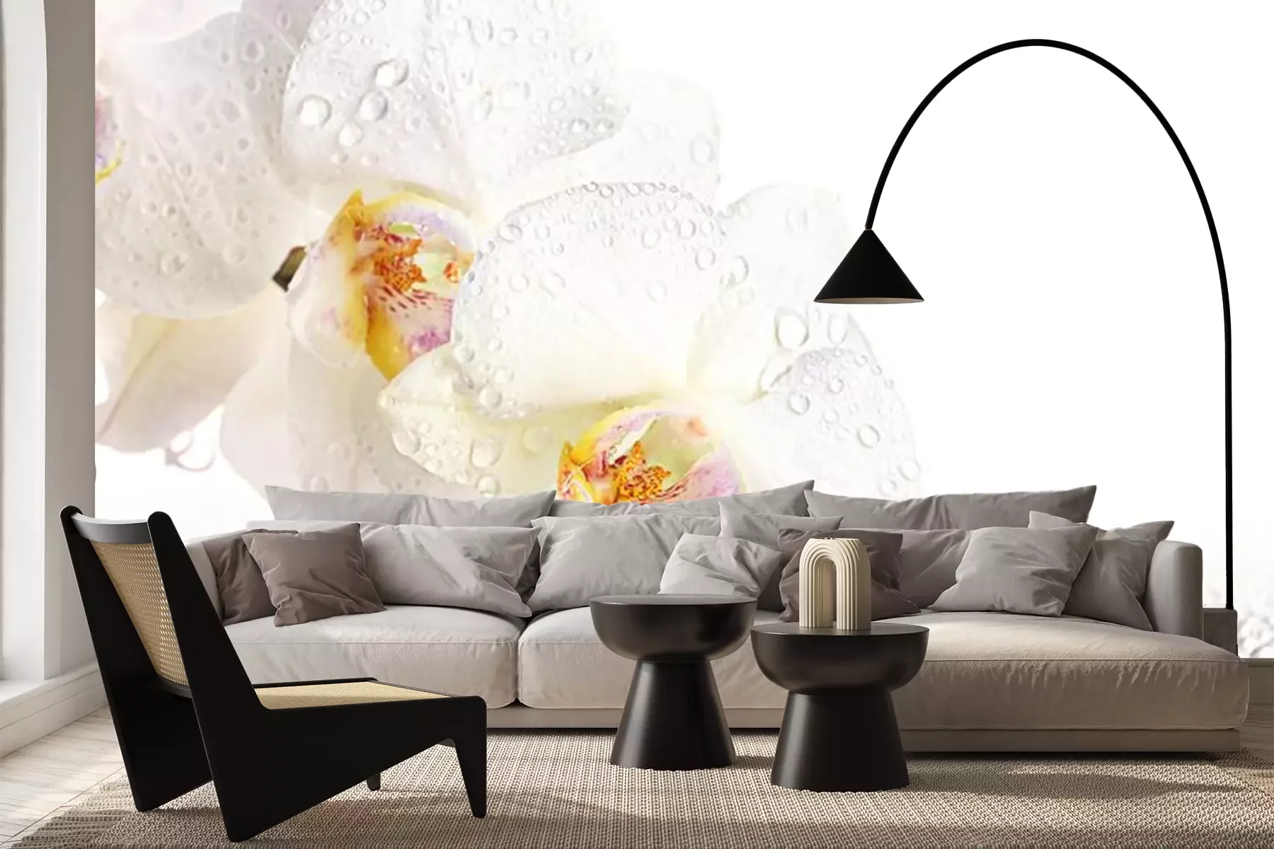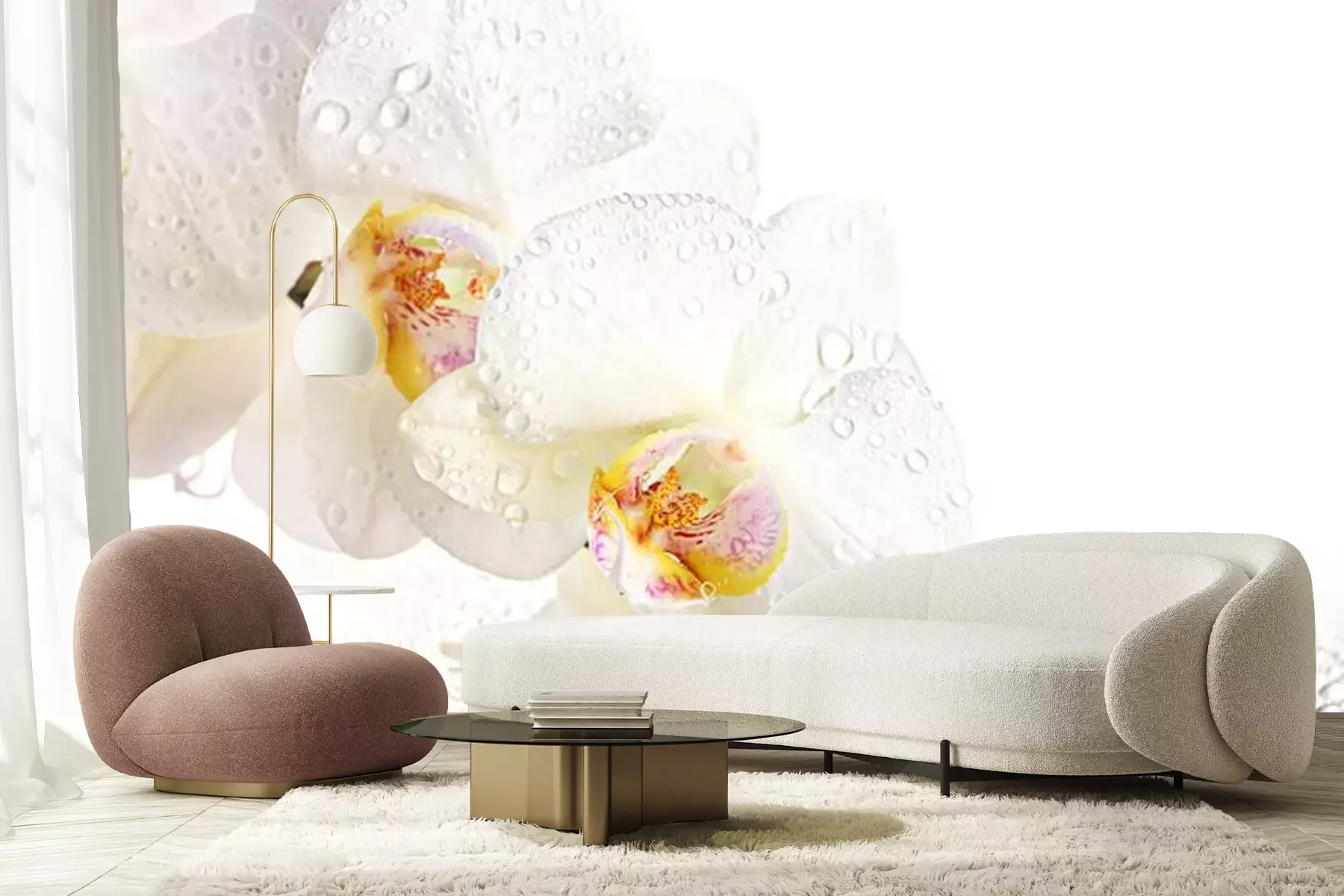 Rosa und weiße Orchideen auf WassertropfenFototapete