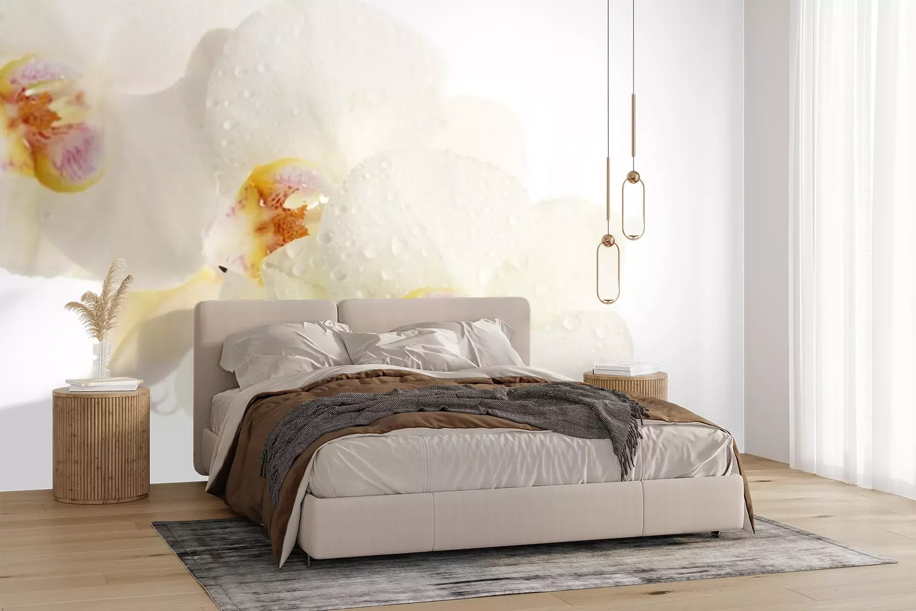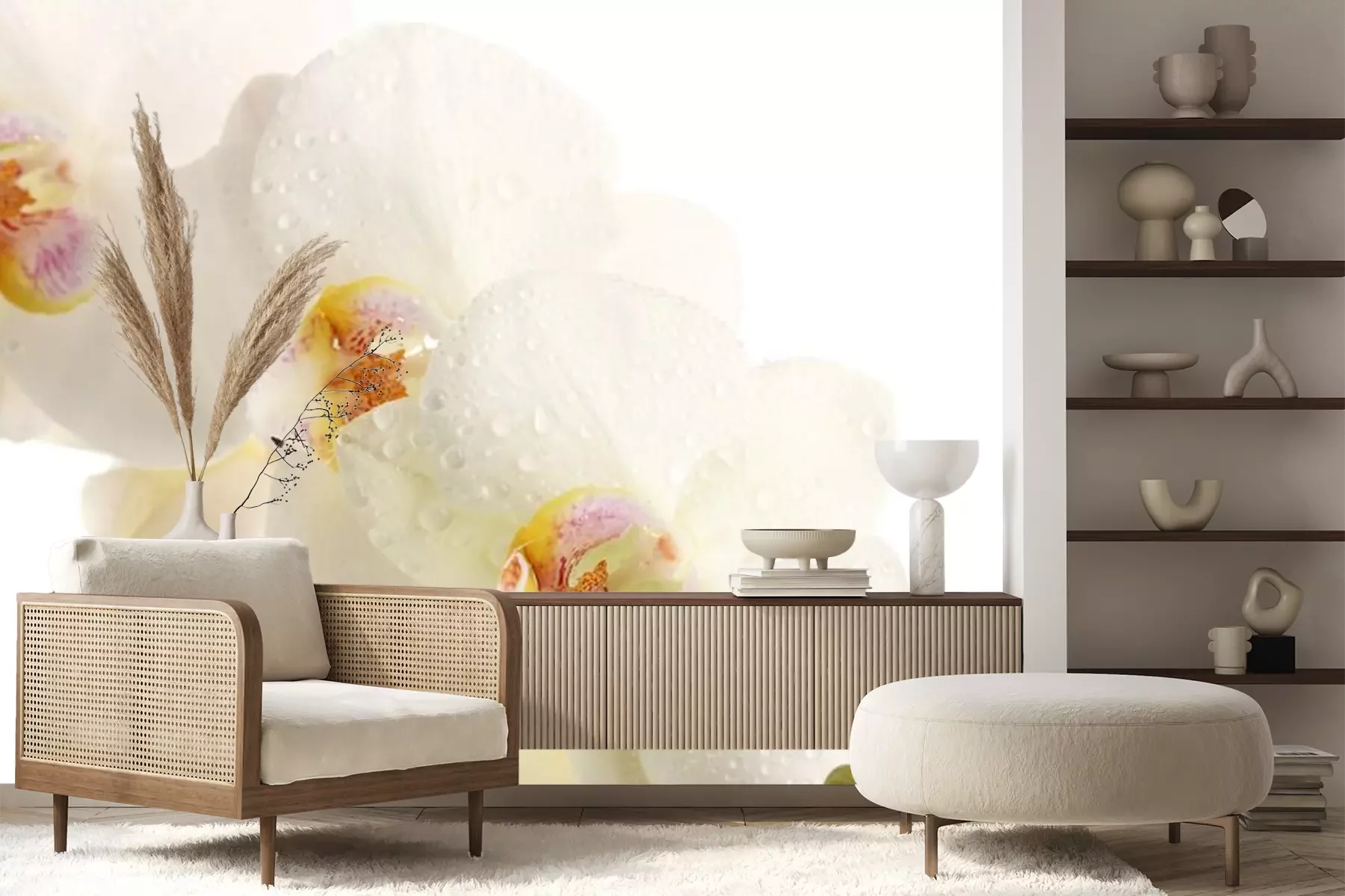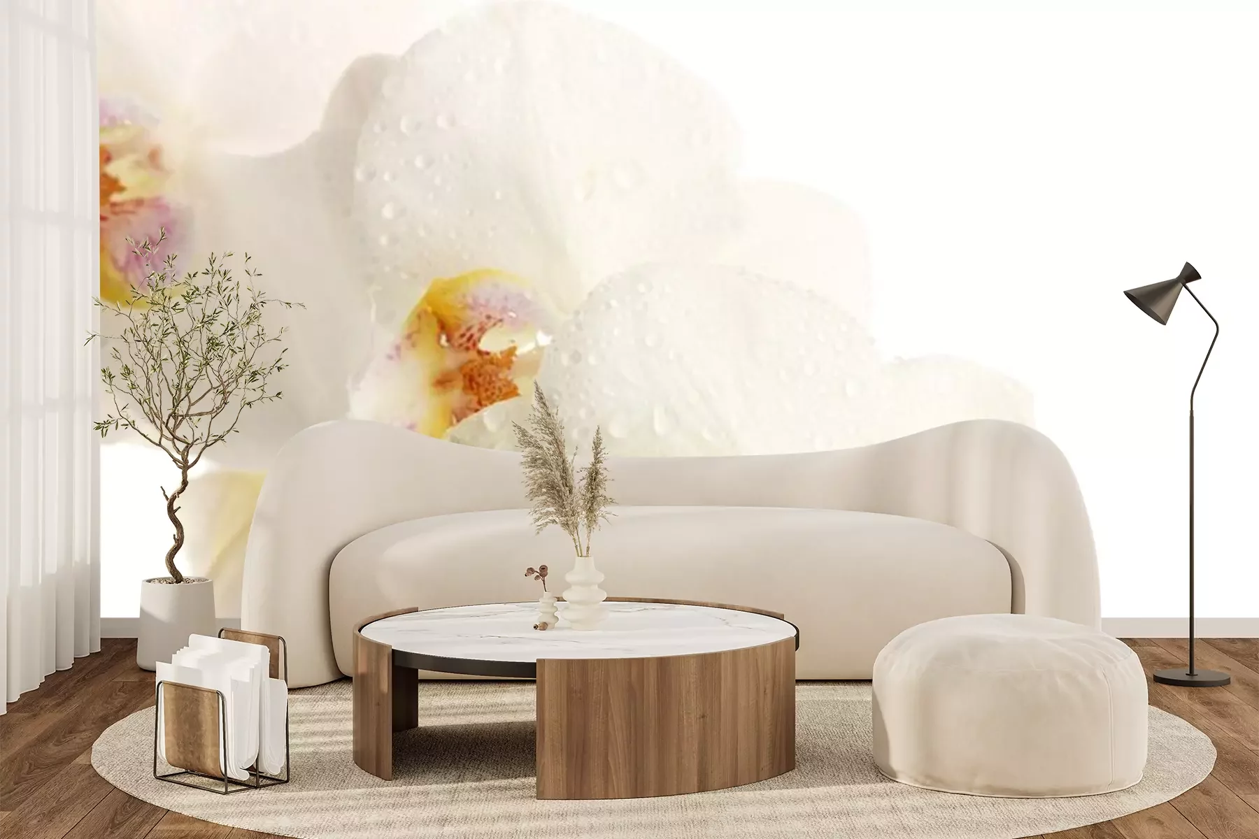 Rosa und weiße Orchideen auf WassertropfenFototapete