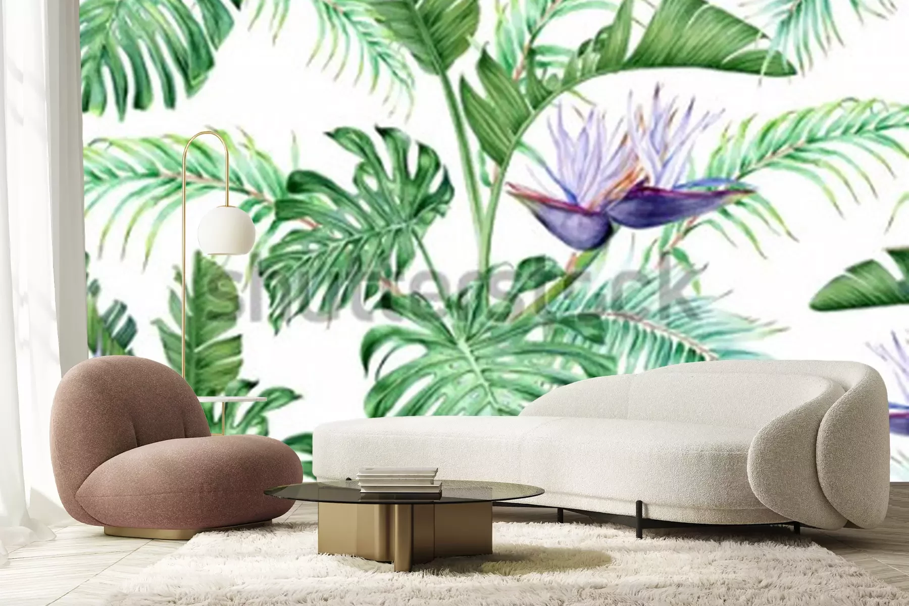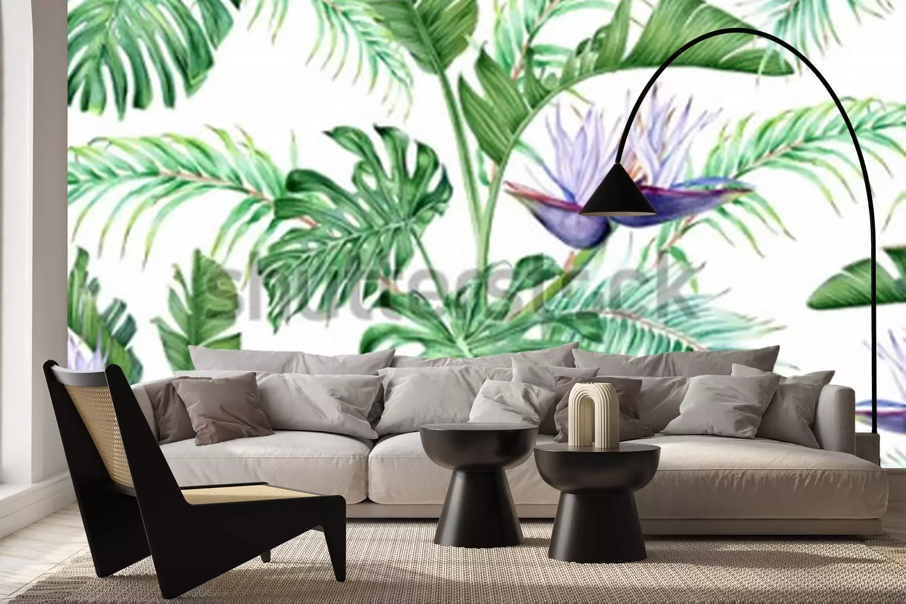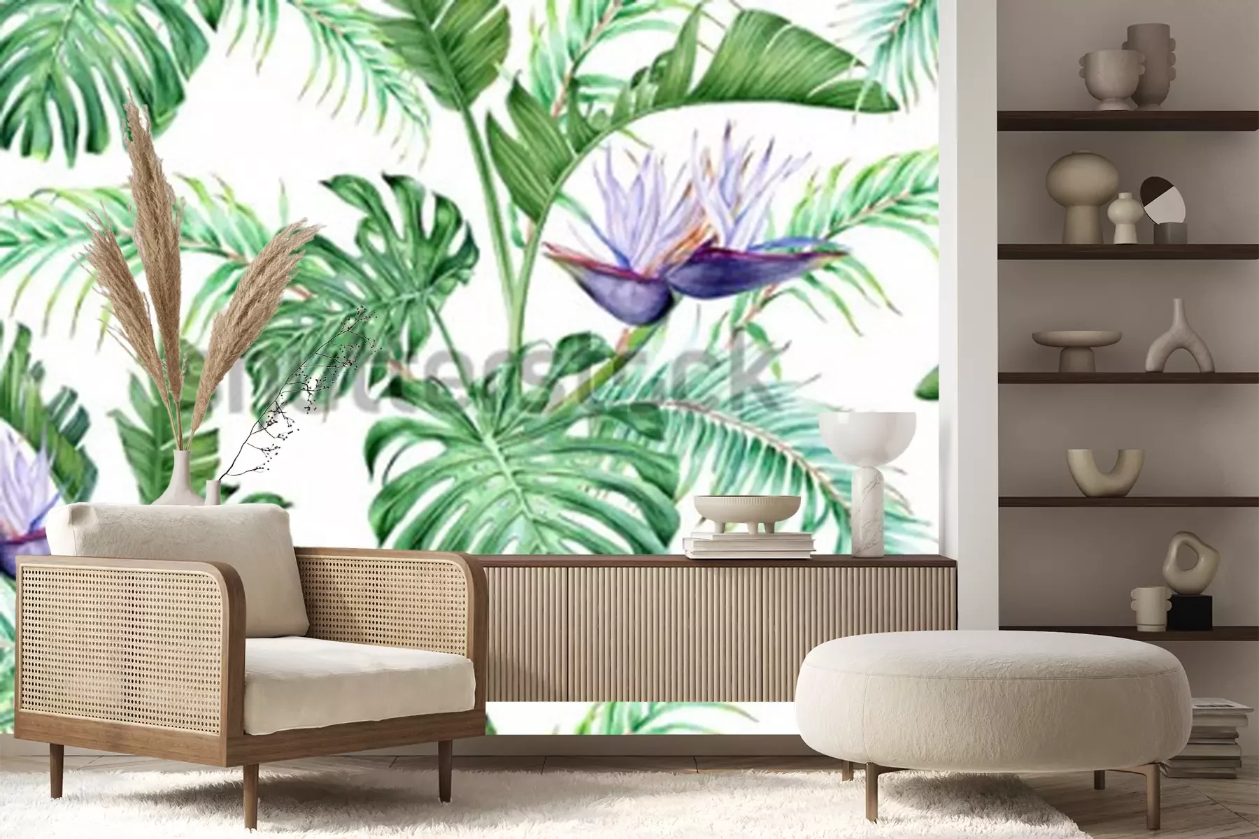 Sticker Weiße Strelitzia und tropische Blätter. Eine seltene exotische Blume. Aquarell nahtlose Muster.