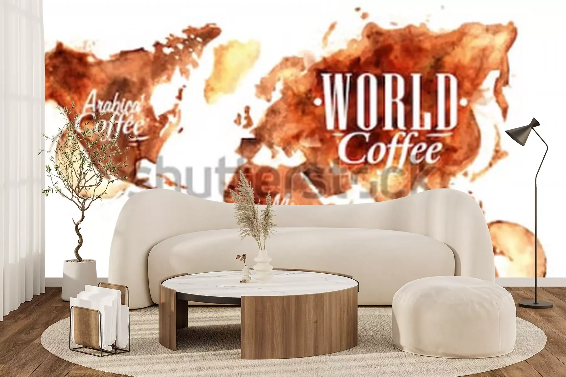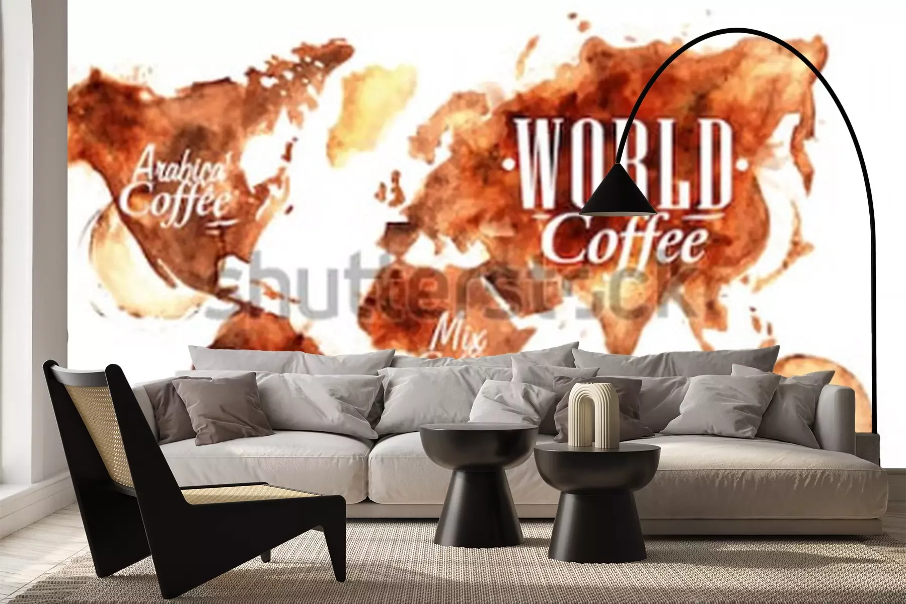 Sticker Weltkarte des gezeichneten Kaffees mit der Aufschrift Arabica, Robusta, mischen mit Spritzern und Flecken druckt Tasse