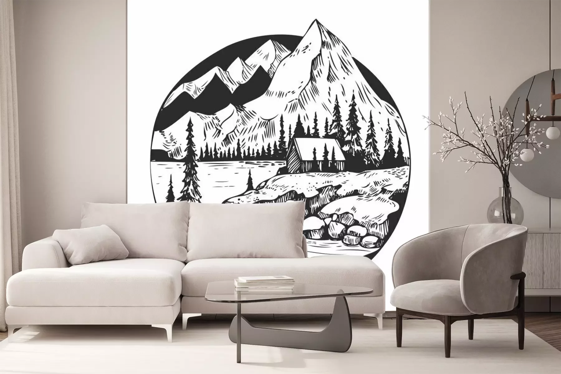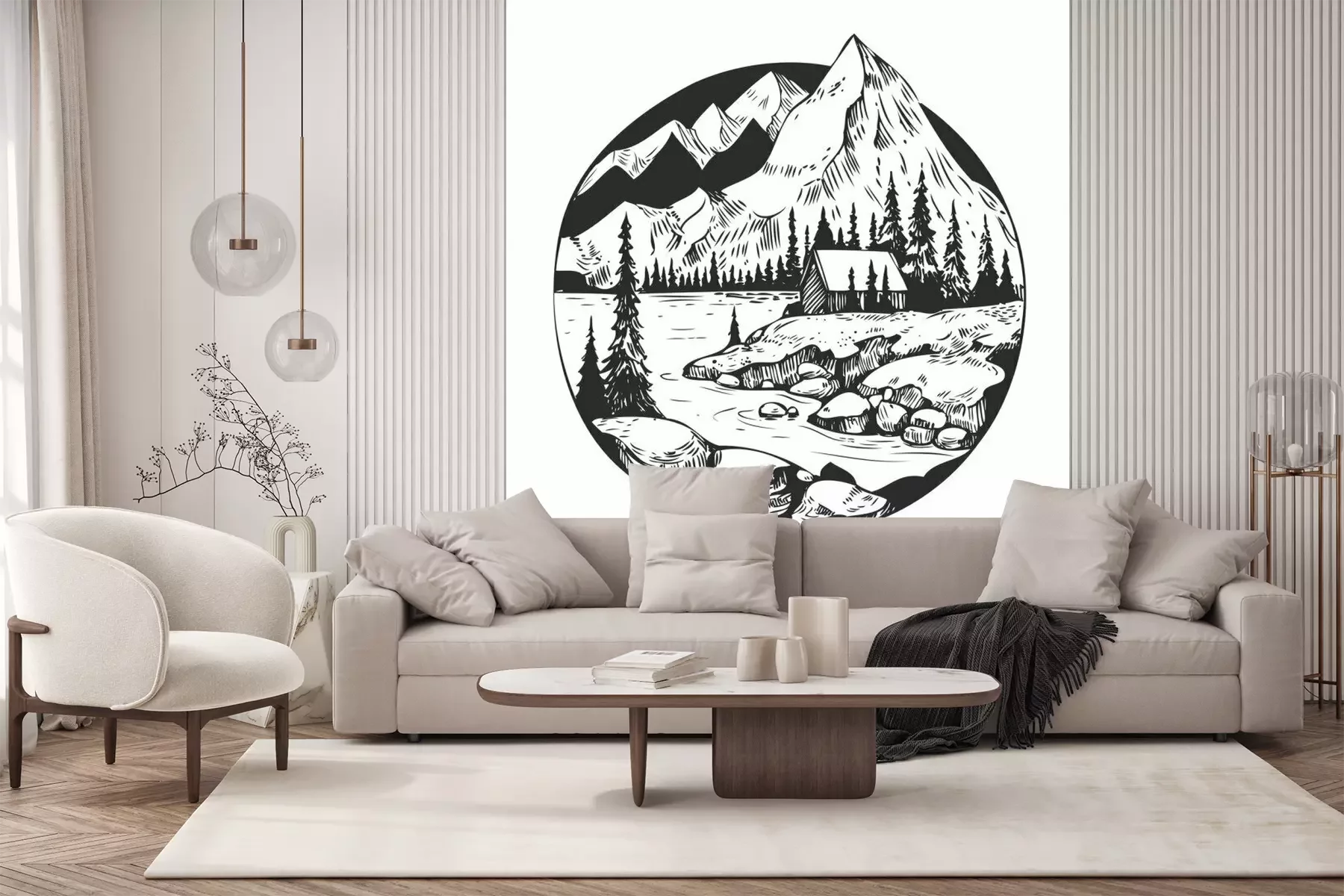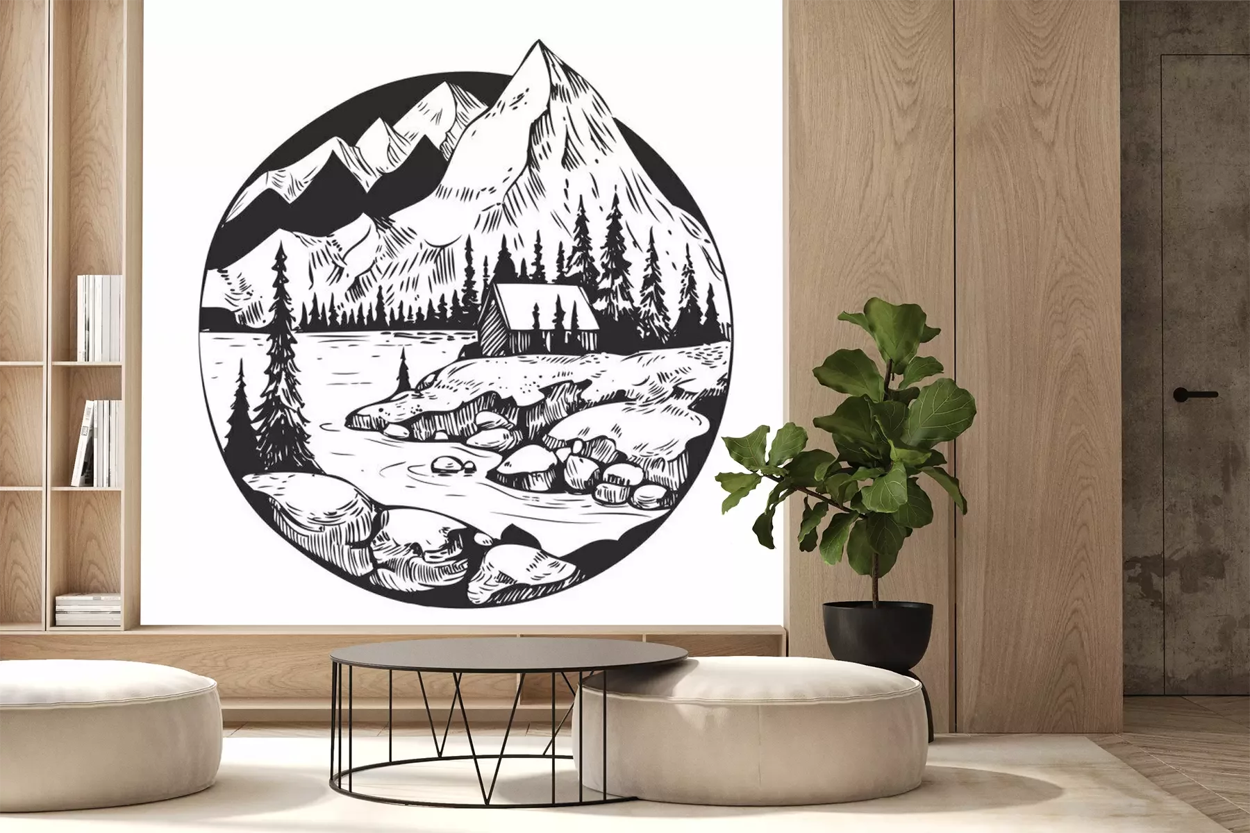 Sticker Wild natural landscape with mountains, lake, pines, rocks. Hand drawn illustration converted to vector.
