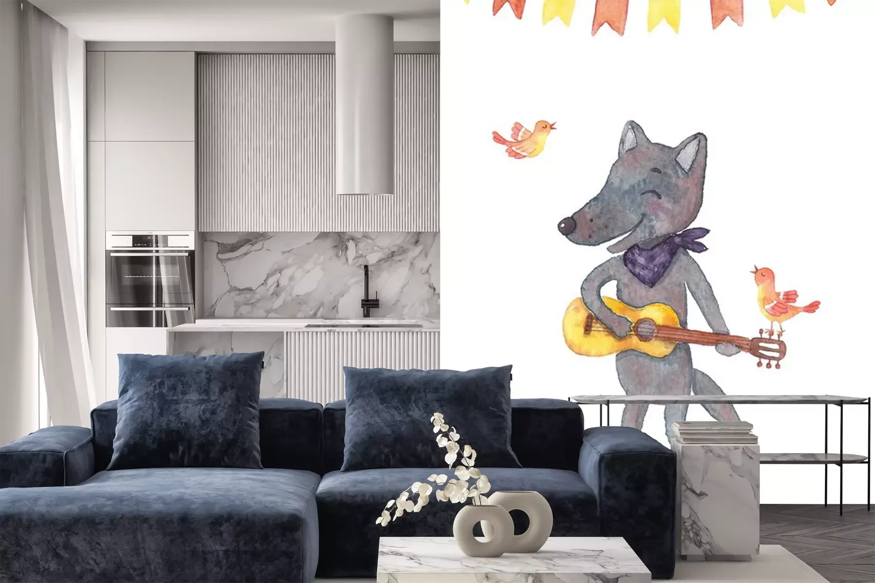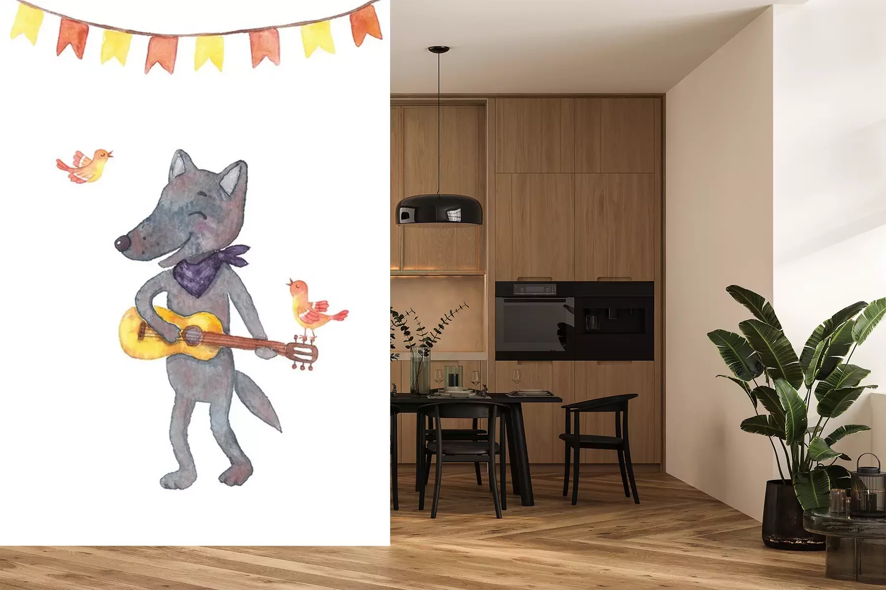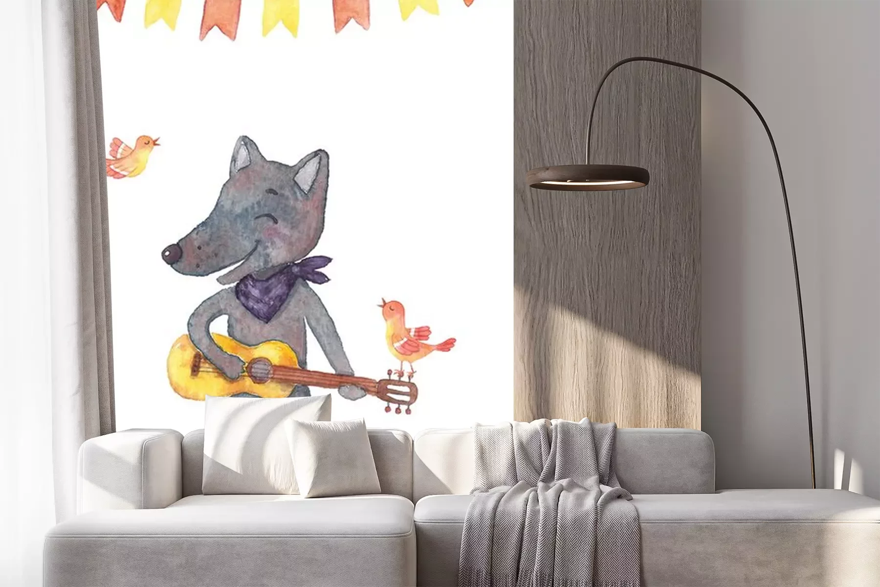 Sticker Wolf Aquarell mit einer Gitarre in seinen Pfoten und Vögel