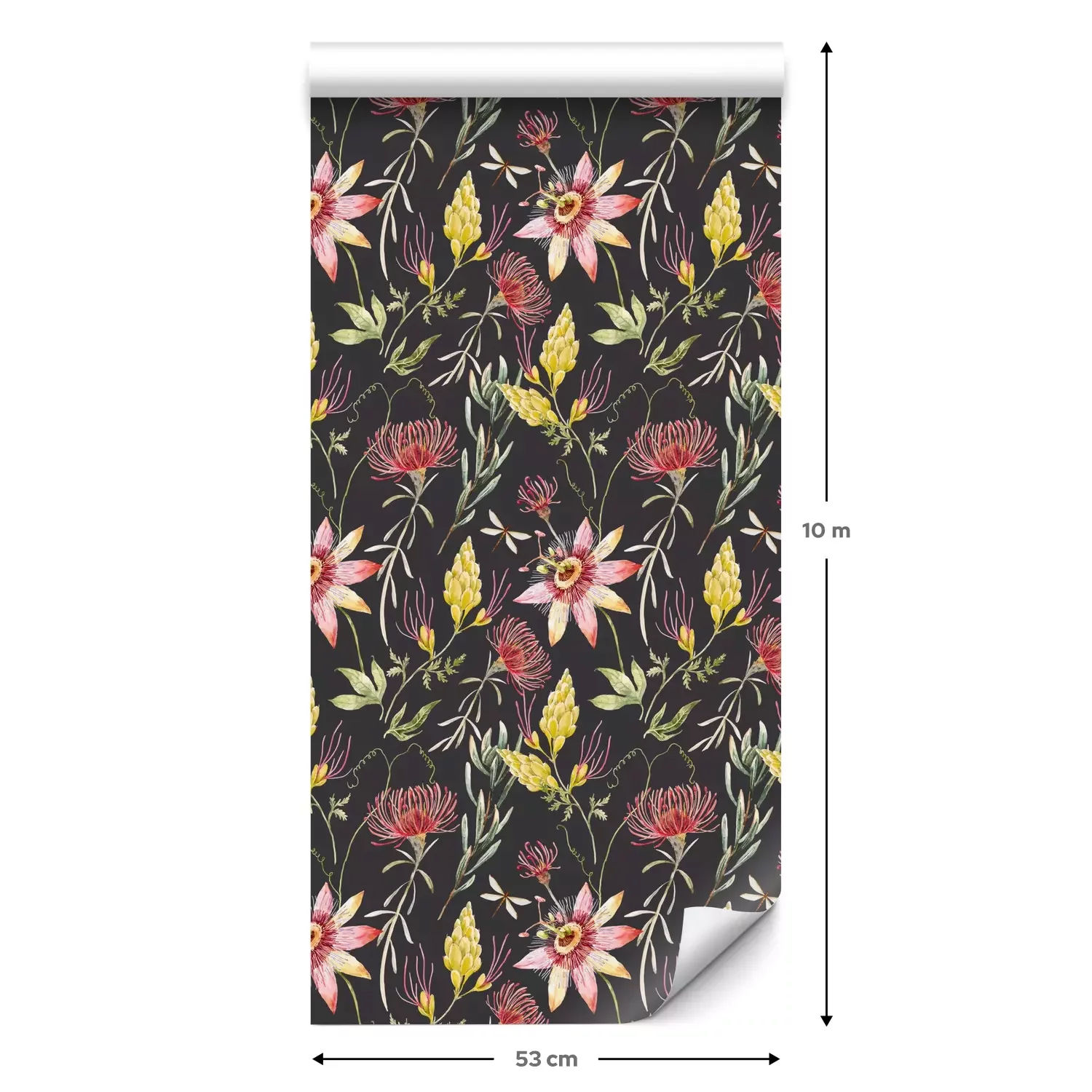Eine Standard-Tapetenrolle hat die Maße 0,53 m x 10 m und deckt eine Wandfläche von etwa 5 m² ab.