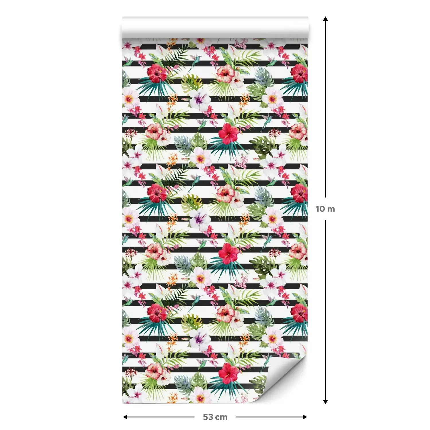 Eine Standard-Tapetenrolle hat die Maße 0,53 m x 10 m und deckt eine Wandfläche von etwa 5 m² ab.