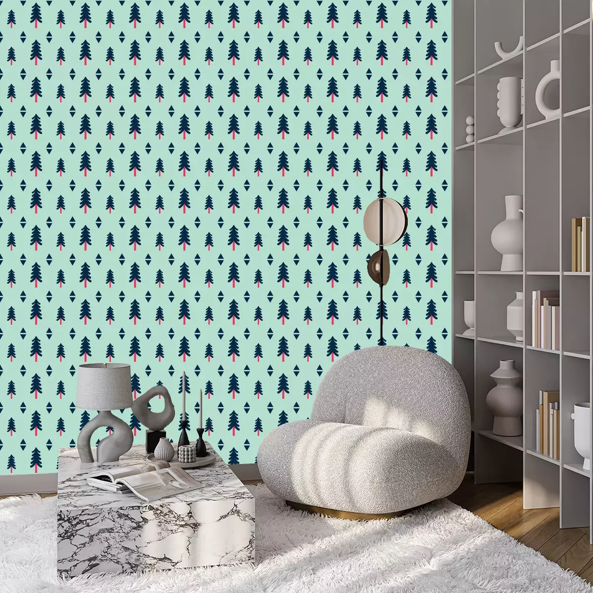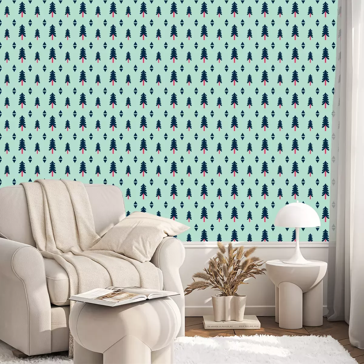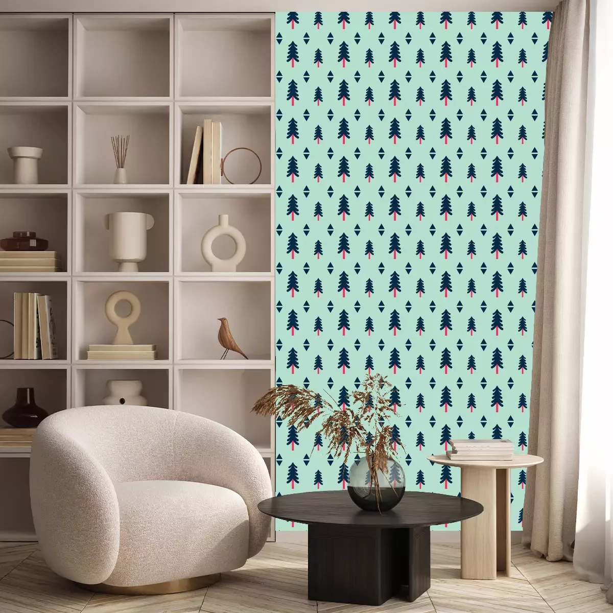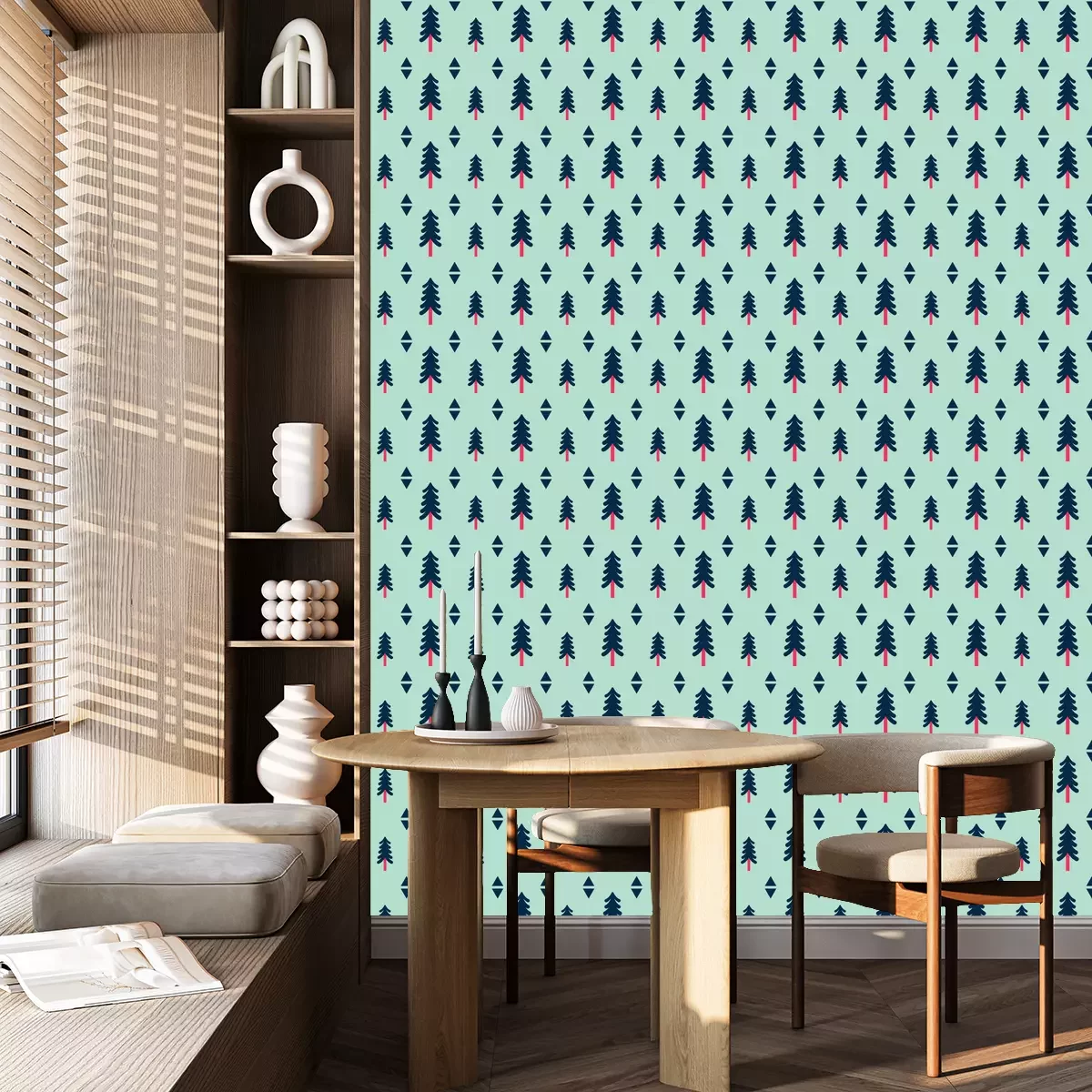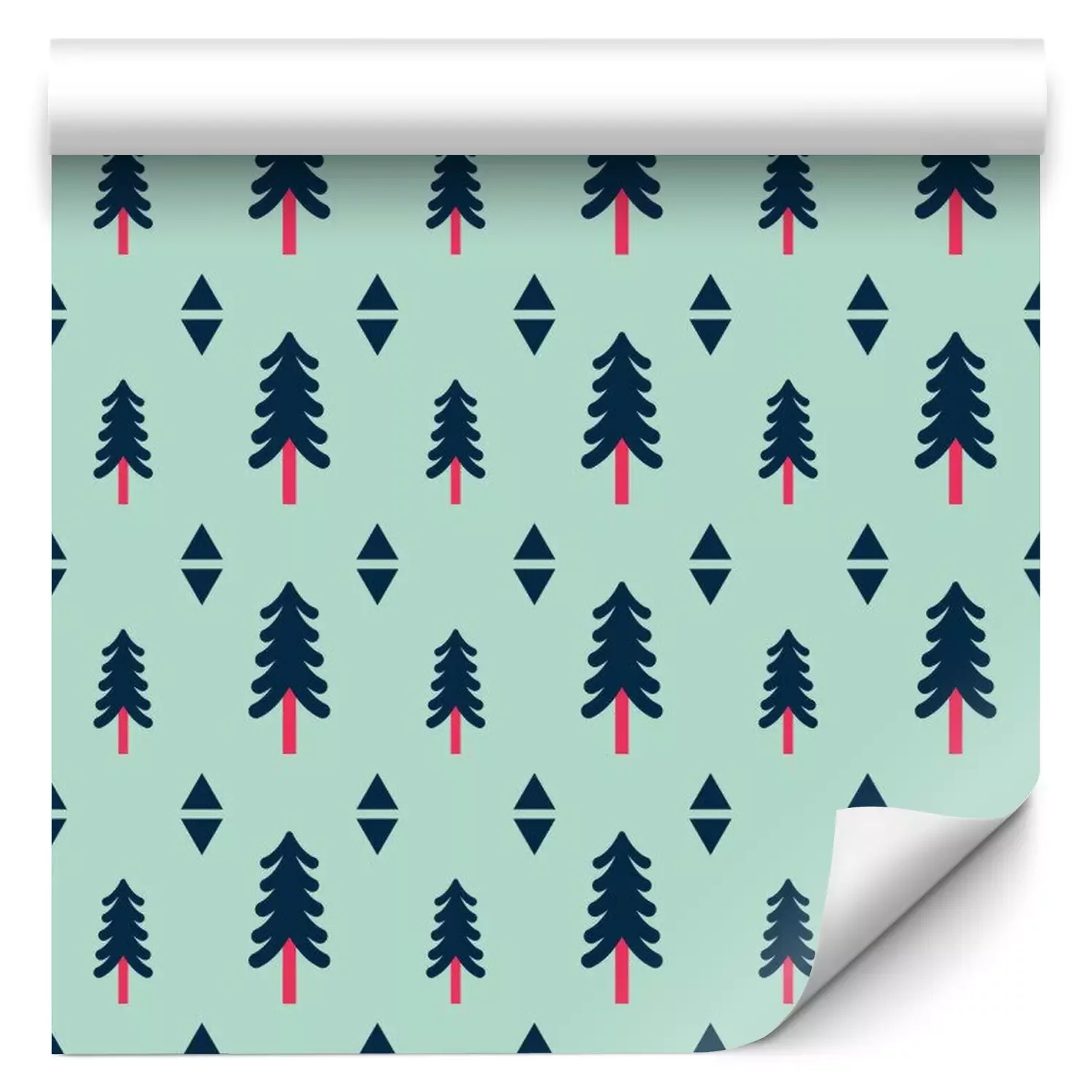 Tapete Bäume und geometrische Formen auf grünem Hintergrund
